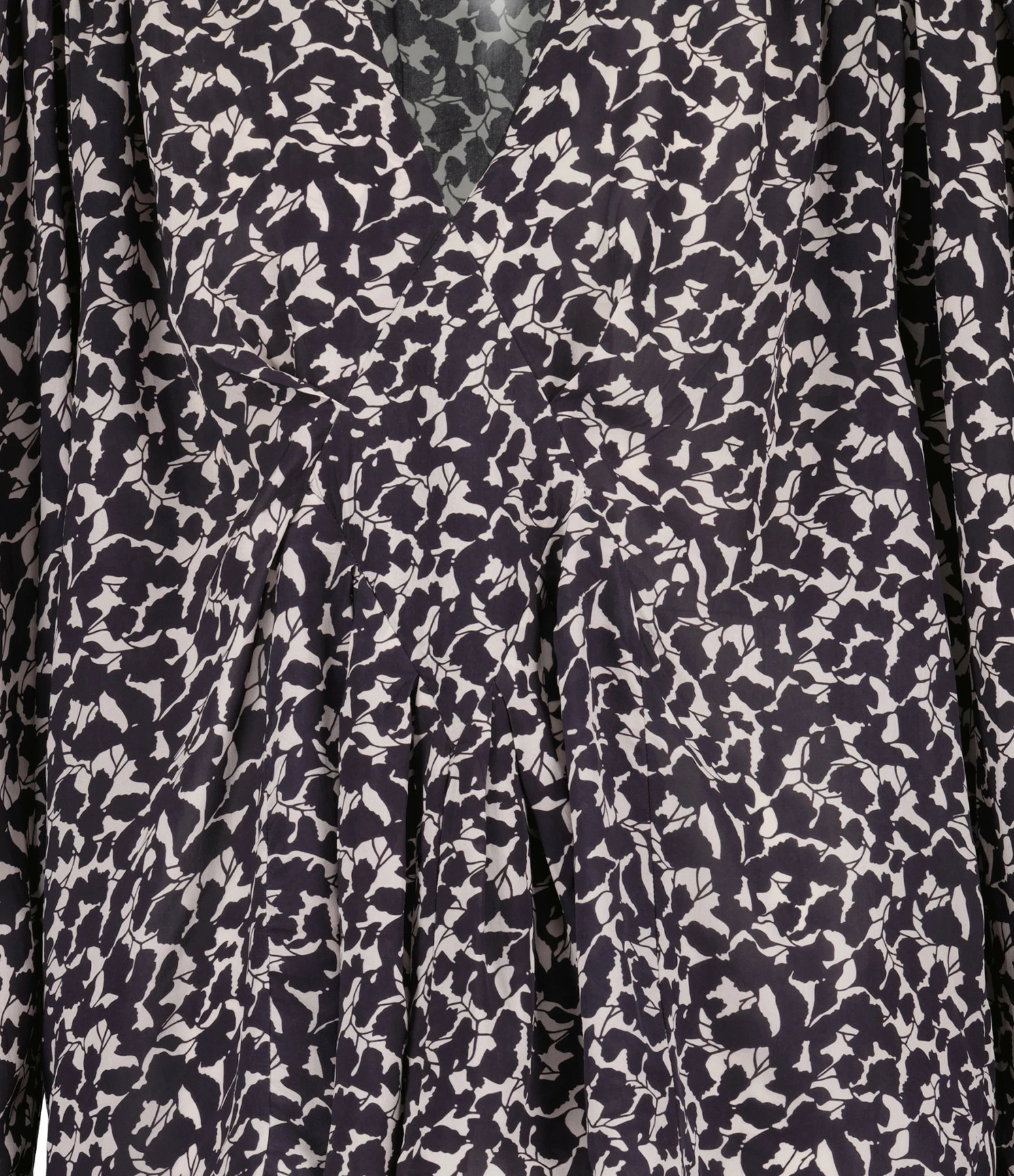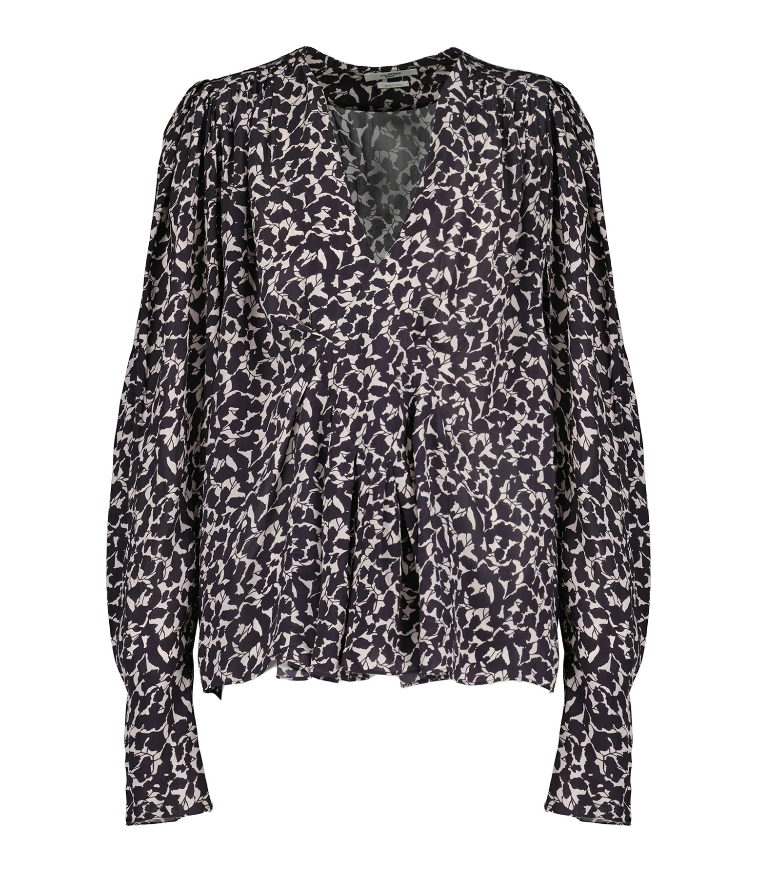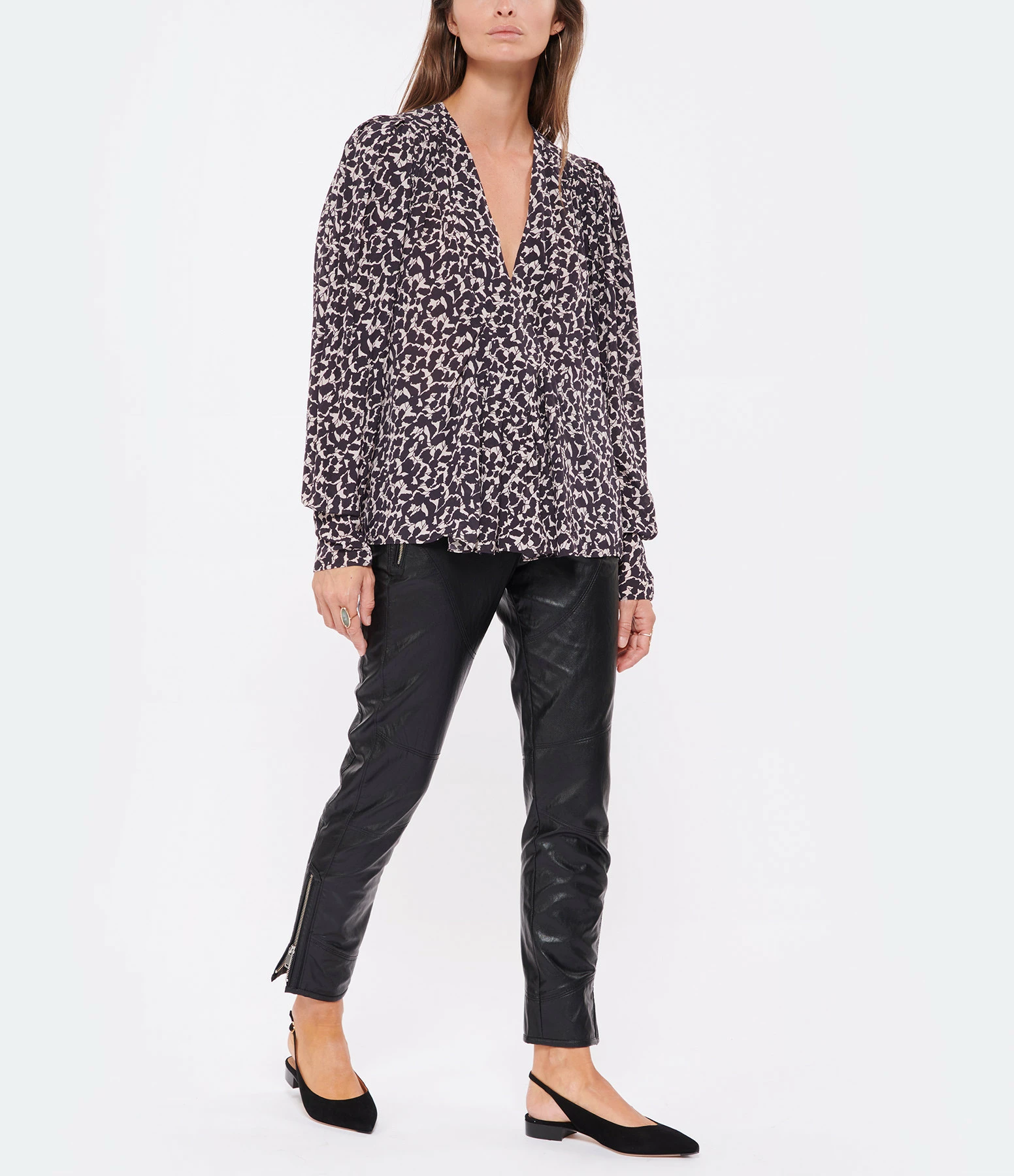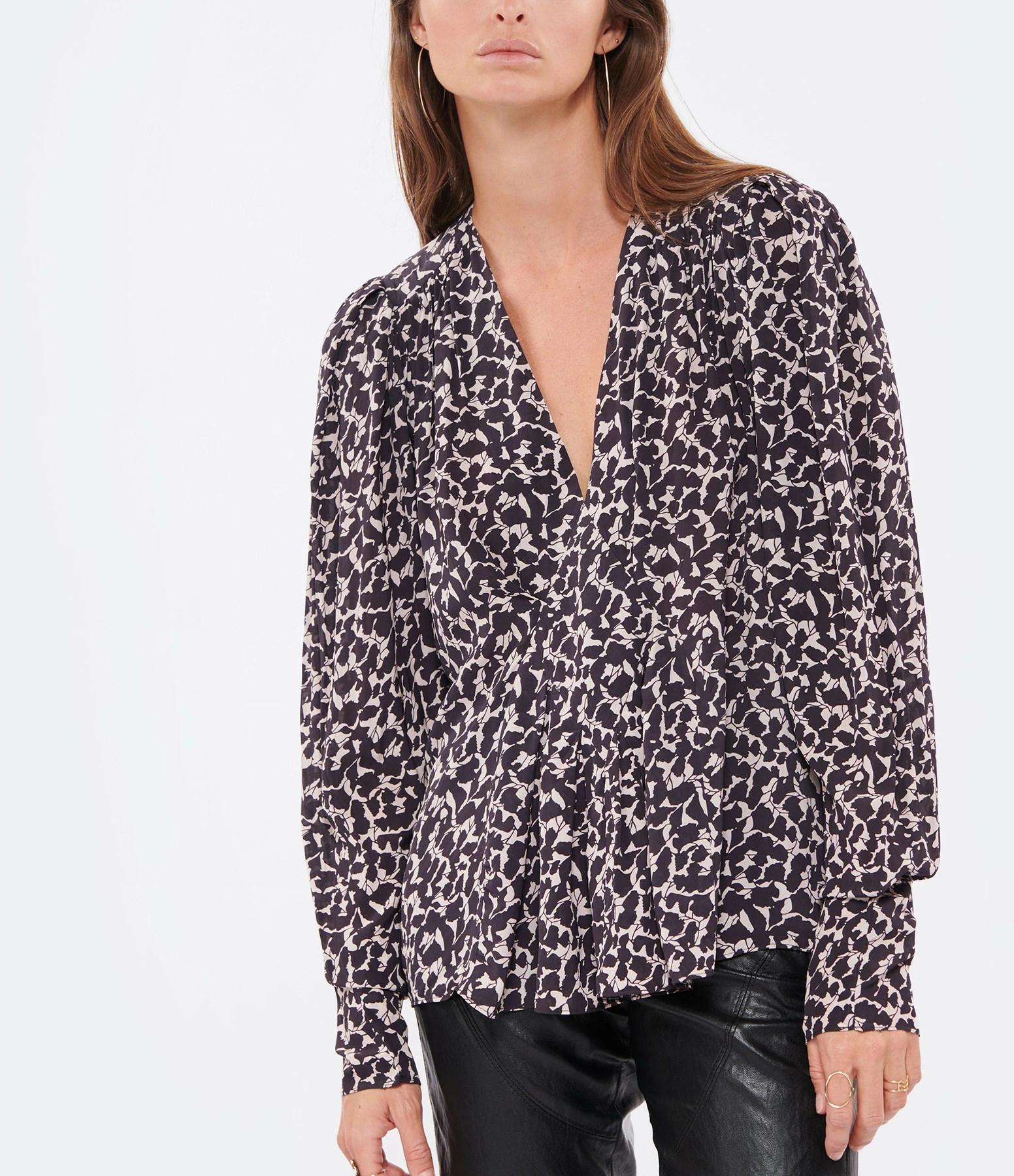 Blouse à imprimé fleuri noir écru. Col en V. Manches longues gigot. Détails de fronces sur le devant. Coupe droite ample. Base droite. Non doublée.