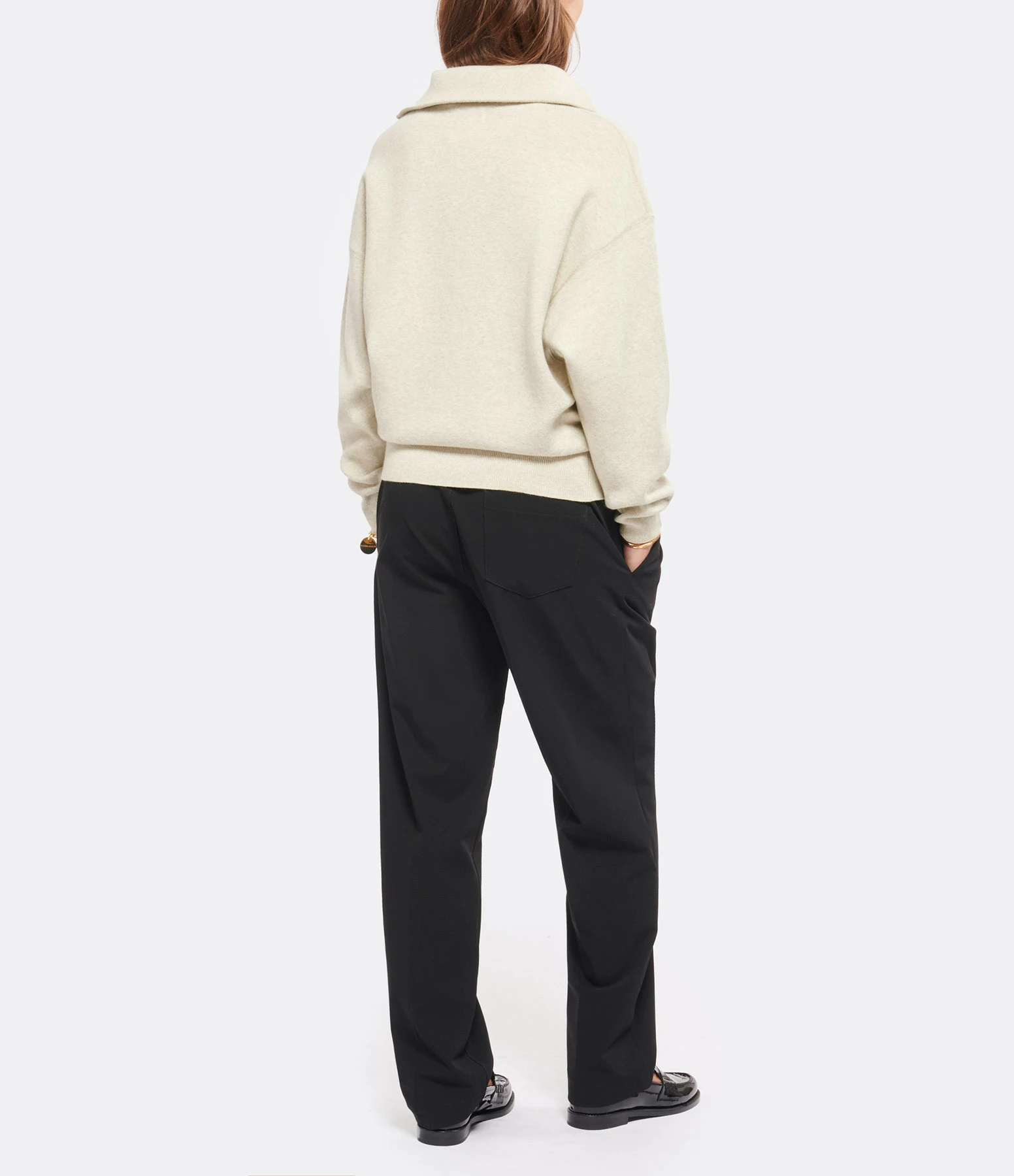 Pull en coton gris clair. Col montant zippé. Manches longues. Logo noir sur la poitrine. Coupe droite. Base droite.