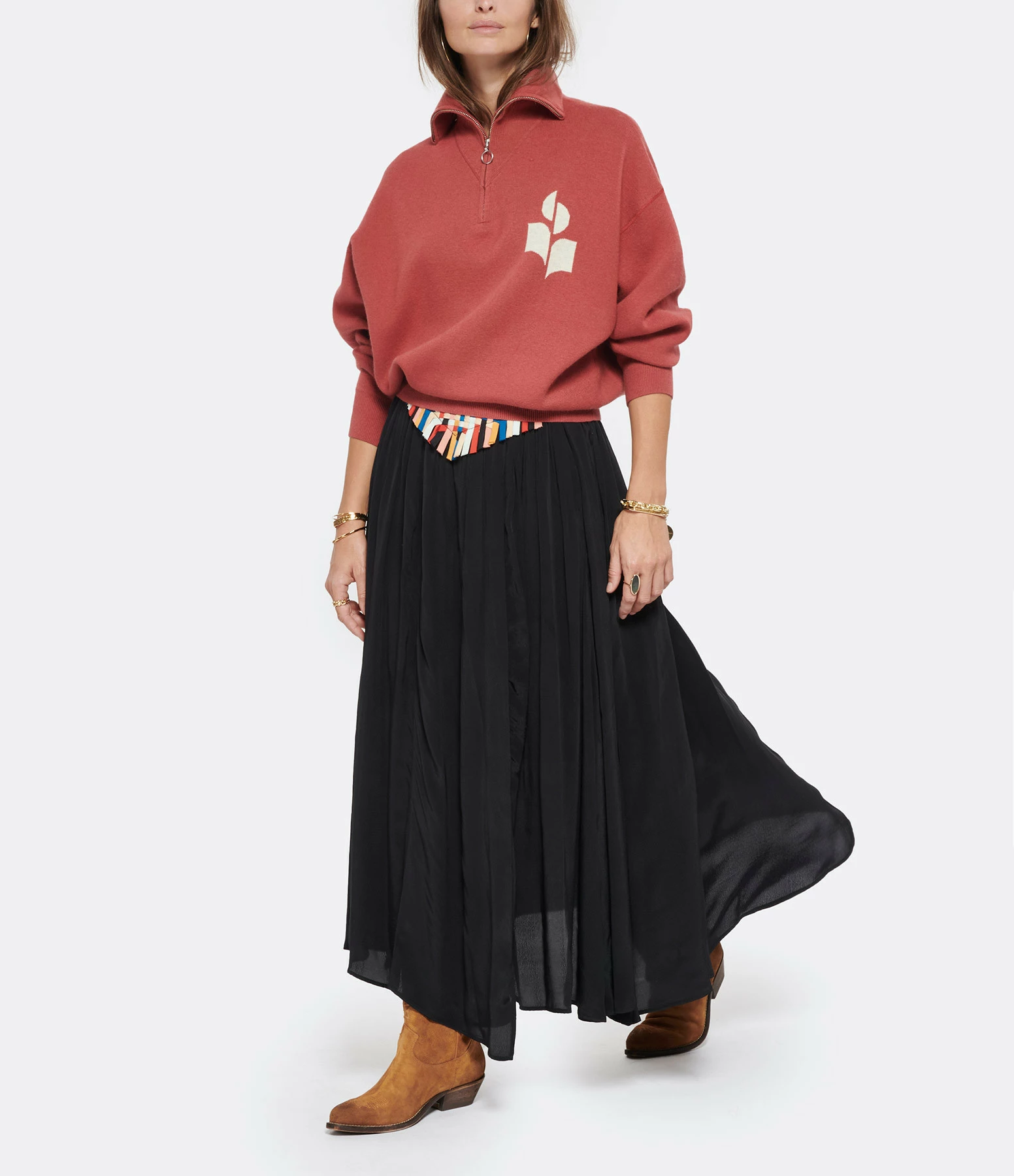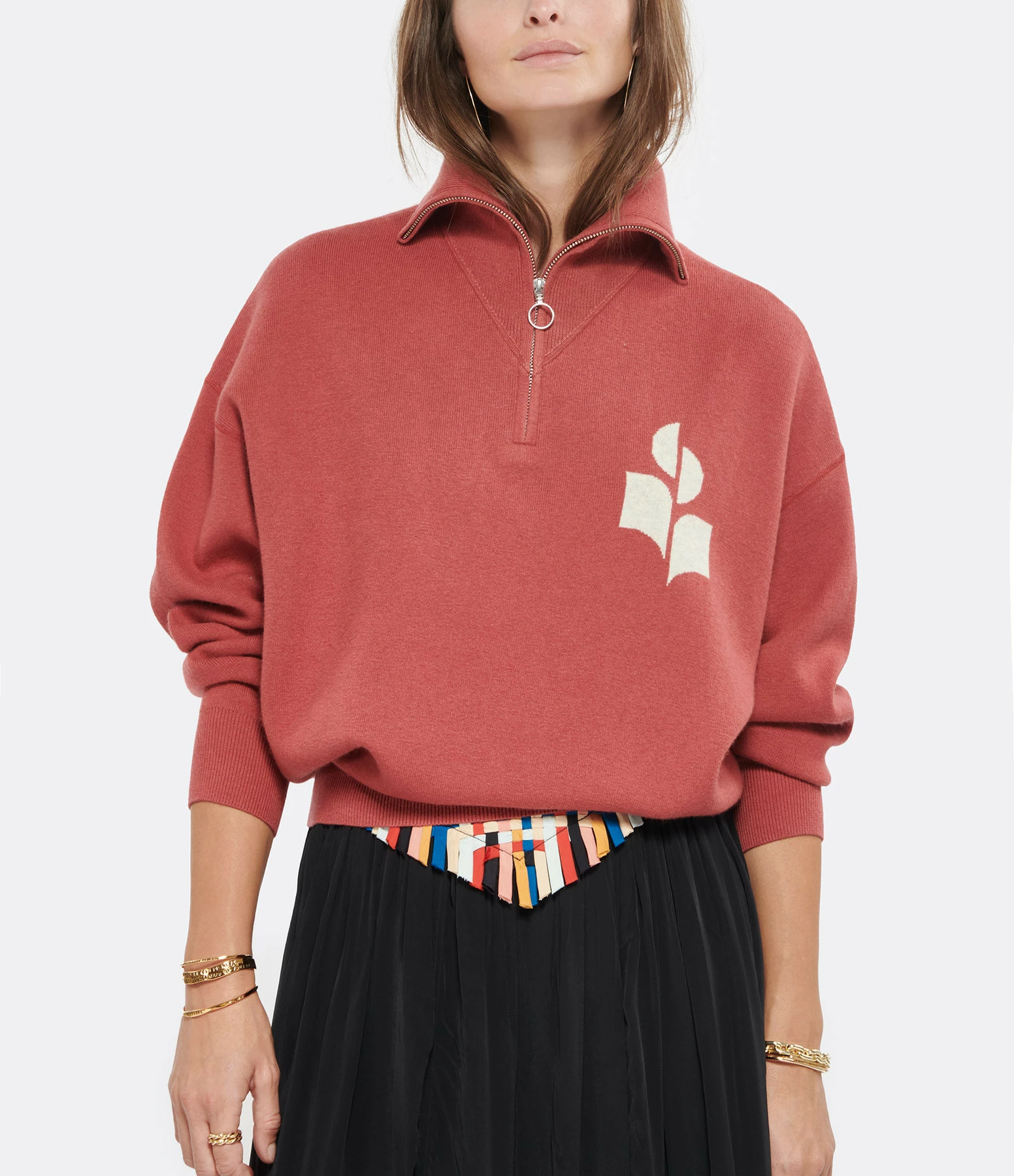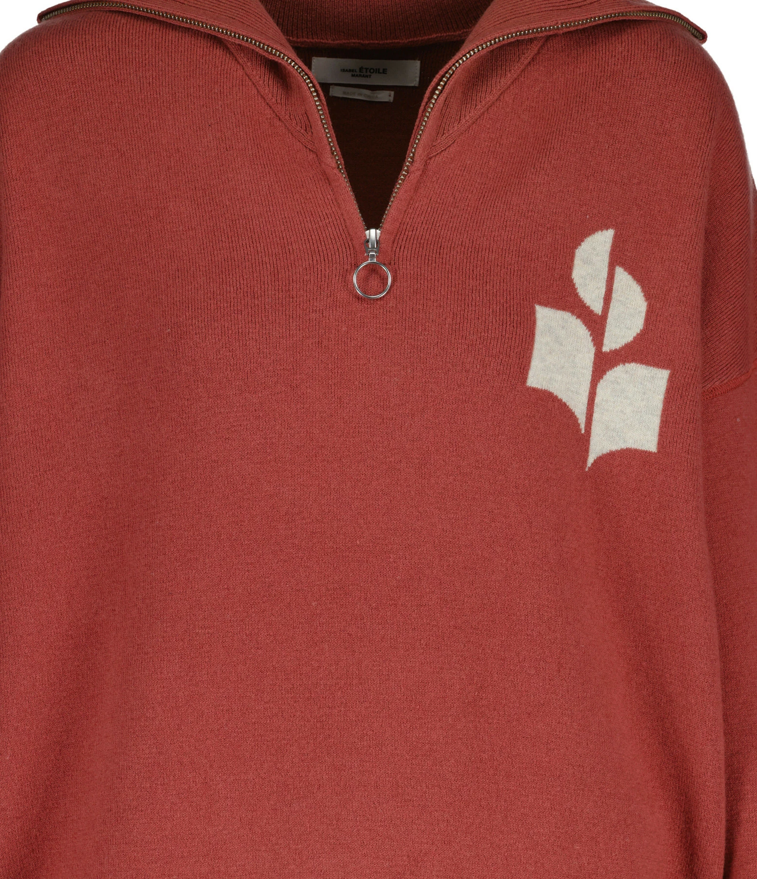 Pull en coton cuivre. Col montant zippé. Manches longues. Logo écru sur la poitrine. Coupe droite. Base droite.
