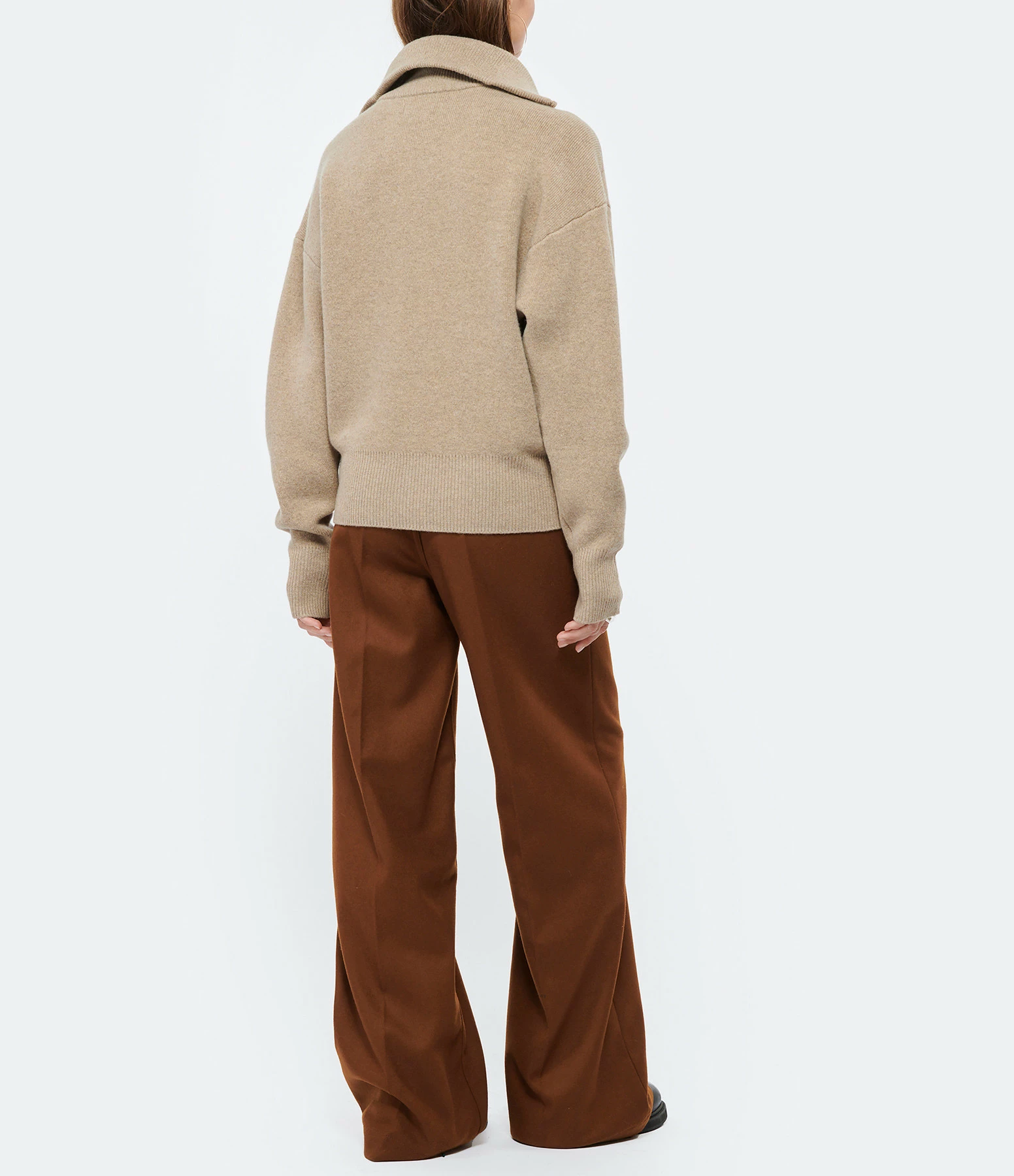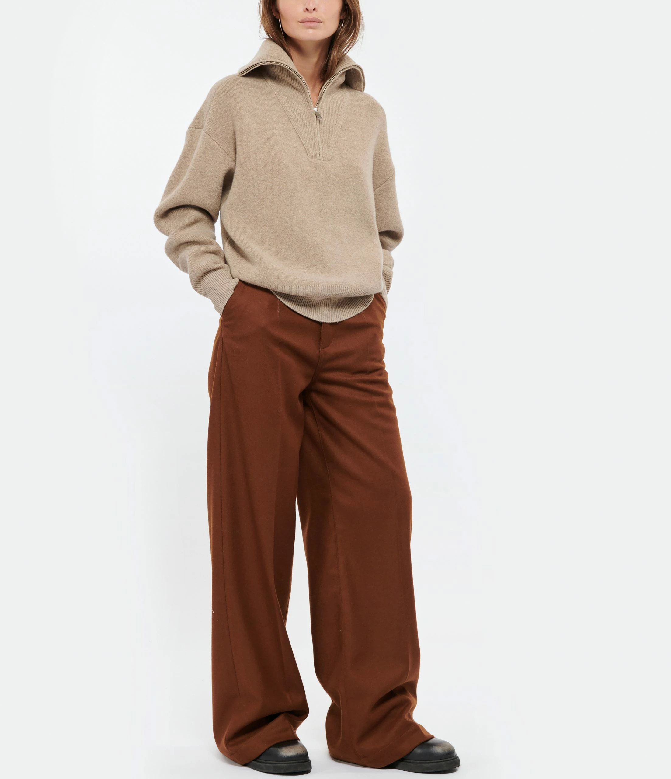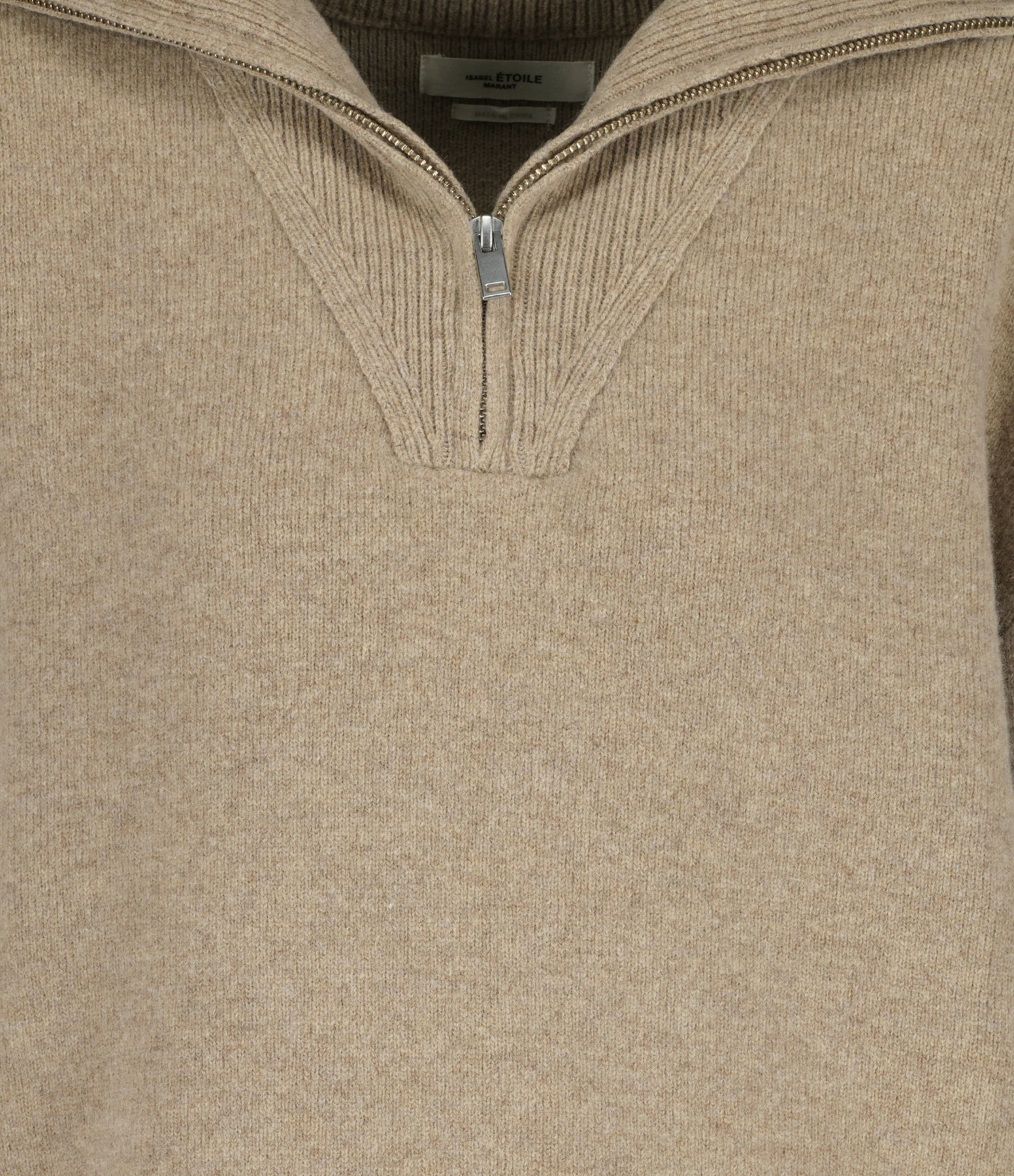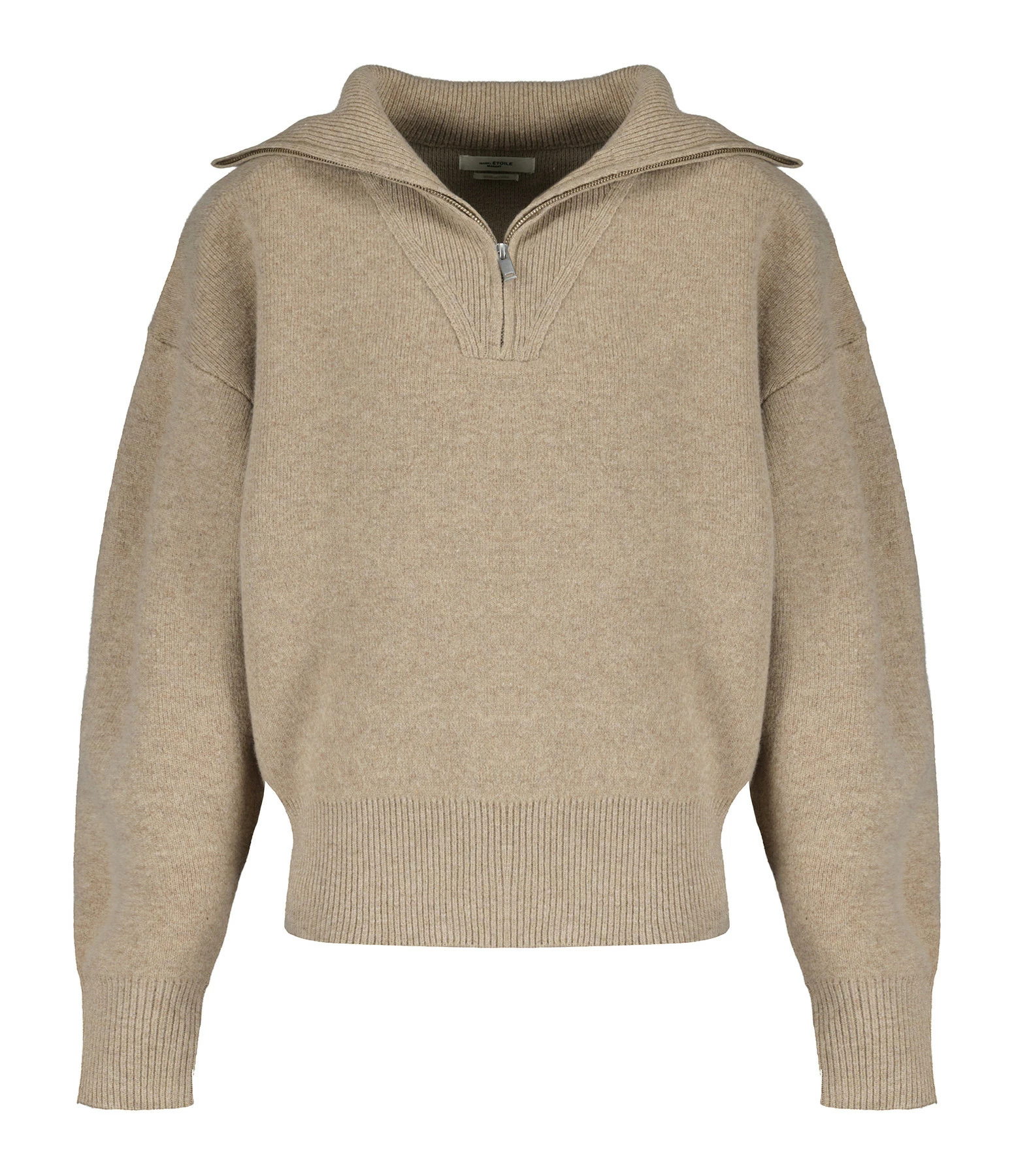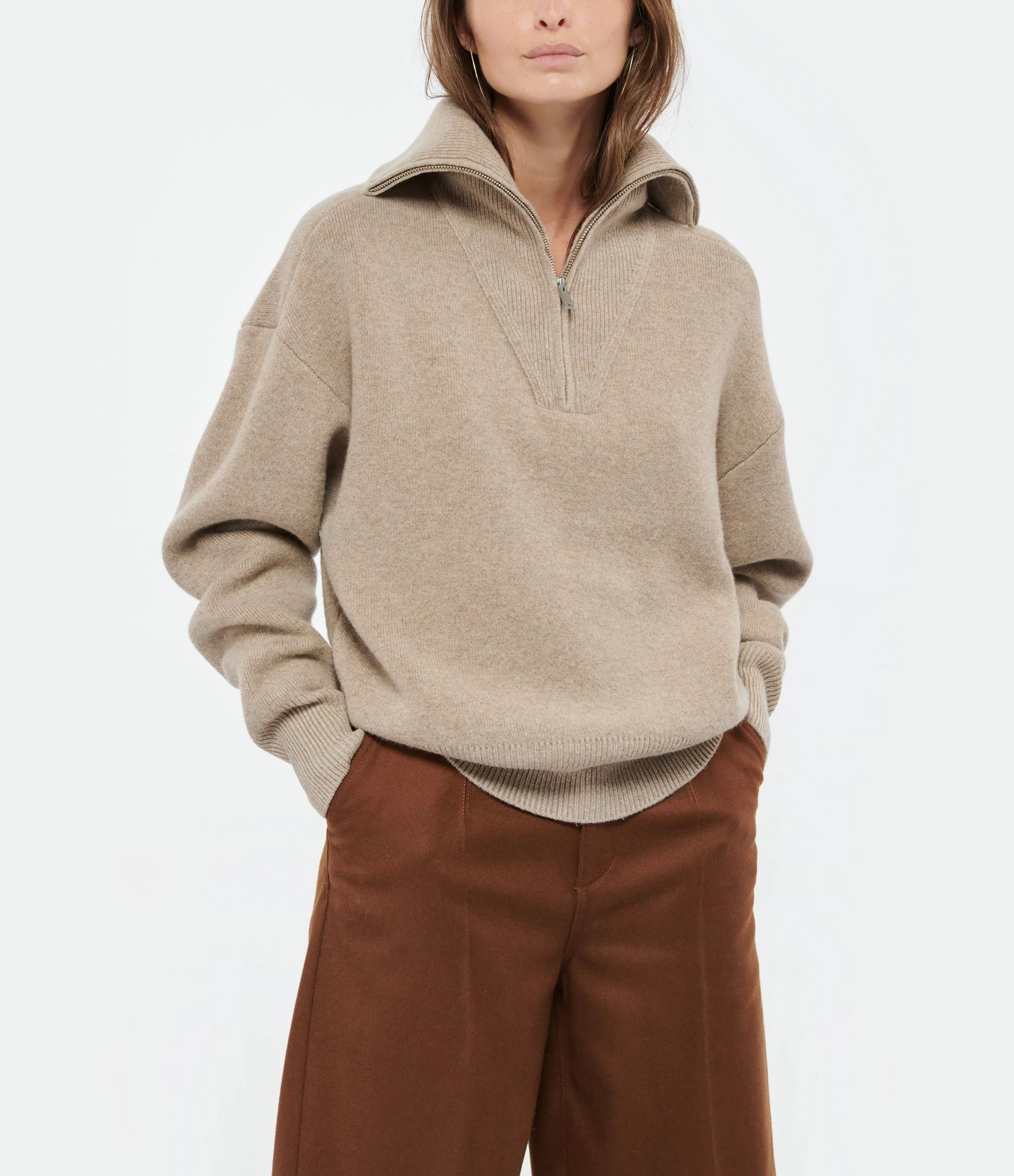 Pull en maille de laine mélangé beige. Col montant zippé et côtelé. Manches longues avec poignets côtelés. Coupe ample. Base droite côtelée.