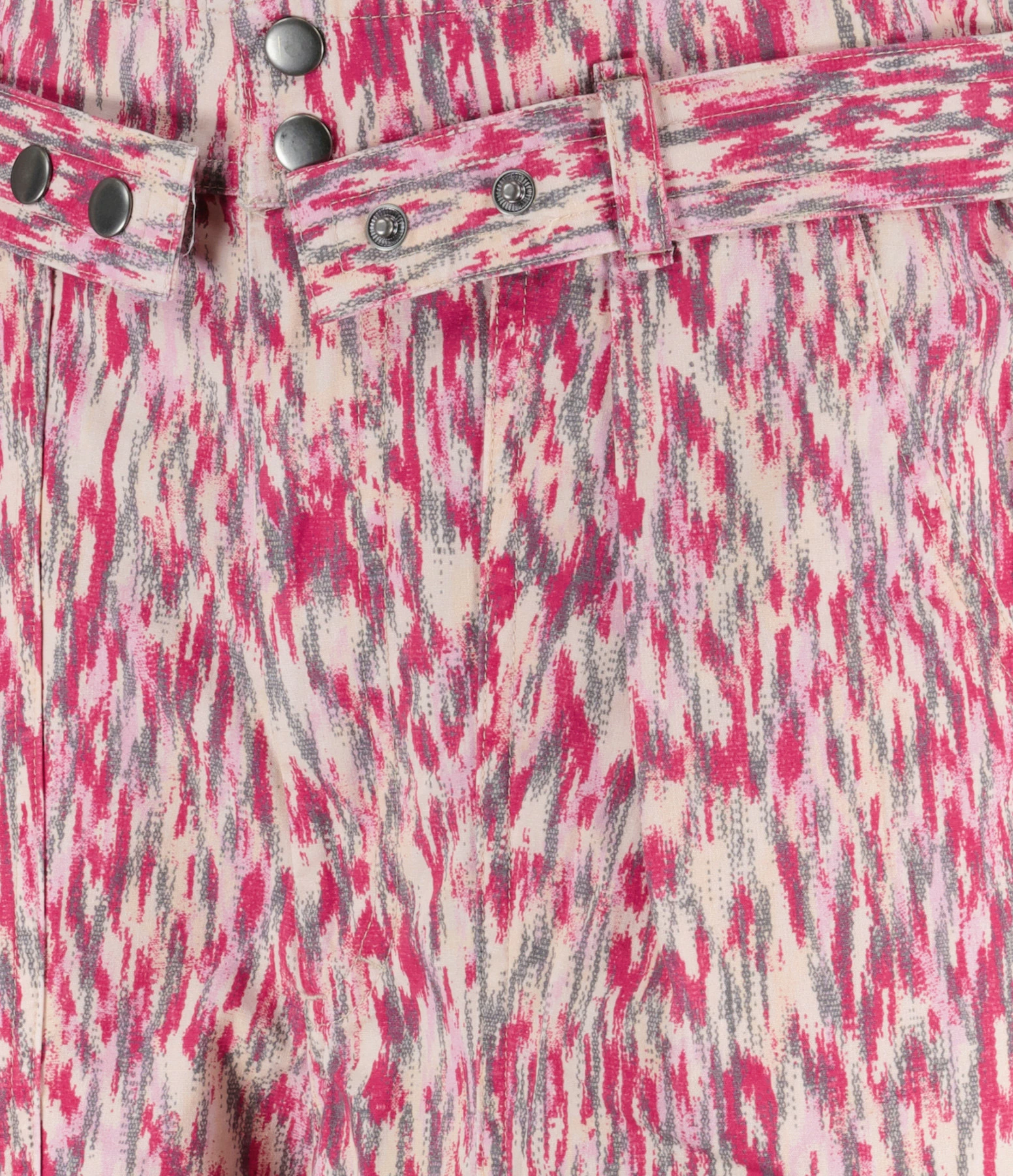 Short en coton imprimé dans des tons framboise. Taille haute avec ceinture amovible. Passants pour ceinture. Braguette zippée et pressionnée. Boutons pressions en métal argent. Deux poches italiennes. Deux poches plaquées pressionnées dans le dos. Sangles beiges sur les côtés. Coupe cintrée ample. Base droite. Ourlet roulé. Doublé en coton blanc.