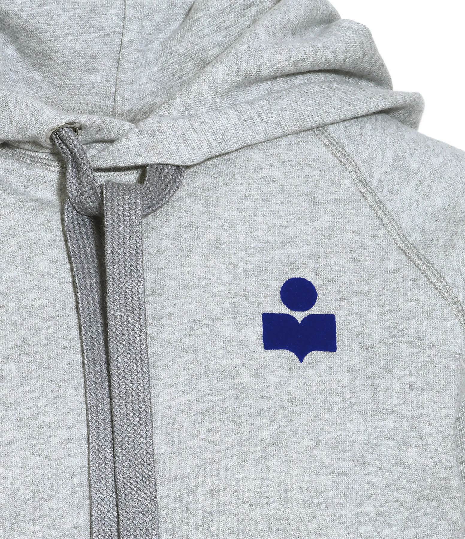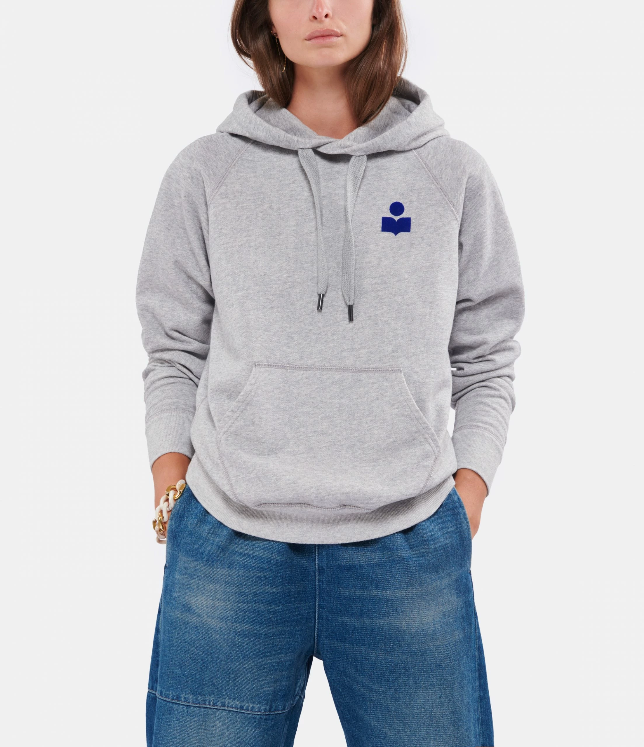 Sweatshirt en coton gris. Col avec capuche et liens de resserrage. Une poche à l’avant. Logo en velours bleu coté cœur. Manches longues. Base droite. Non doublé.