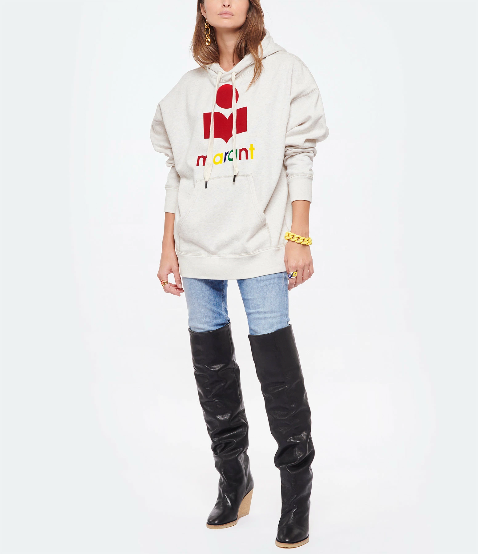 Sweatshirt en coton molletonné écru. Col rond à capuche avec liens de resserrage. Logo “Marant” flocké. Manches longues avec poignet côtelé. Poche kangourou sur le devant. Coupe ample. Base droite côtelée.