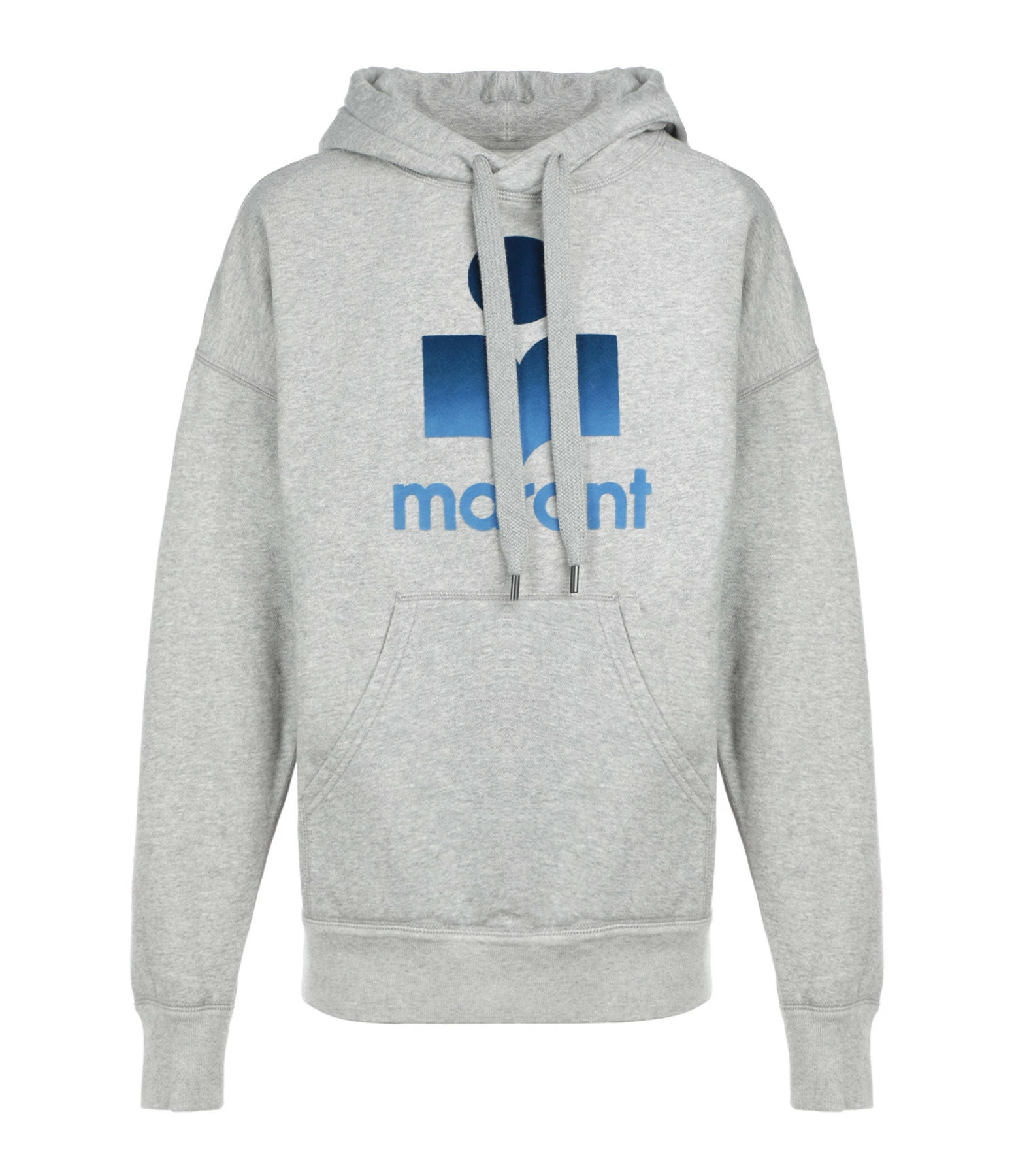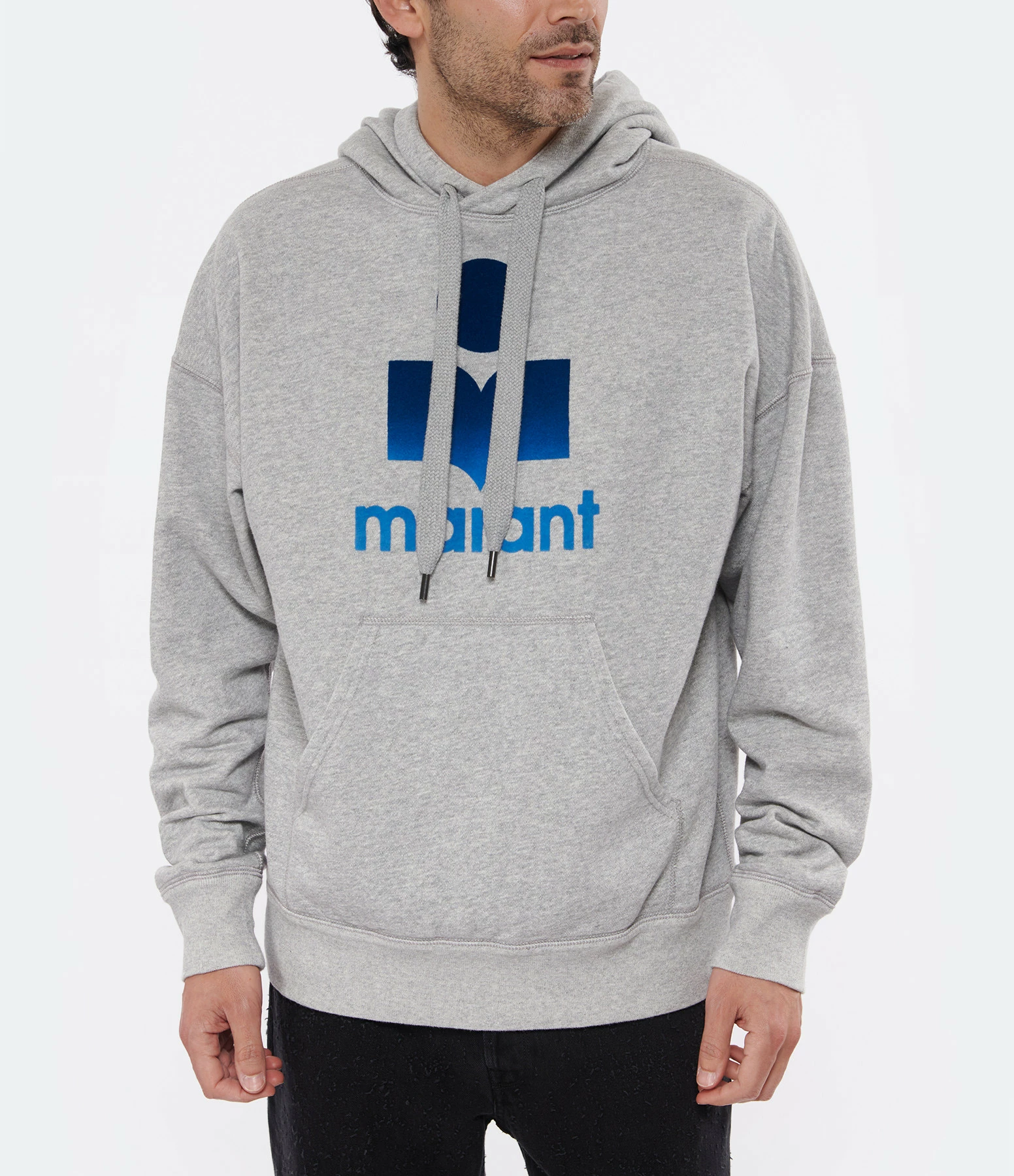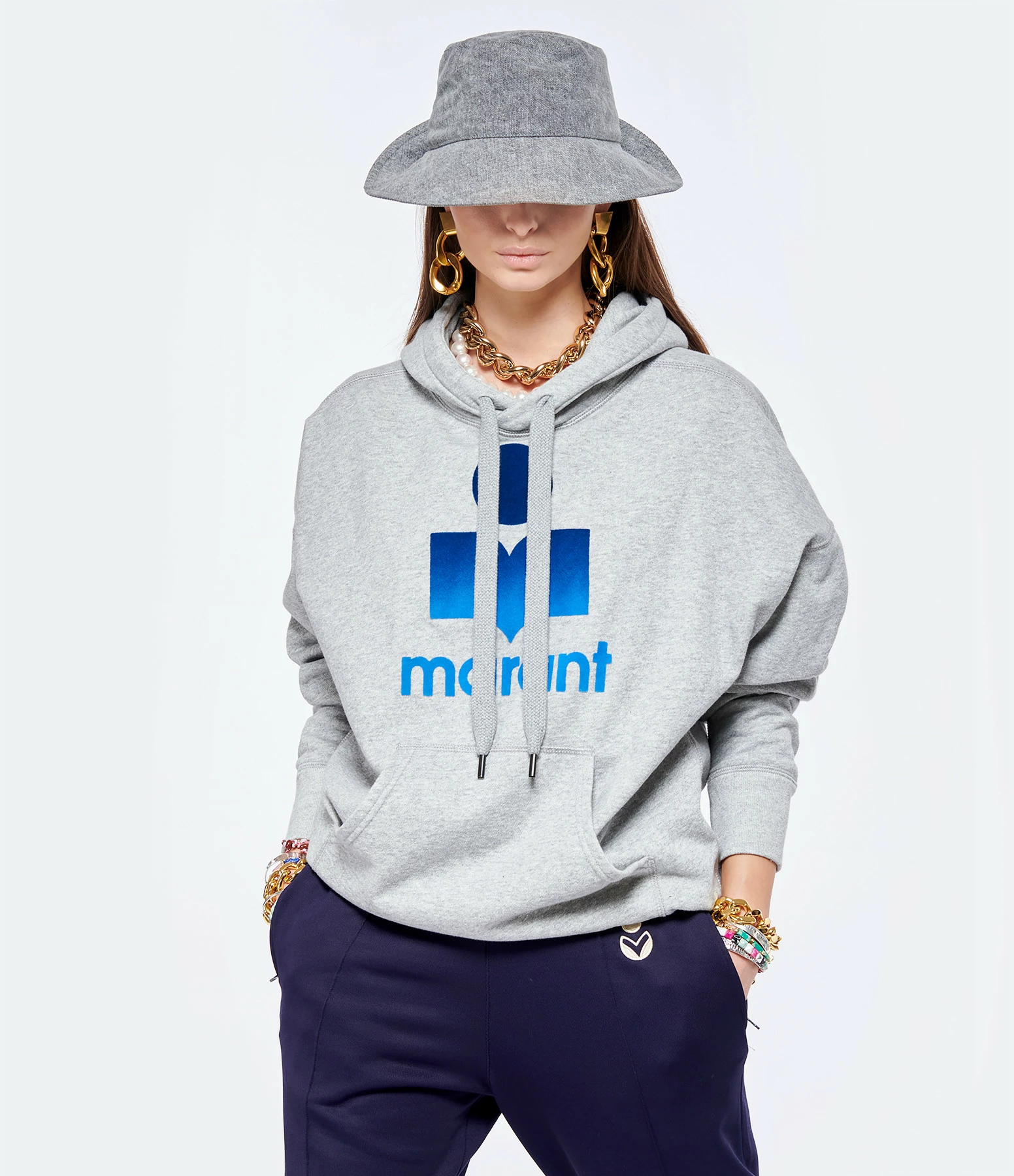Hoodie pour femme en coton gris. Logo “Marant” en velours bleu dégradé sur l’avant. Capuche avec liens de serrage. Manches longues. Une poche kangourou à l’avant. Base droite.