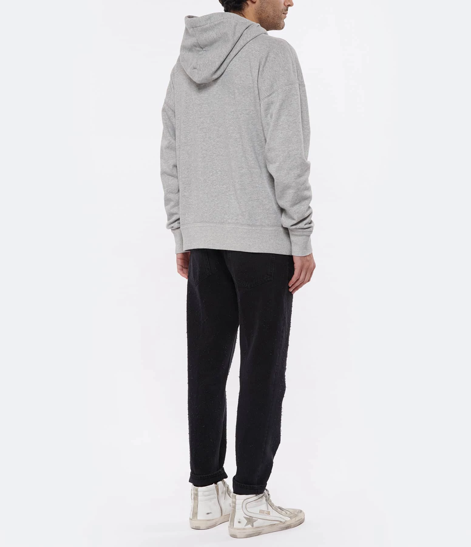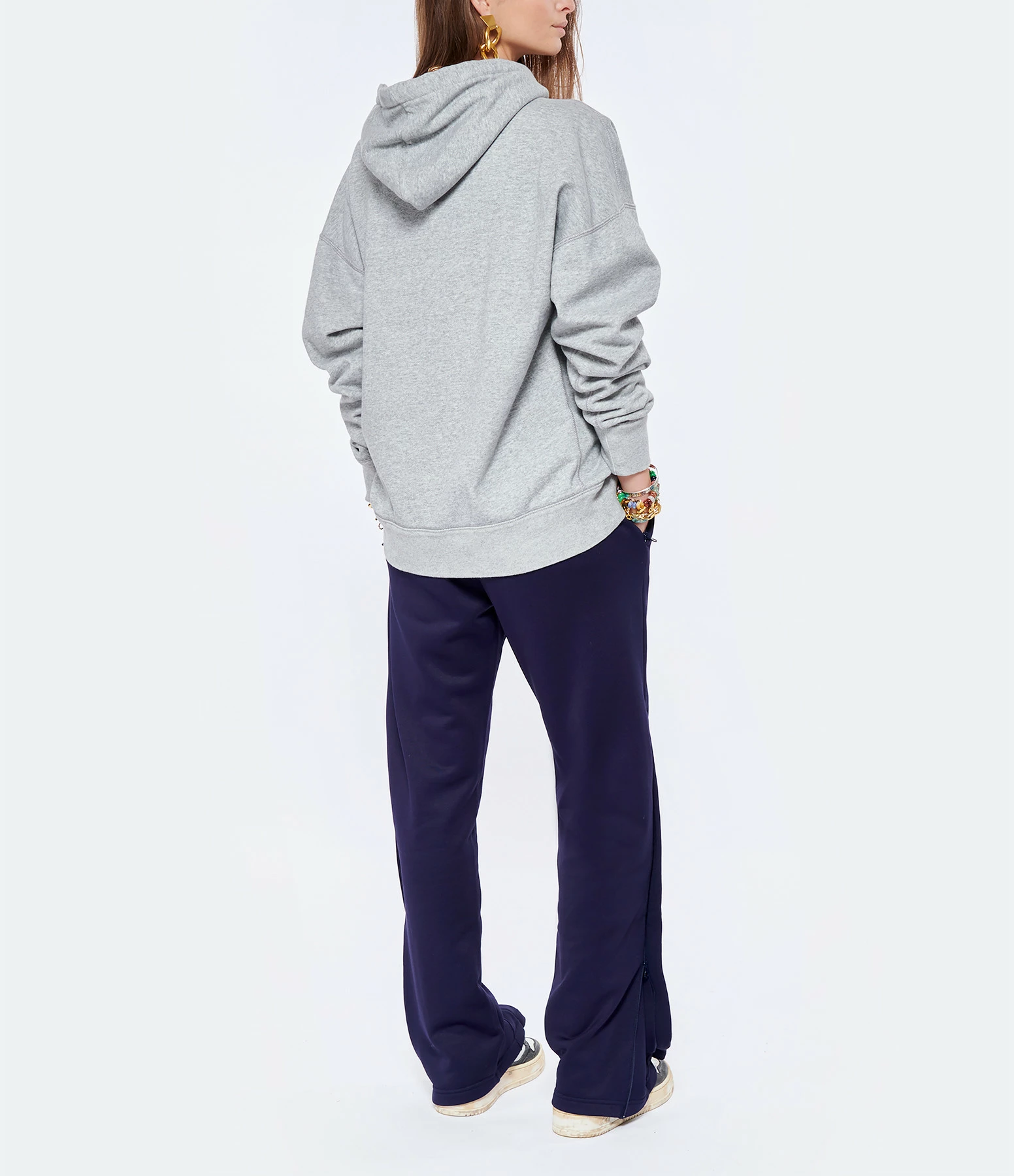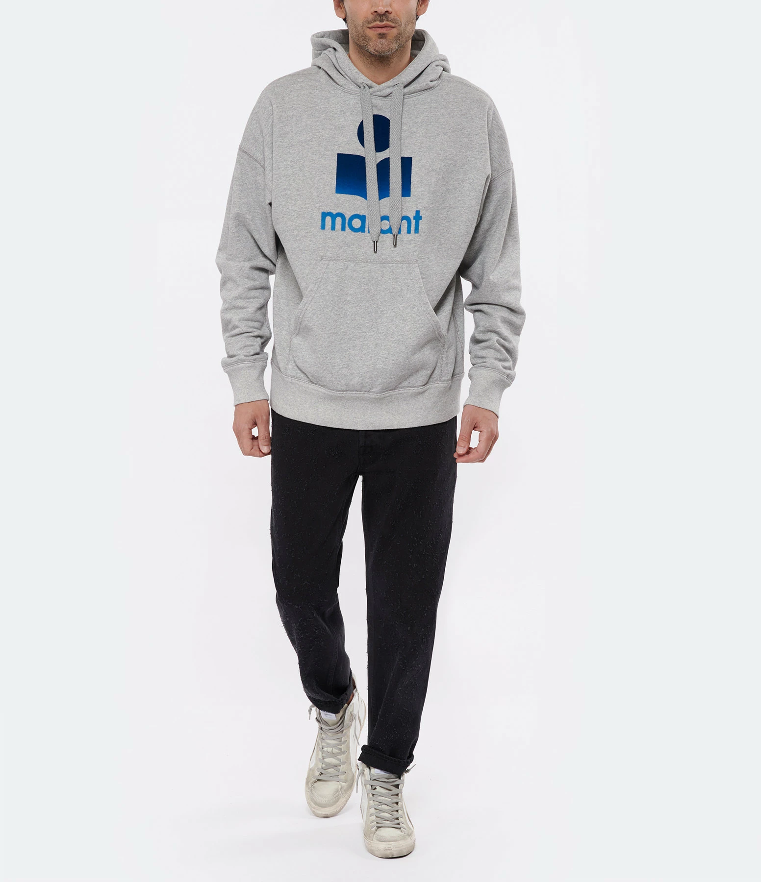 Hoodie pour femme en coton gris. Logo “Marant” en velours bleu dégradé sur l’avant. Capuche avec liens de serrage. Manches longues. Une poche kangourou à l’avant. Base droite.