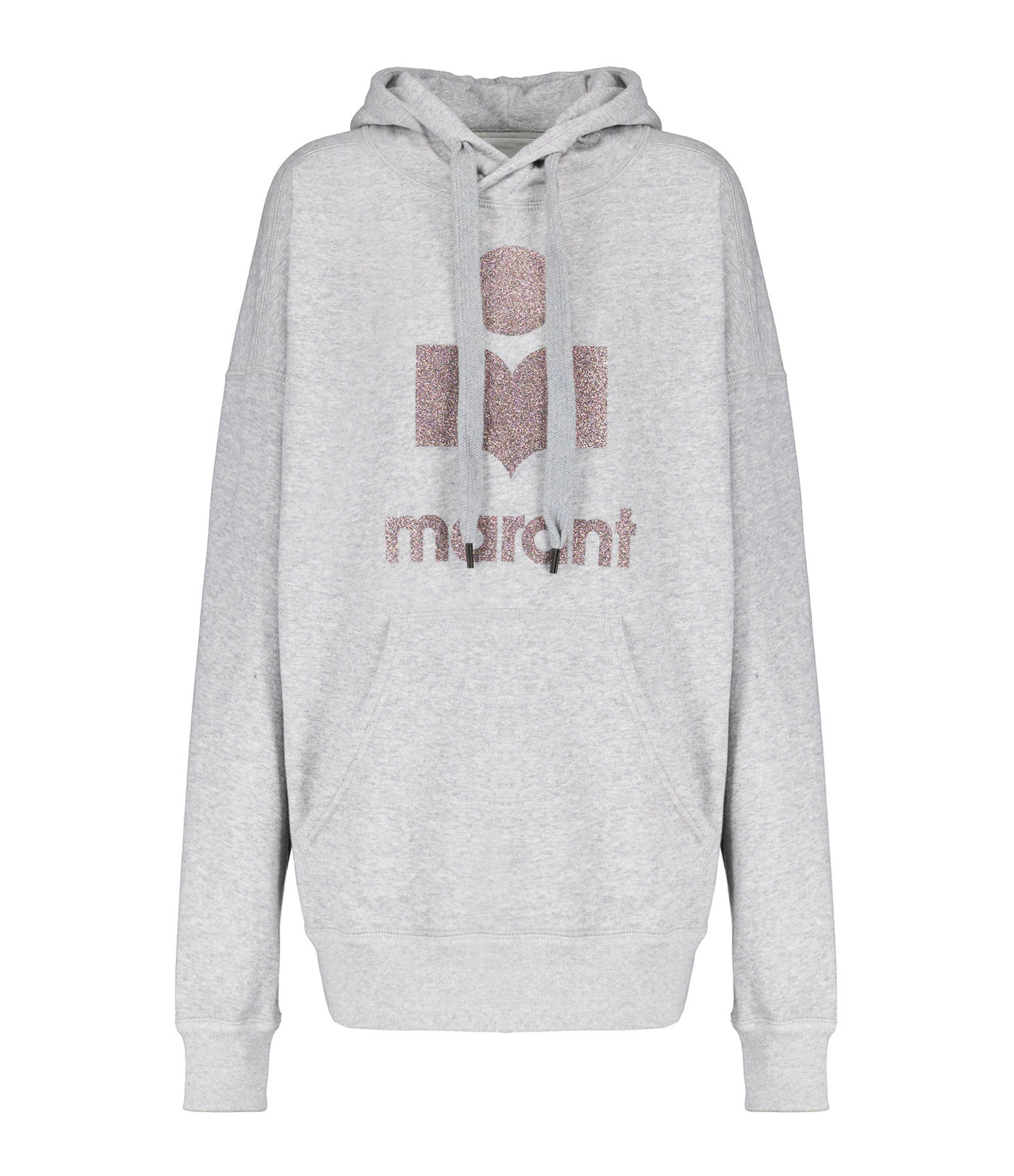 Sweatshirt en coton molletonné gris. Col rond à capuche avec liens de resserrage. Logo “Marant” flocké en paillettes multicolores. Manches longues avec poignet côtelé. Poche kangourou sur le devant. Coupe ample. Base droite côtelée.