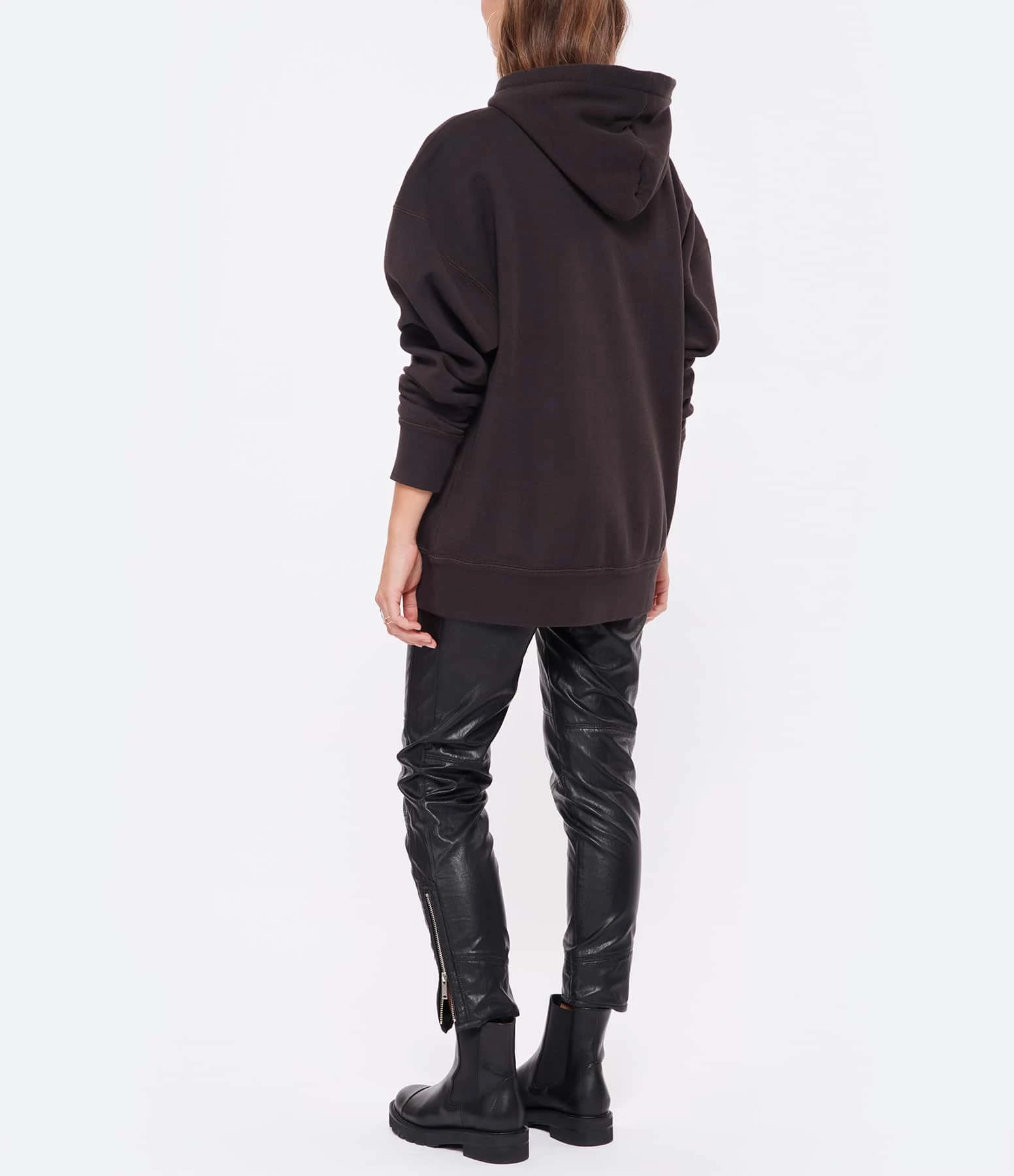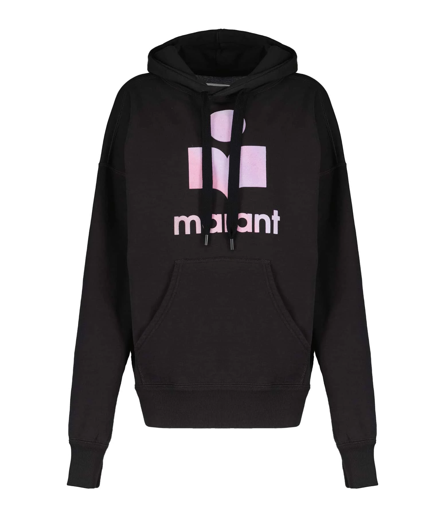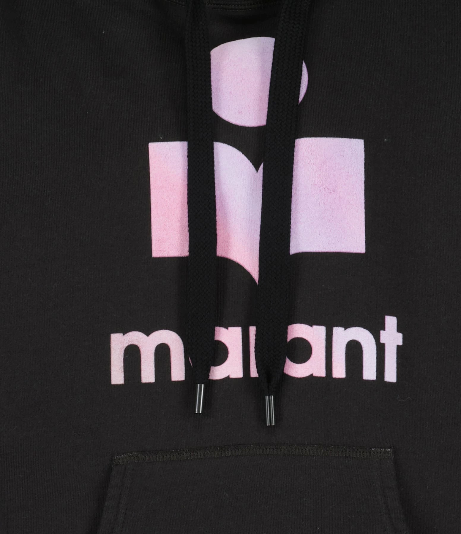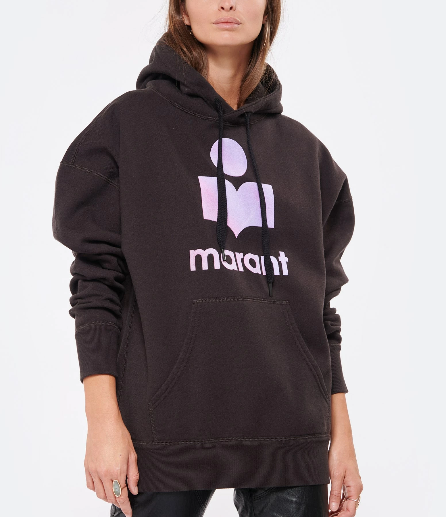 Sweatshirt en coton molletonné noir. Col rond à capuche. Logo “Marant” flocké velours violet effet délavé. Capuche avec liens de resserrage. Manches longues avec poignet côtelé. Poche kangourou sur le devant. Coupe droite large. Base droite côtelée. Non doublé.