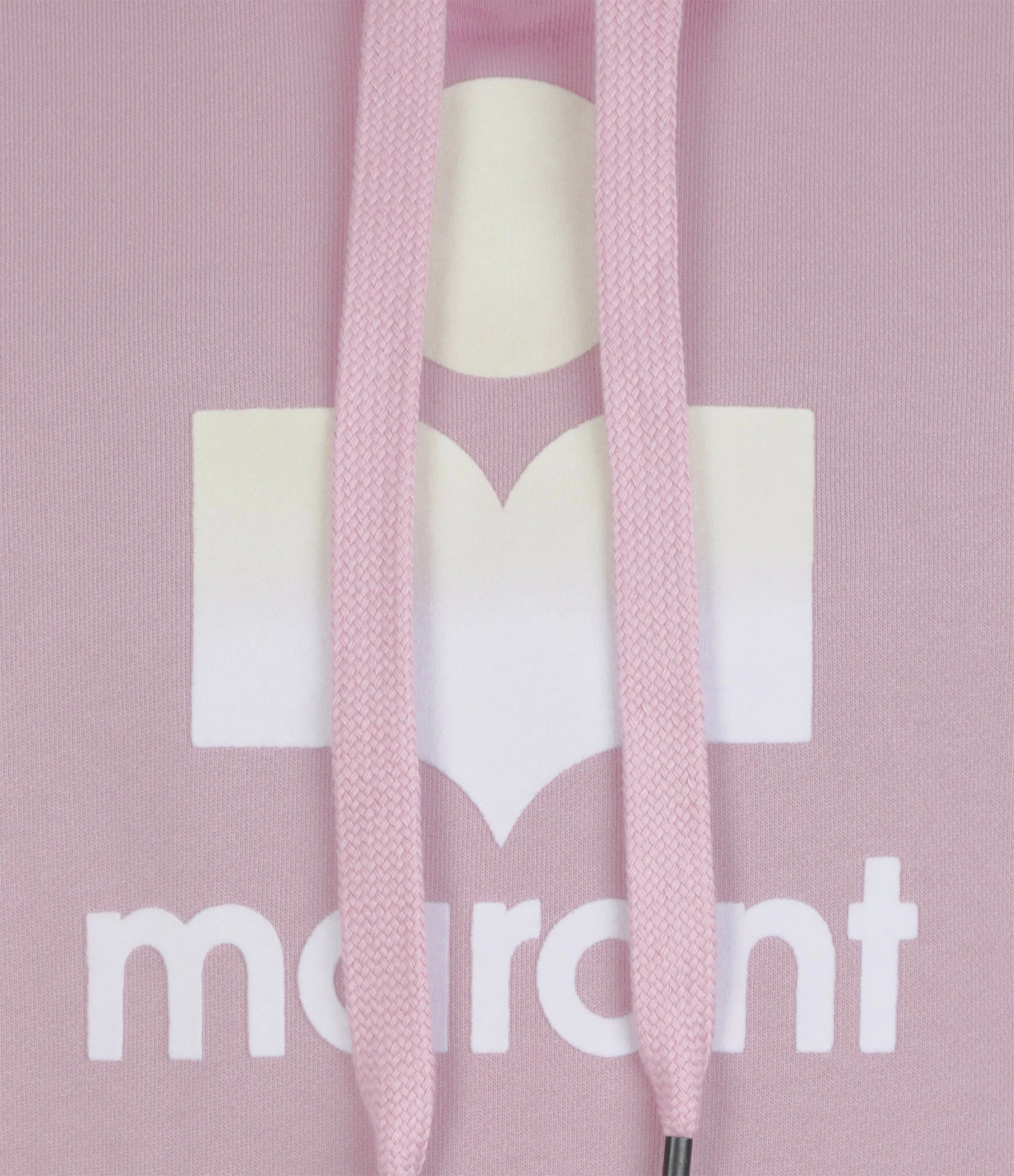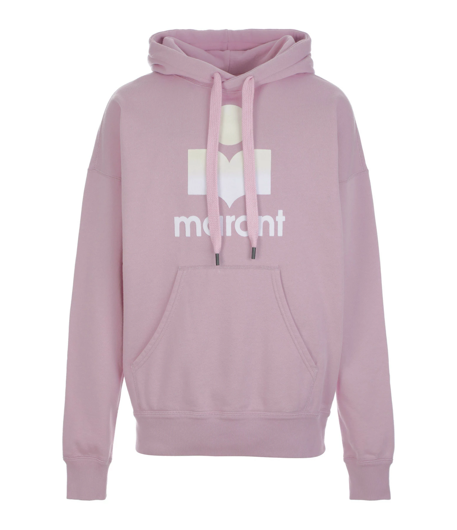 Sweatshirt en coton rose clair pour femme. Capuche avec liens de serrage. Manches longues. Base et poignets resserrés par bords côtes. Logo “Isabel Marant” en velours blanc floqué sur l’avant. Coupe droite. Base droite.