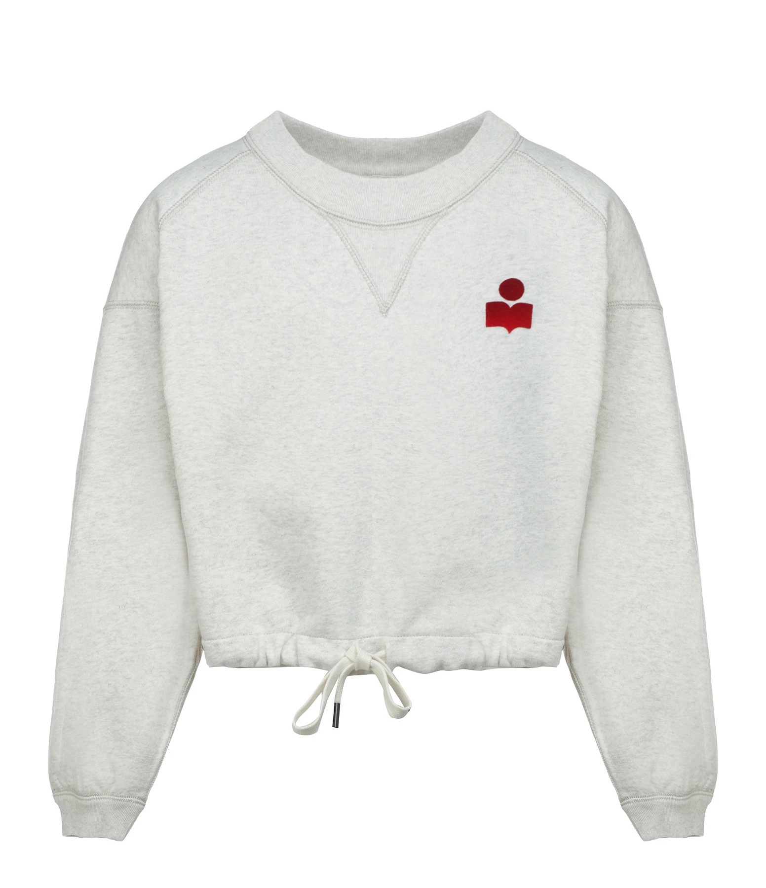 Sweatshirt court en coton gris. Petit logo en velours rouge sur la poitrine. Col rond. Manches longues resserrées aux poignets. Coupe droite. Base droite avec liens de serrage.