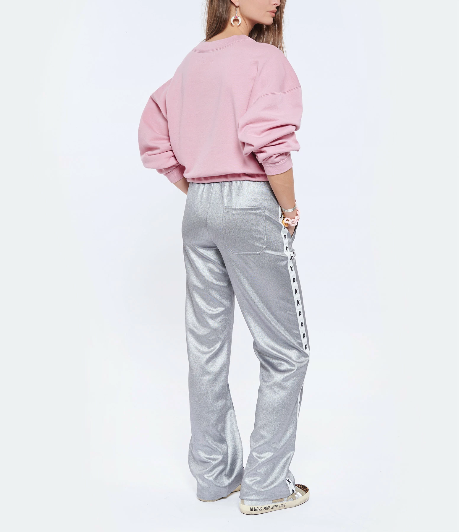 Sweatshirt court en coton rose. Petit logo en velours écru sur la poitrine. Col rond. Manches longues resserrées aux poignets. Coupe droite. Base droite avec liens de serrage.