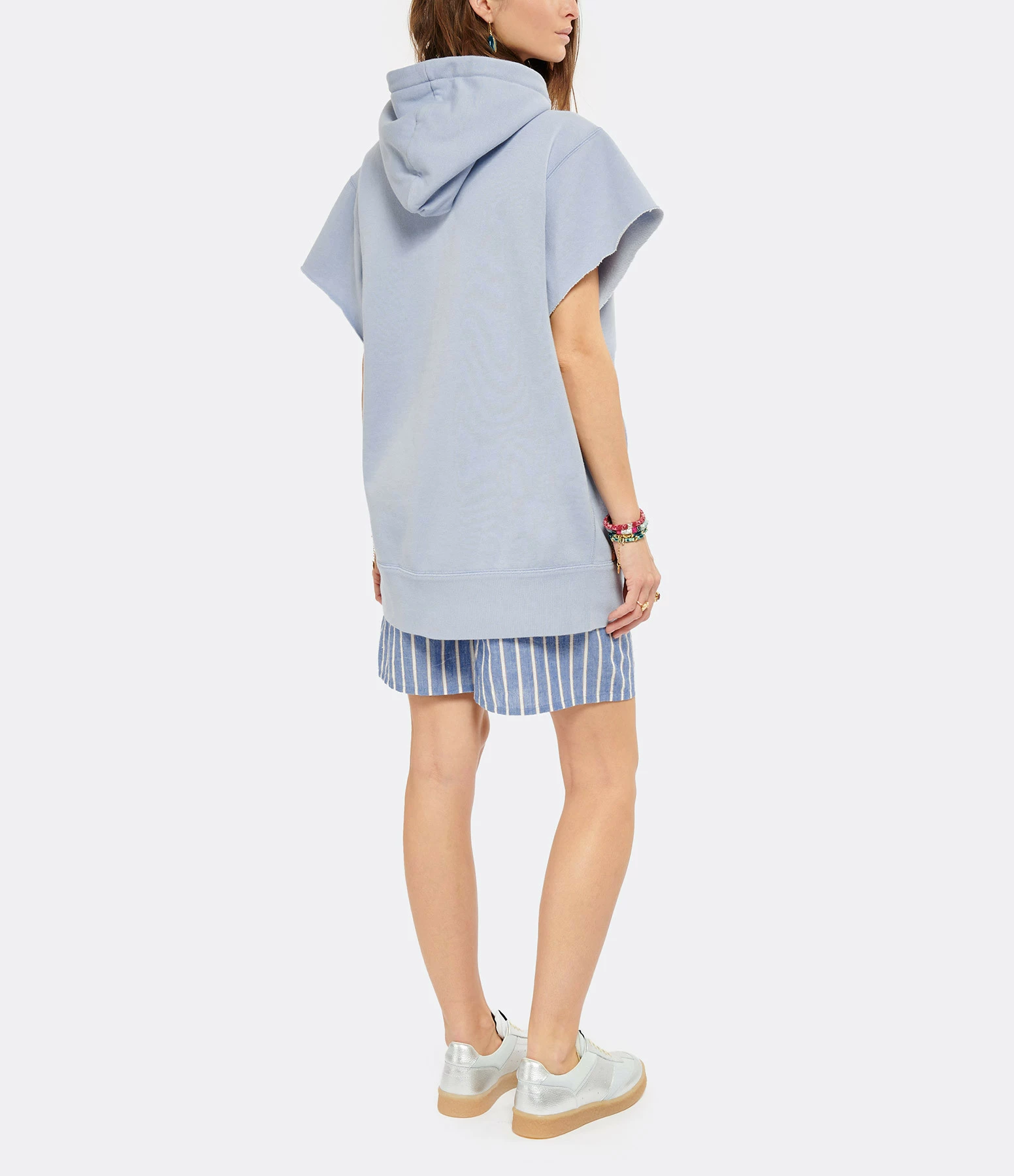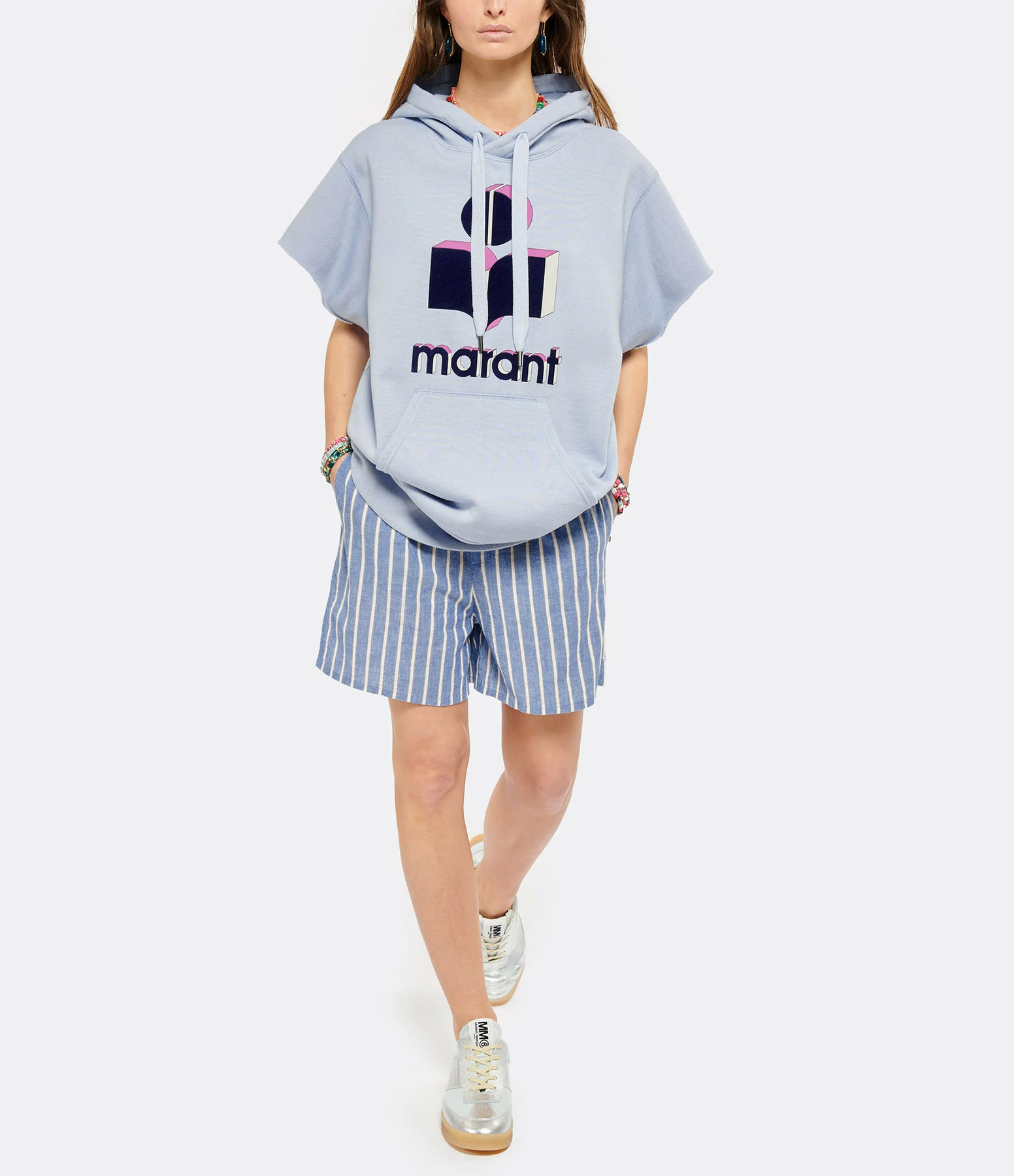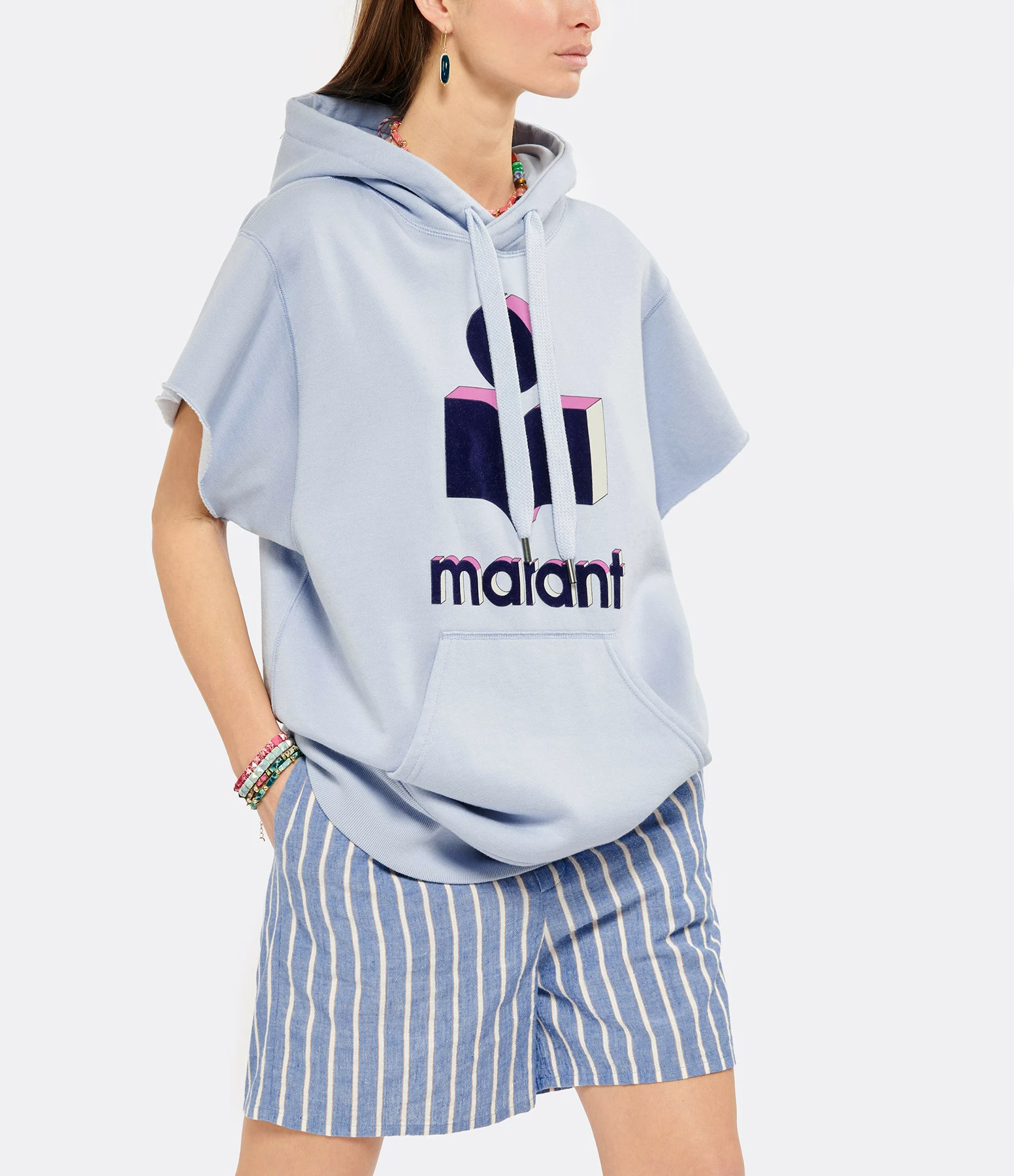 Sweatshirt en coton bleu. Capuche avec liens de serrage. Manches courtes. Logo “Isabel Marant” en velours effet 3D floqué sur l’avant. Coupe droite. Base droite.
