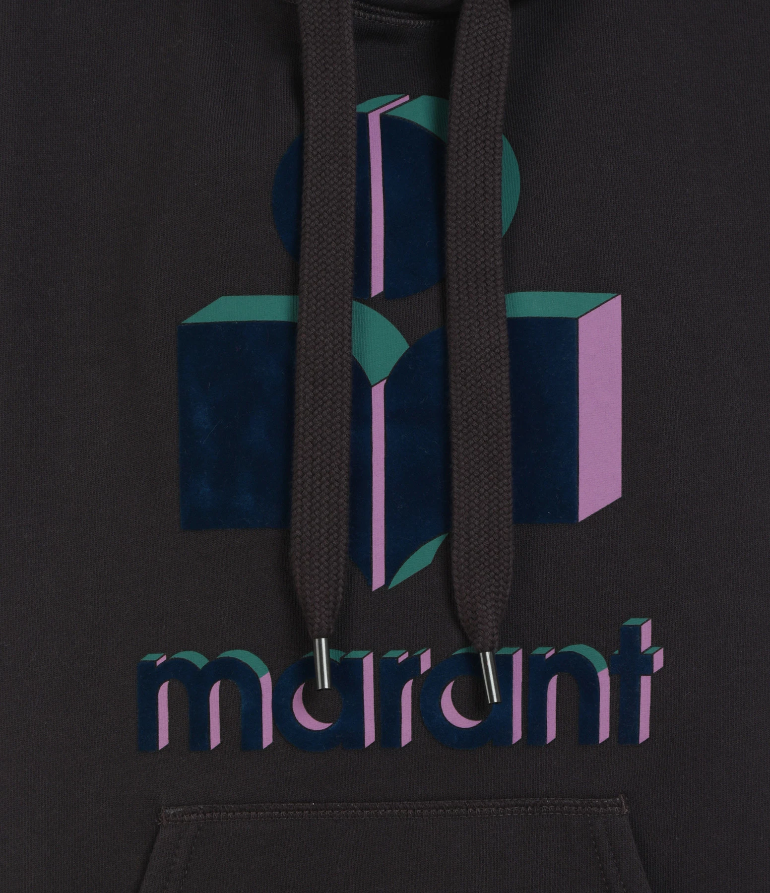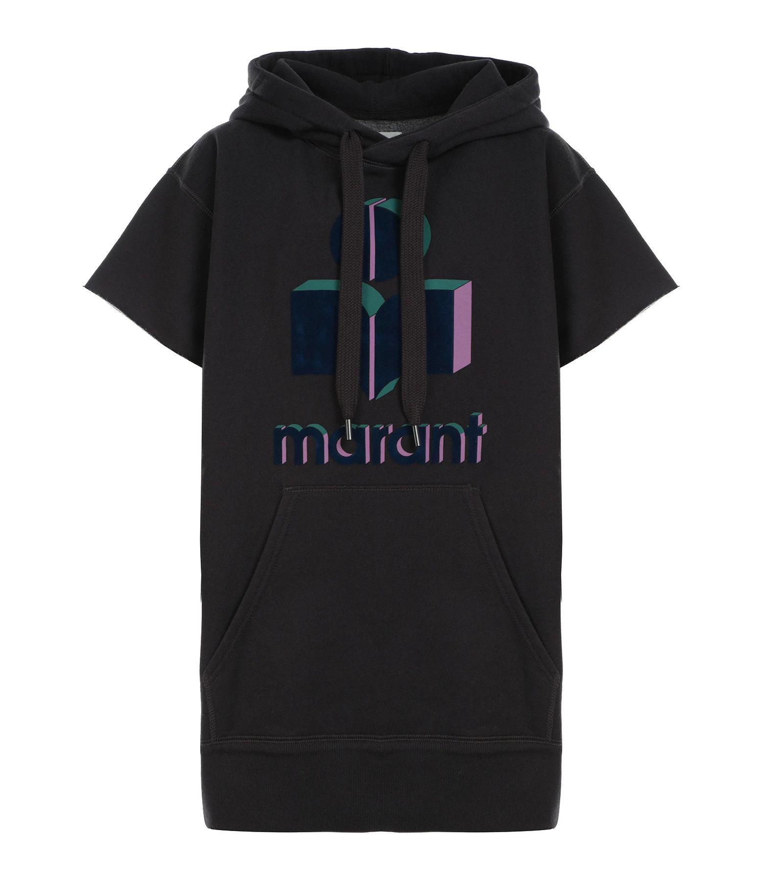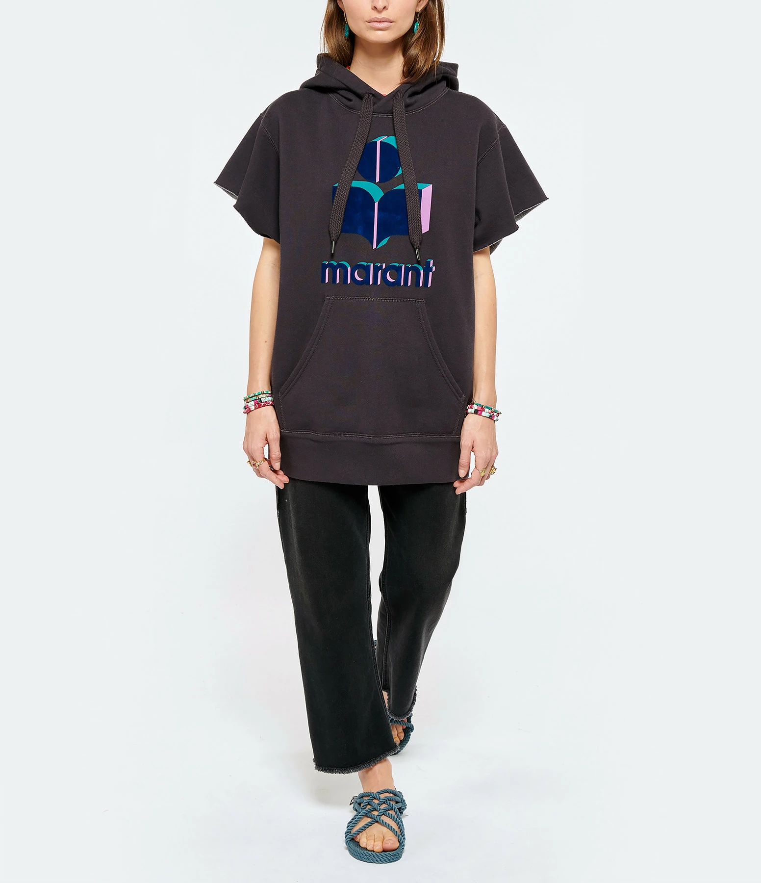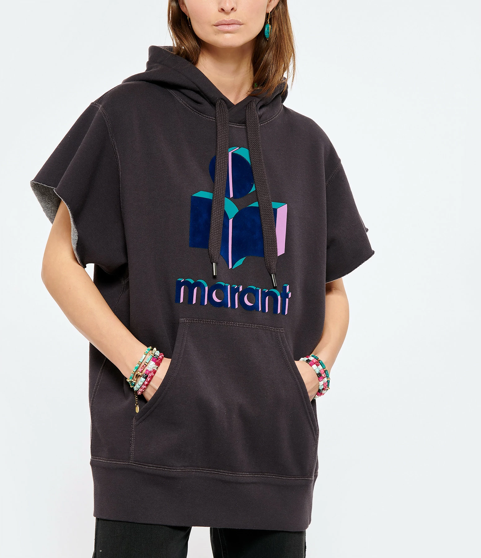 Sweatshirt en coton bleu marine. Capuche avec liens de serrage. Manches courtes. Logo “Isabel Marant” en velours effet 3D floqué sur l’avant. Coupe droite. Base droite.
