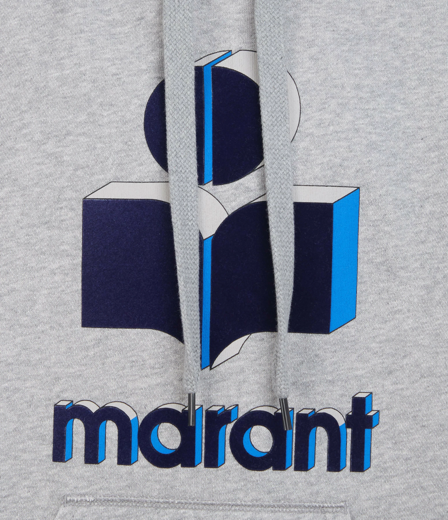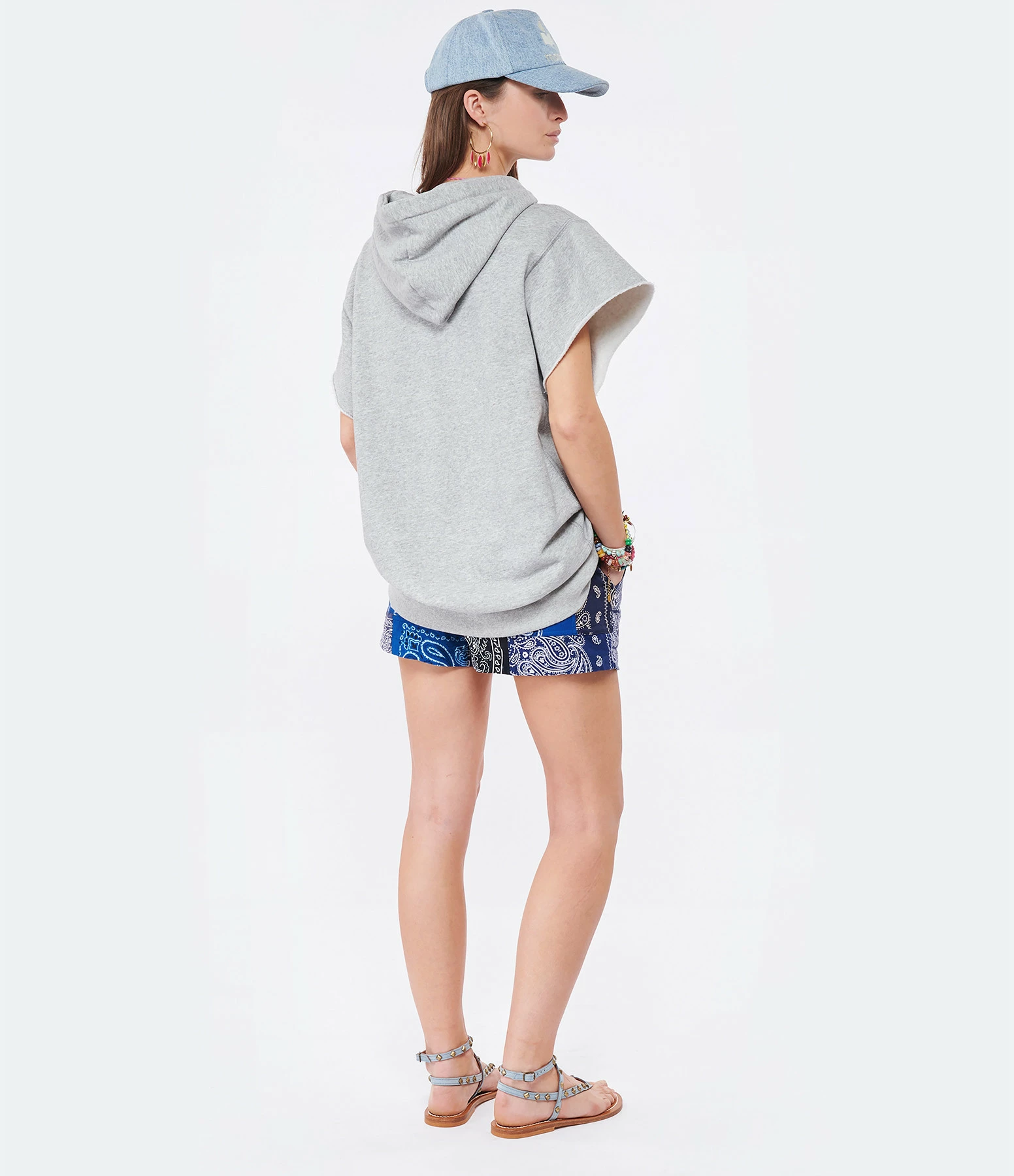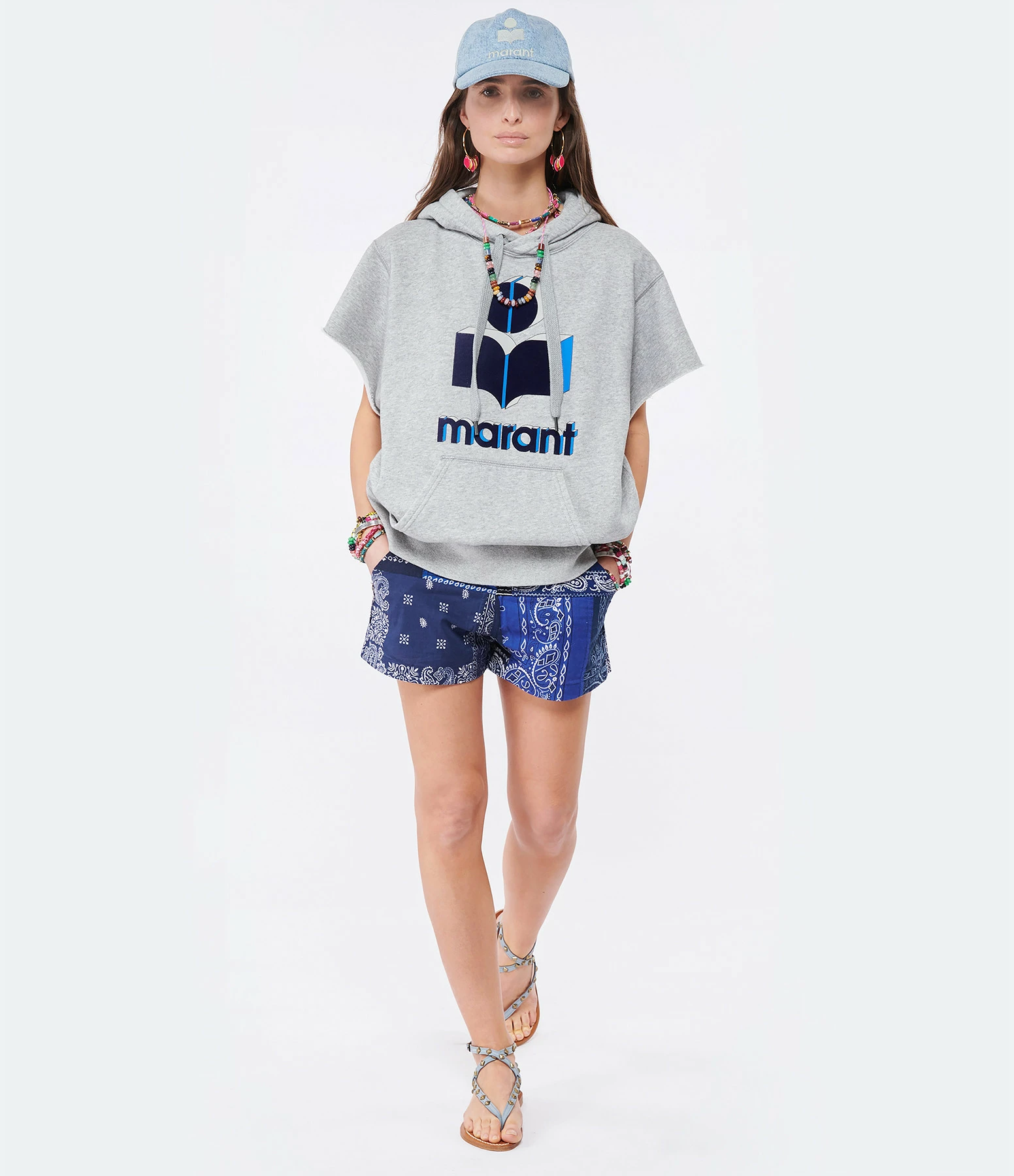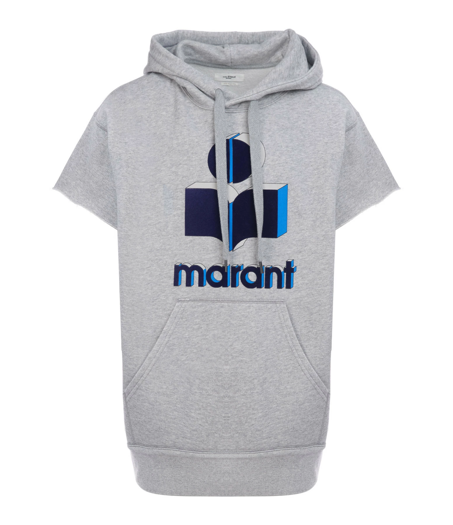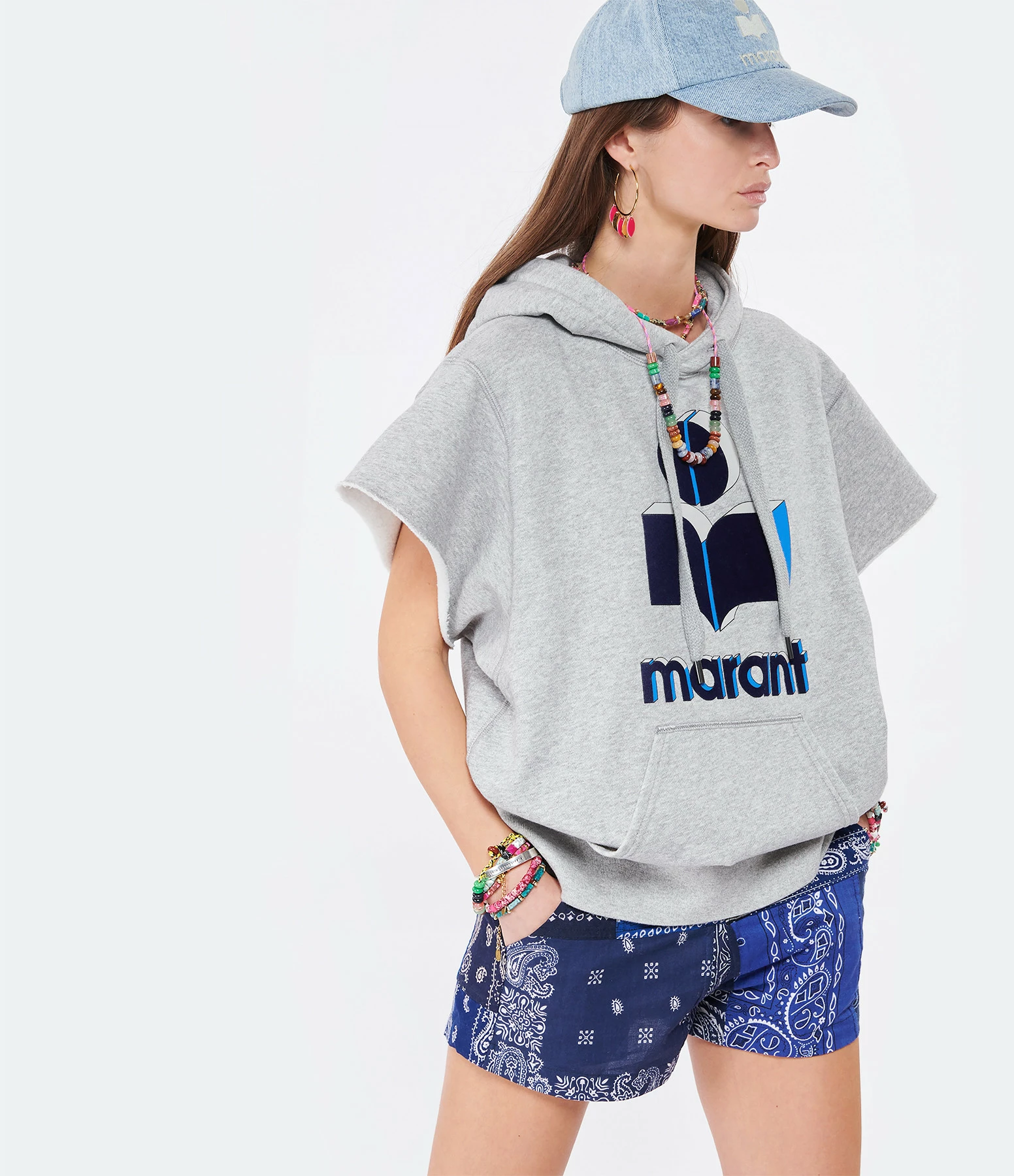 Sweatshirt en coton gris. Capuche avec liens de serrage. Manches courtes. Logo “Isabel Marant” en velours bleu effet 3D floqué sur l’avant. Coupe droite. Base droite.