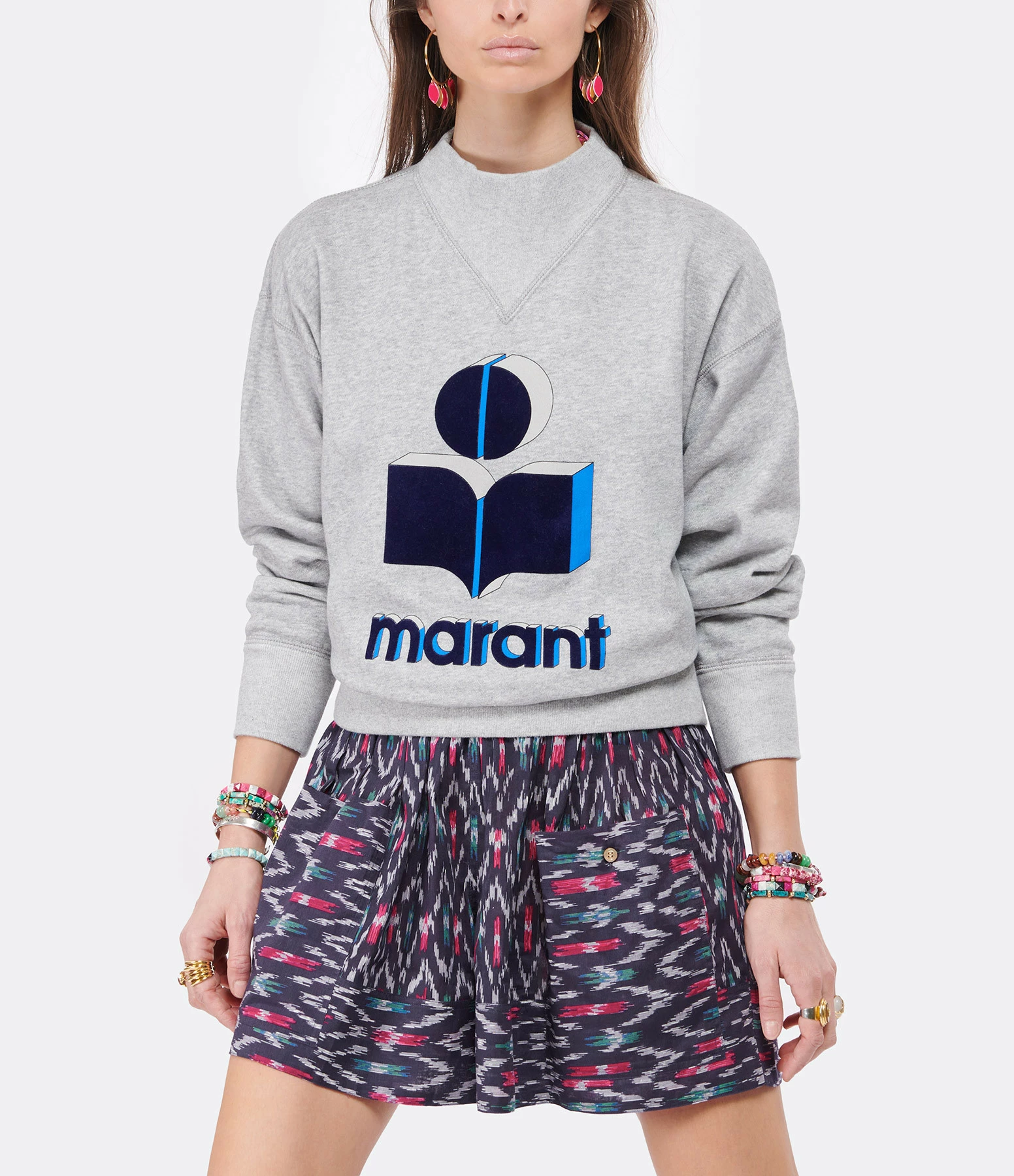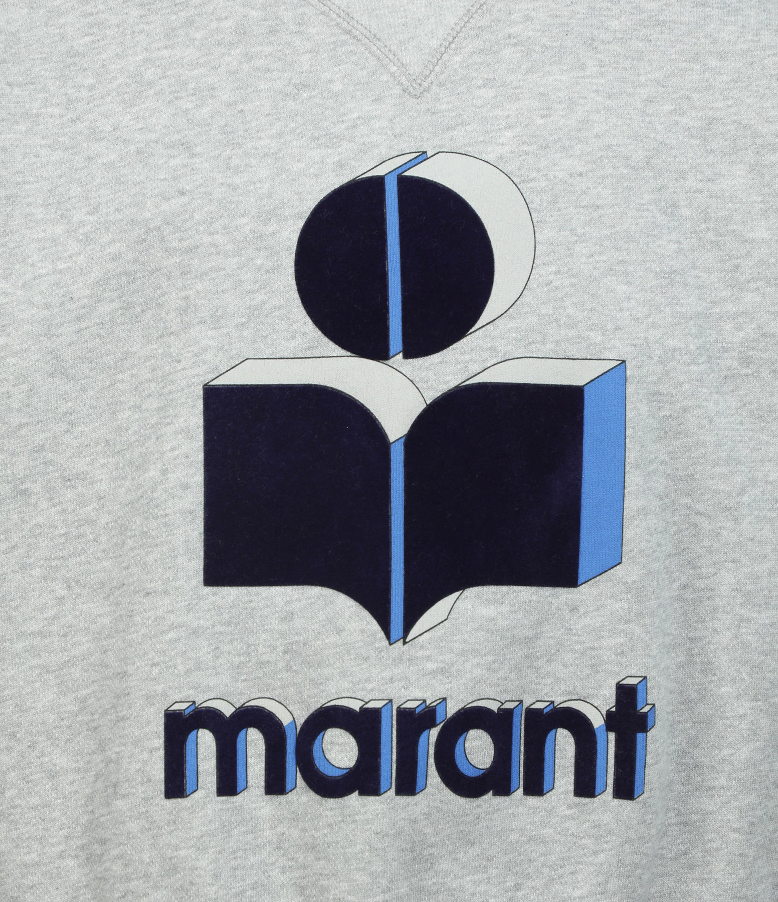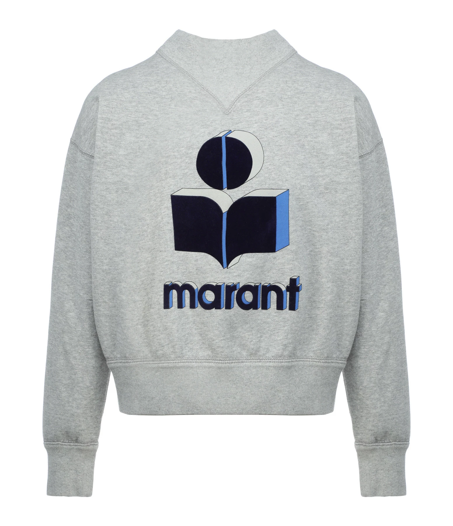 Sweatshirt en coton gris. Logo “Isabel Marant” en velours bleu foncé à l’avant. Col montant. Manches longues. Coupe ample. Base droite.