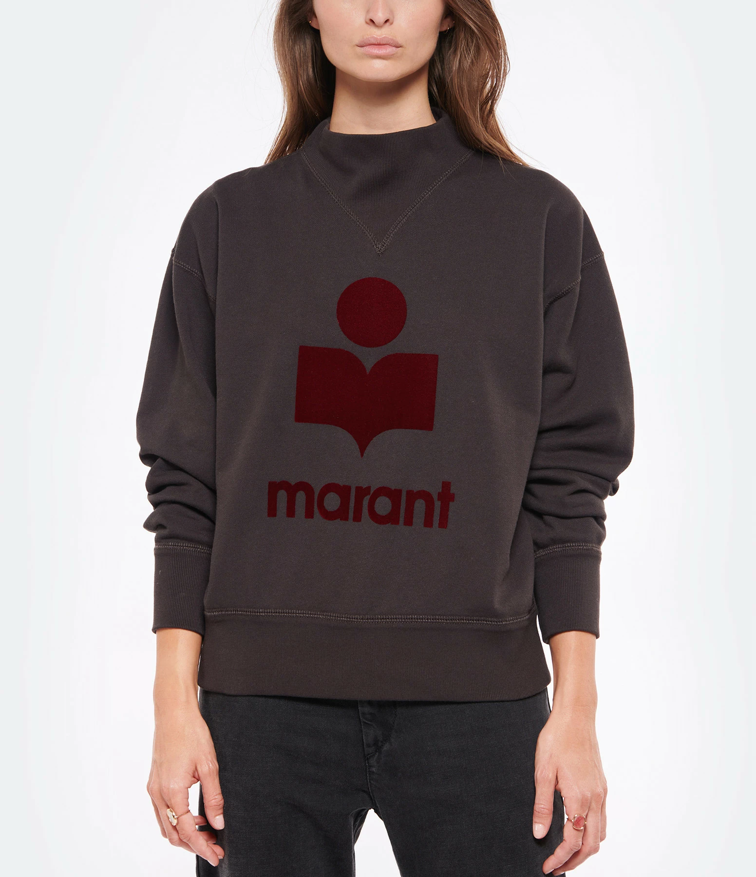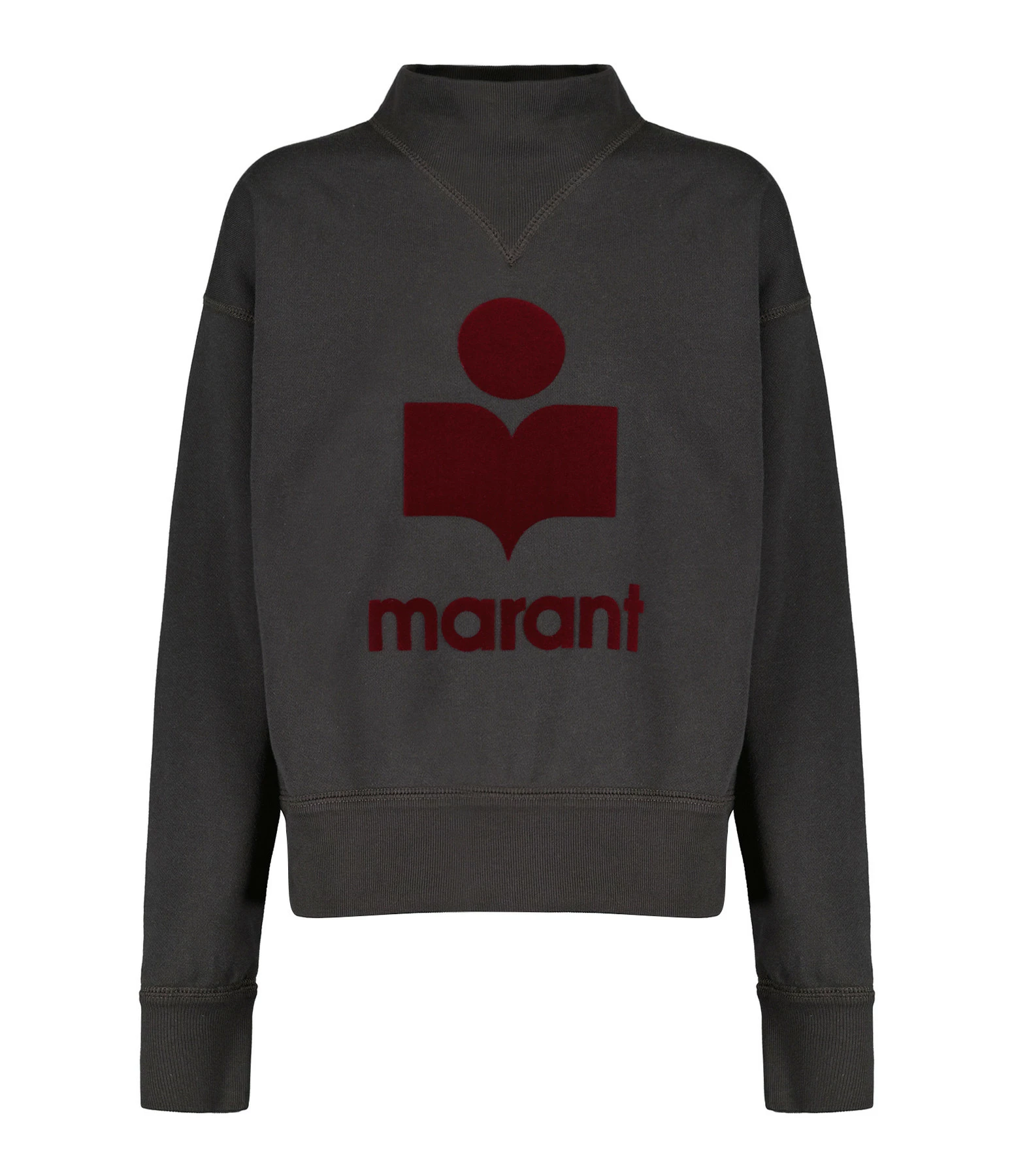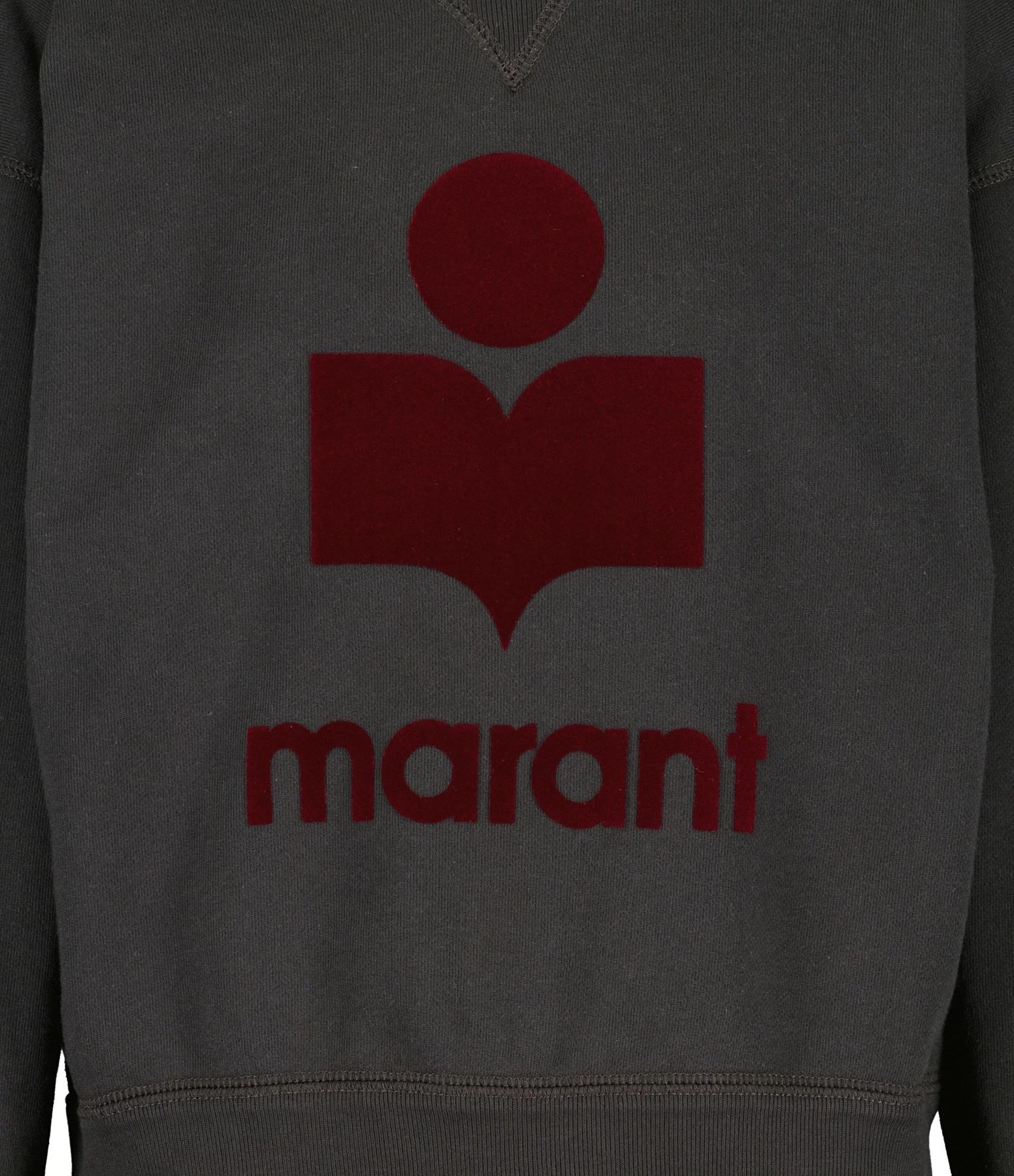 Sweatshirt en coton noir délavé pour femme. Col rond et manches longues. Base resserrée par bords côtes. Logo “Isabel Marant” en velours rouge foncé floqué sur l’avant. Coupe droite. Base droite.