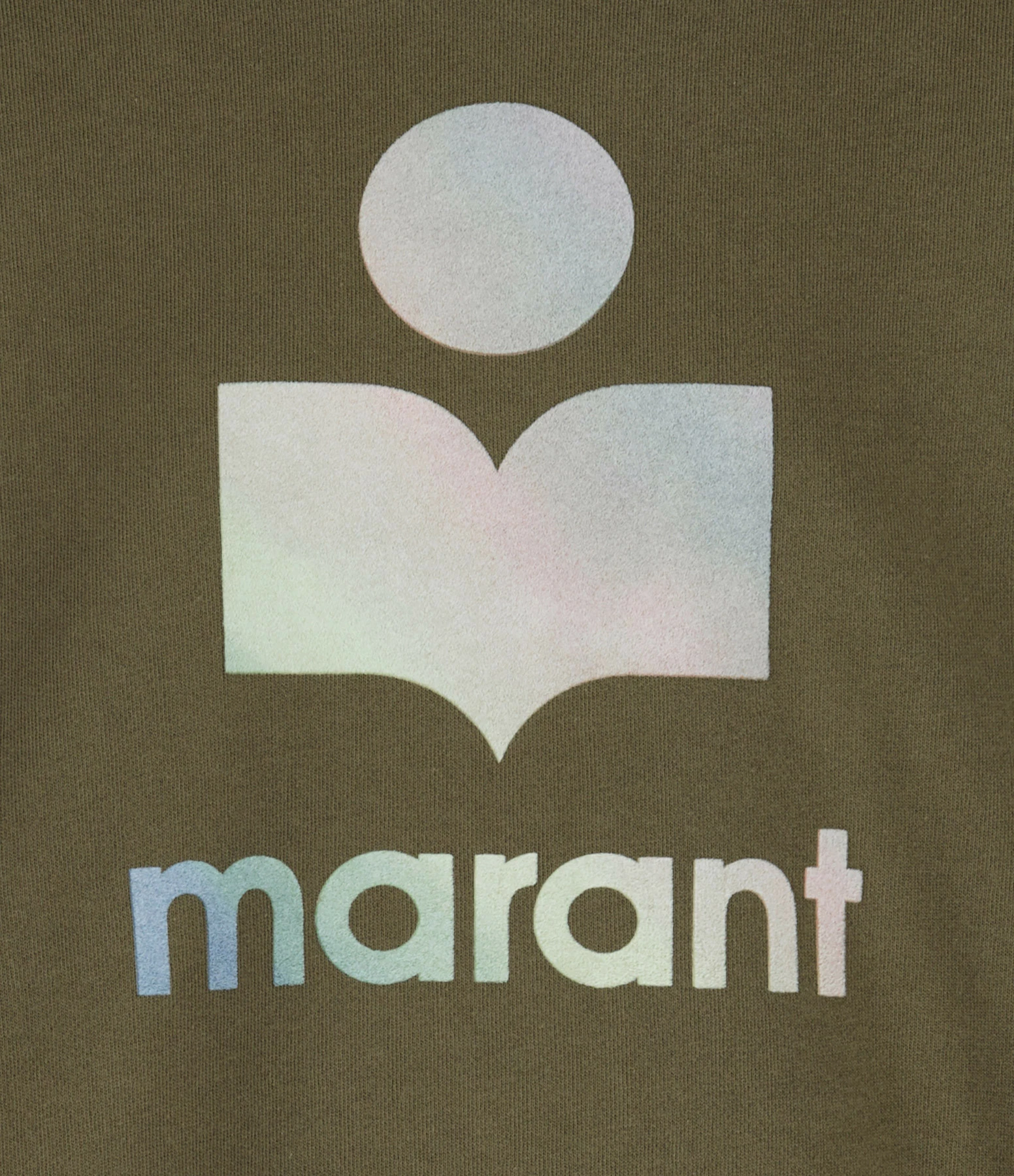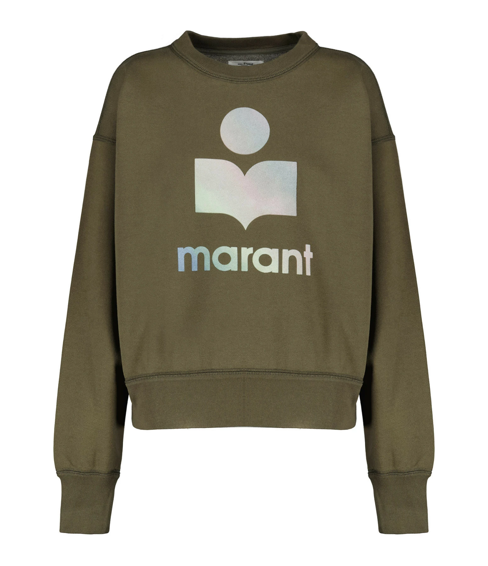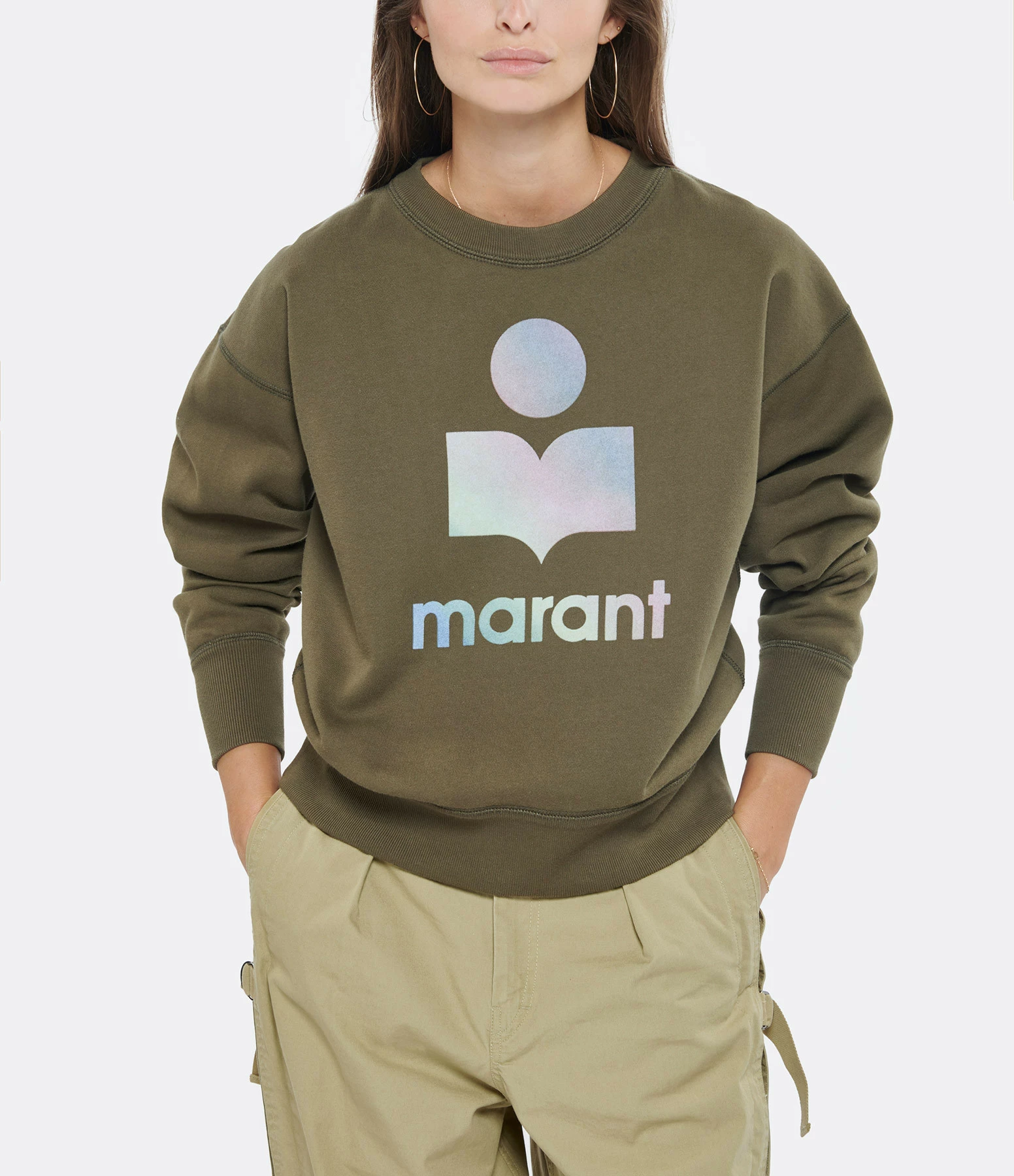 Sweatshirt en coton molletonné kaki, avec logo “Marant” en velours multicolore pastel. Col rond. Manches longues. Coupe droite. Base droite. Non doublé.