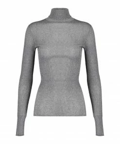 Pull en maille côtelée argentée. Col roulé. Manches longues. Coupe près du corps. Base droite.