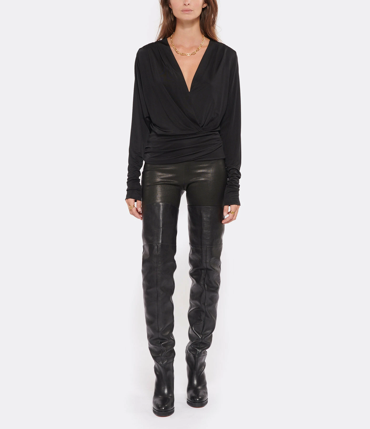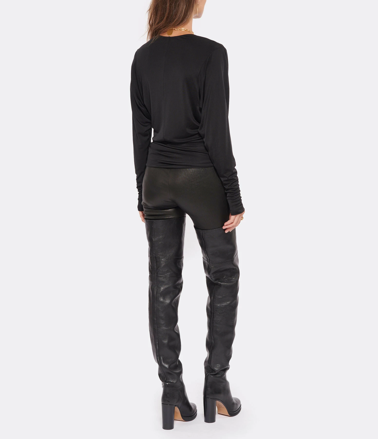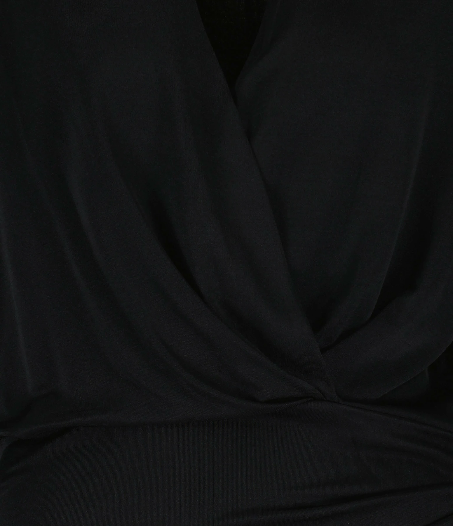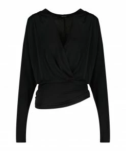 Top en soie noir. Décolleté en V. Manches longues. Base arrondie froncée.