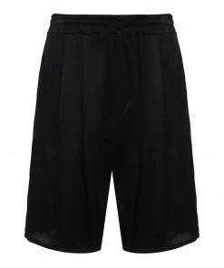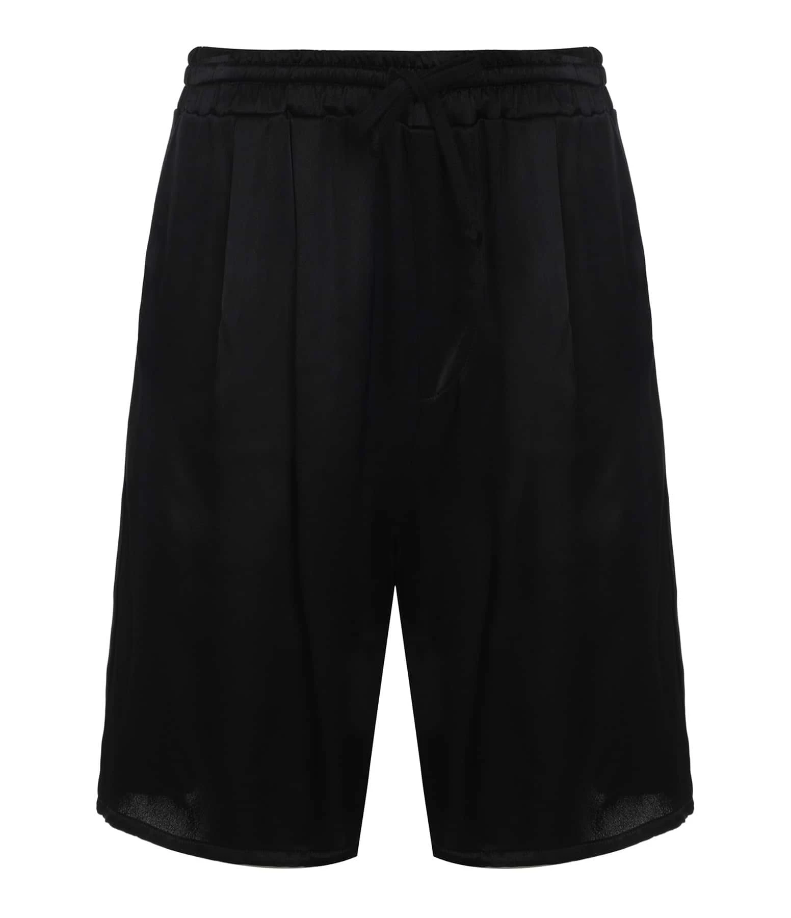 Bermuda fluide effet satiné noir. Taille élastiquée avec liens de serrage. Deux poches italiennes. Plis sur le devant. Coupe droite.