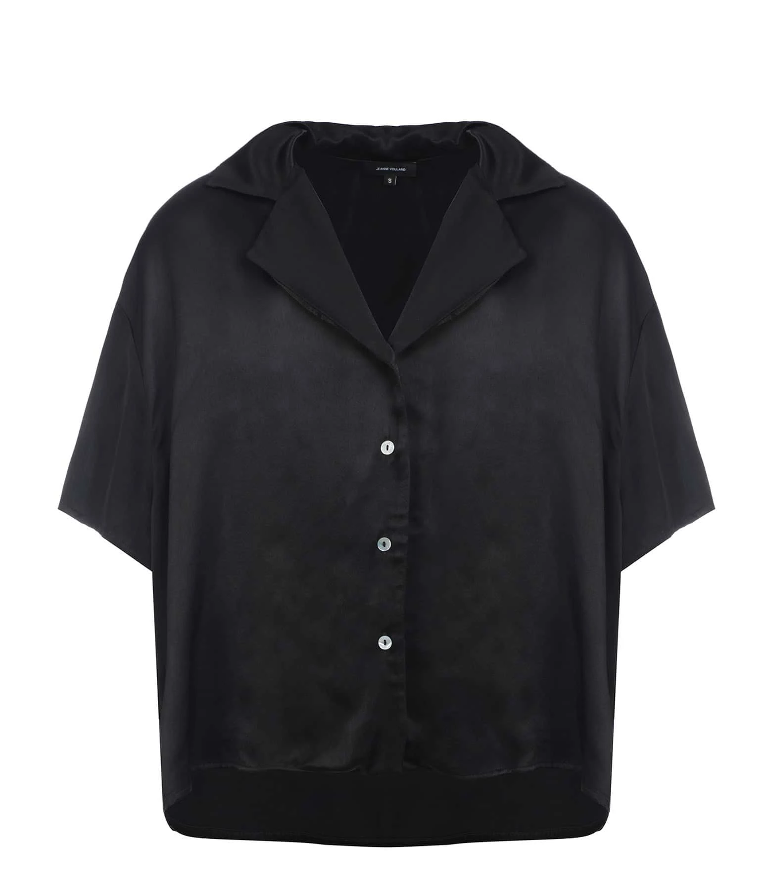 Chemise noire satinée. Manches courtes. Col chemisier. Fermeture par boutons nacrés. Coupe droite. Base droite.