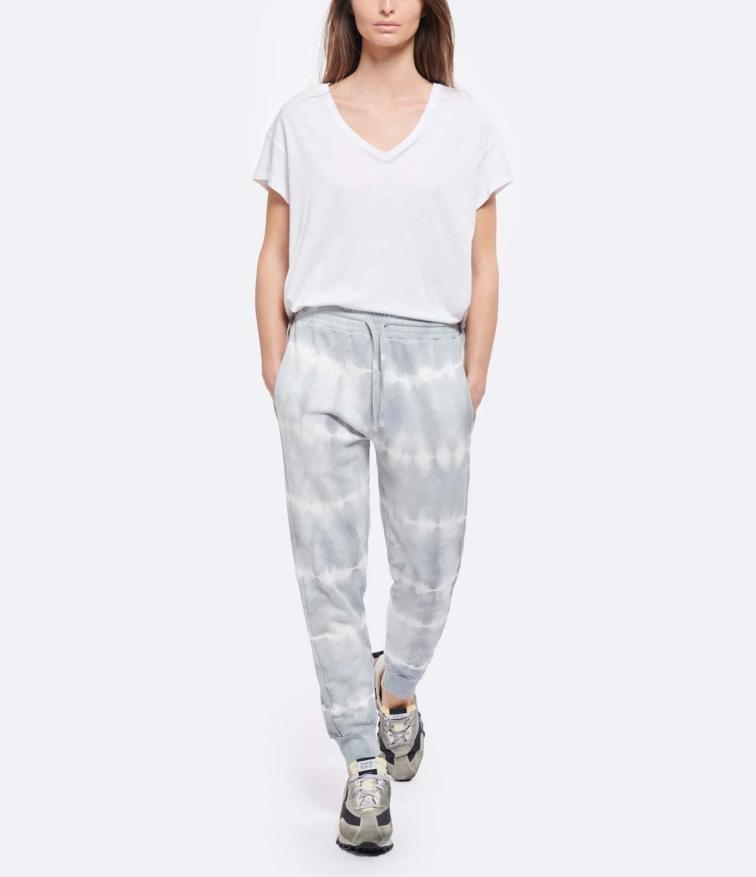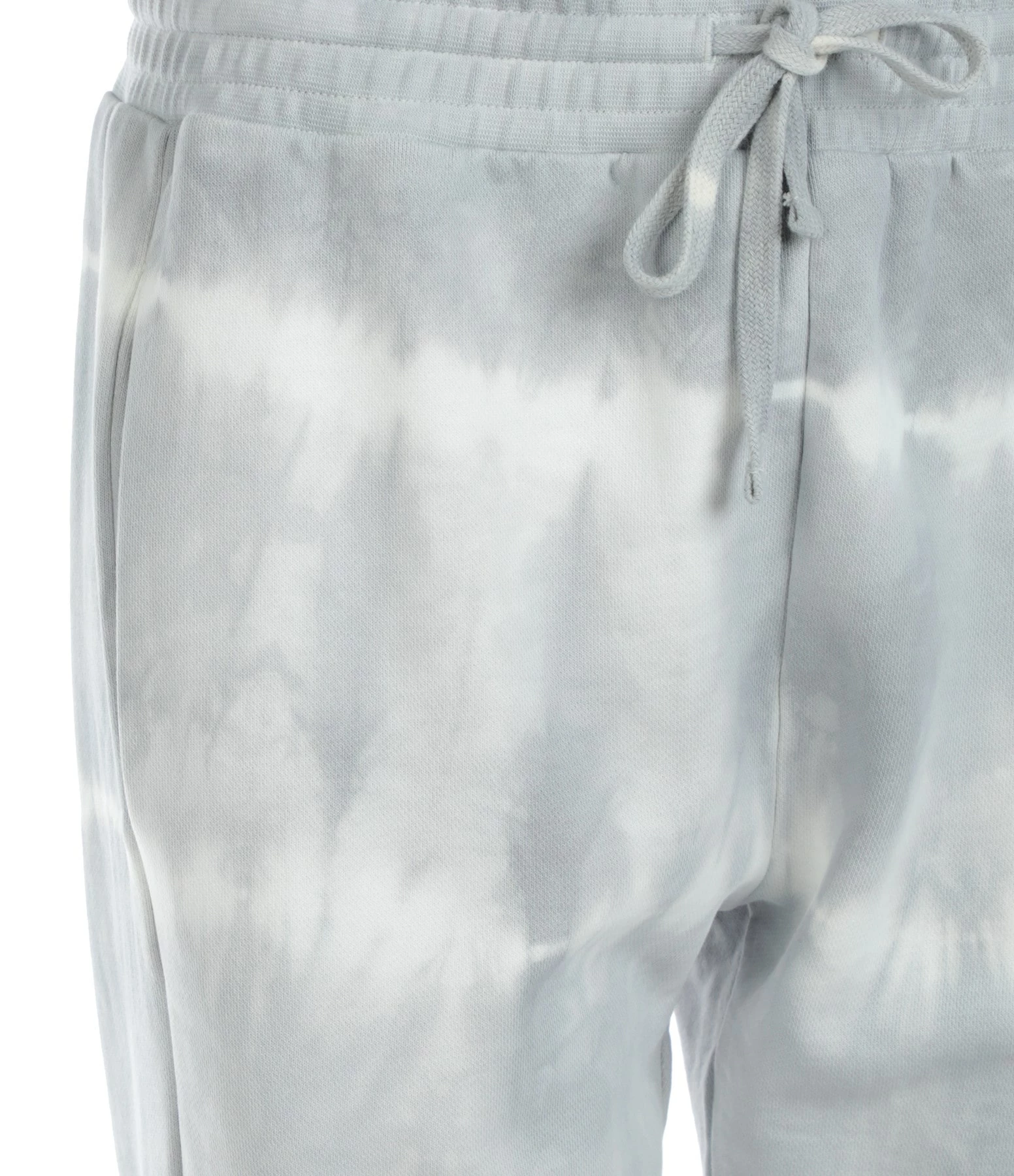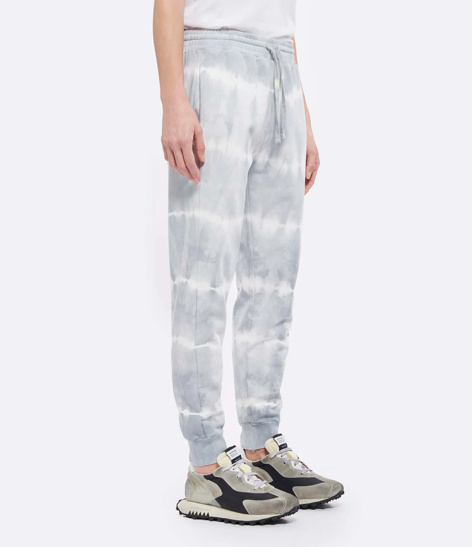 Pantalon de jogging en coton organique et recyclé. Teinture tie and dye gris et blanc. Taille élastiquée avec liens de serrage. Deux poches fendues. Bord côte en bas de jambe. Coupe droite. Base droite. Non doublé.