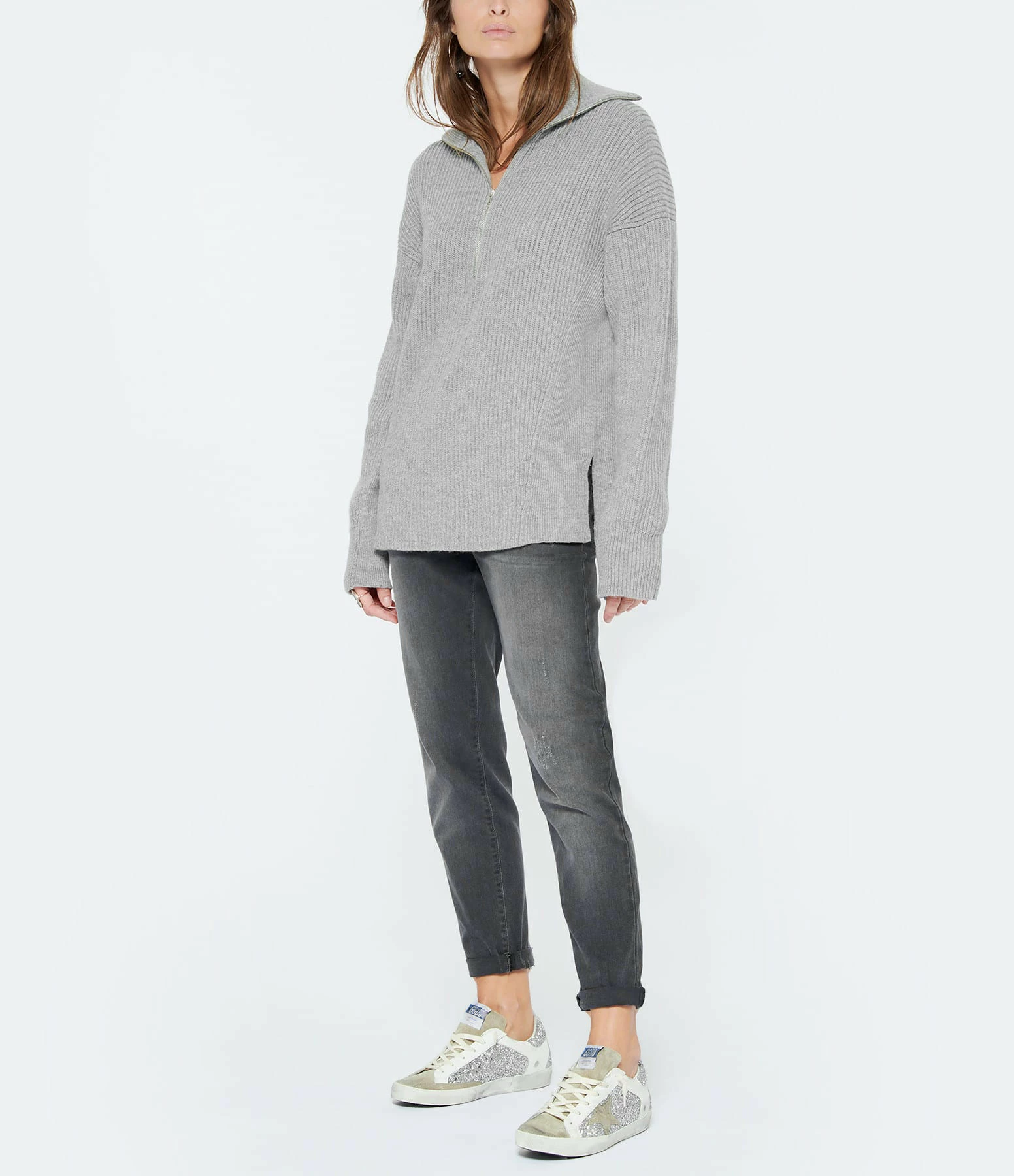 Pull en maille côtelée gris. Col camionneur zippé. Manches longues. Fentes latérales. Coupe ample. Base droite.