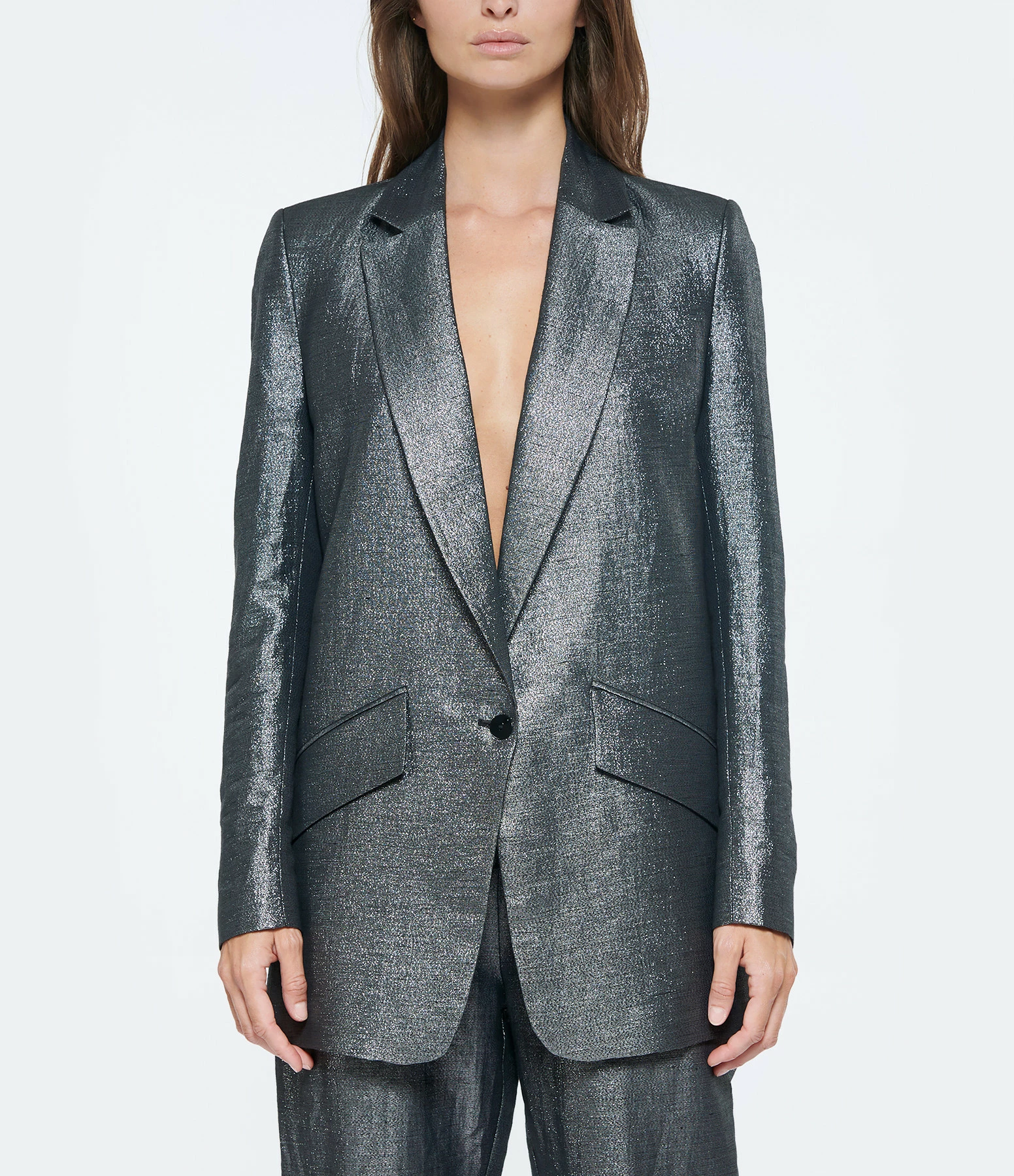 Veste de blazer en lin lurex noir. Col tailleur. Manches longues. Deux poches à rabats. fermeture boutonnée. Coupe droite. Base droite.