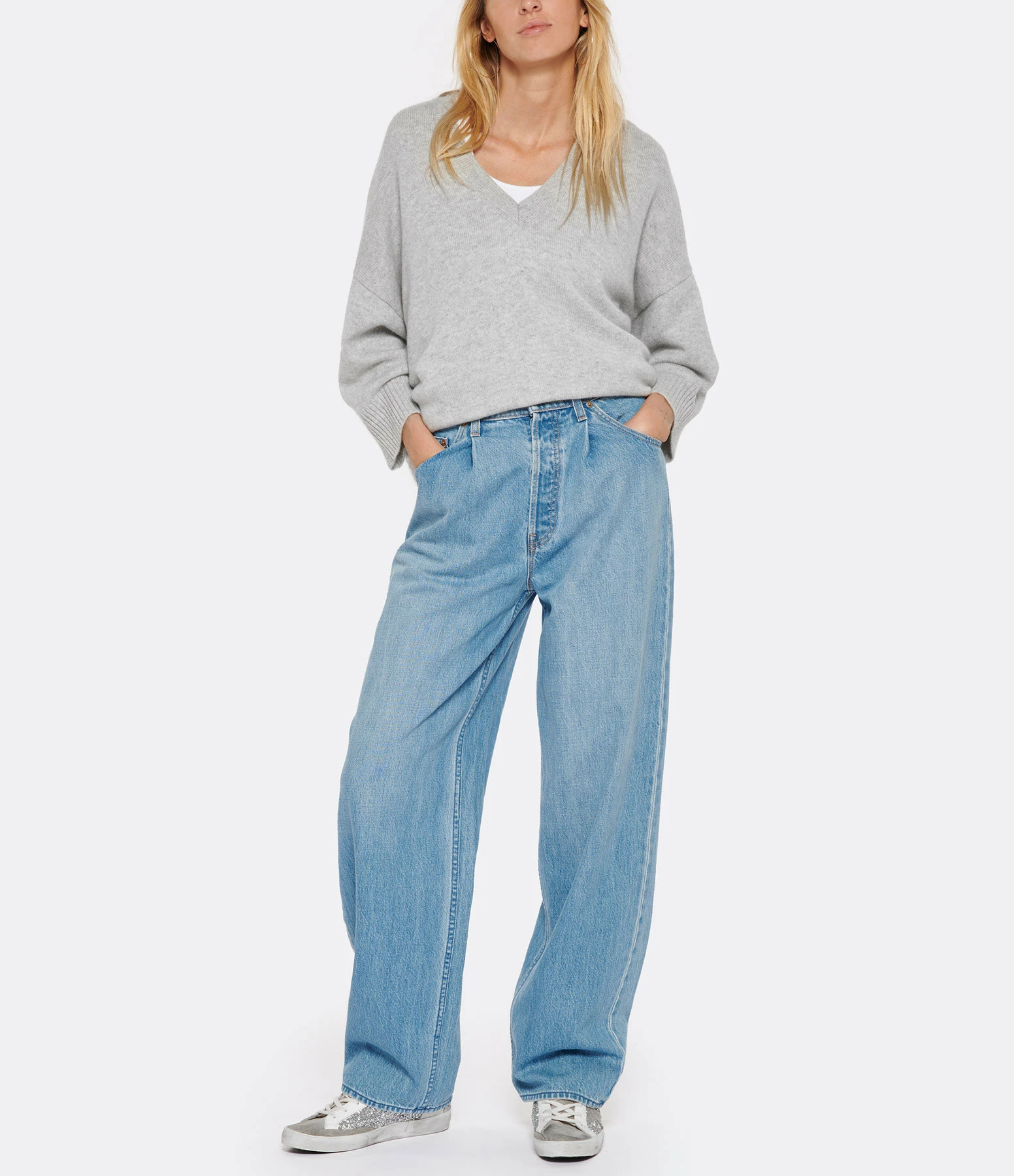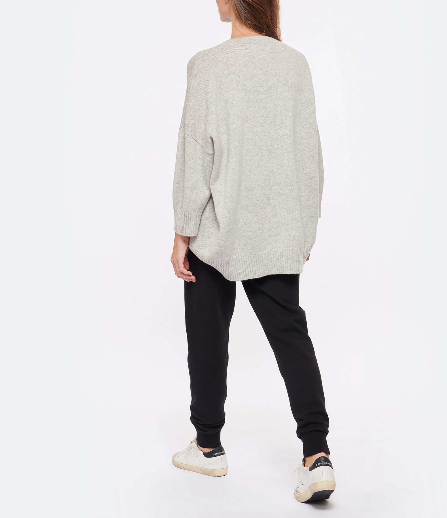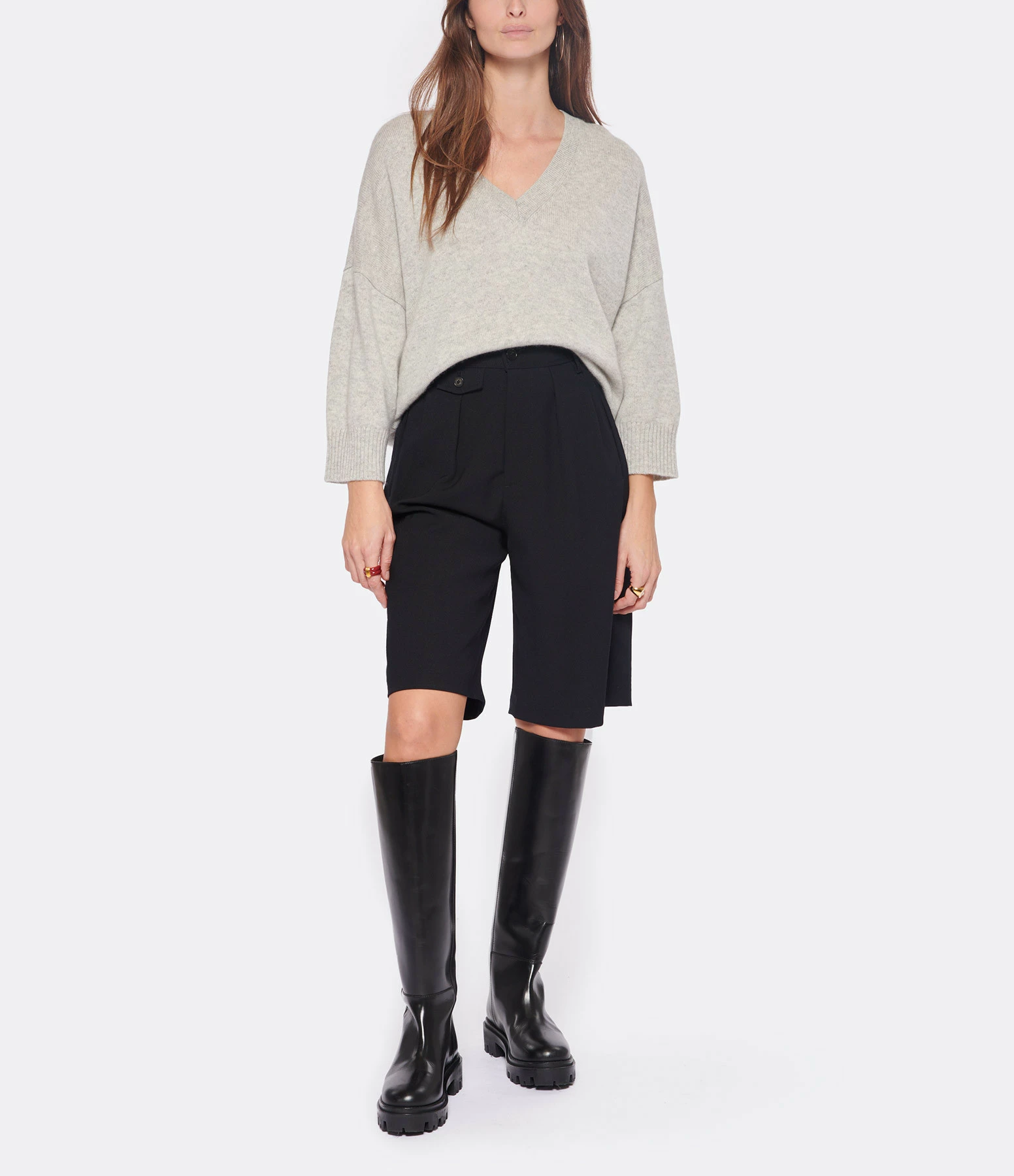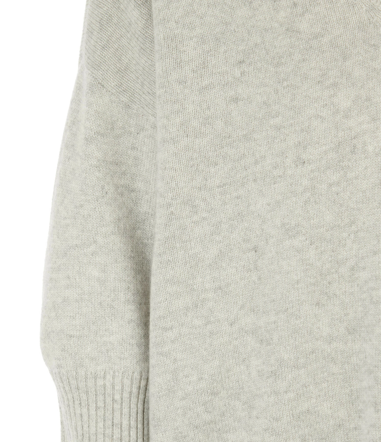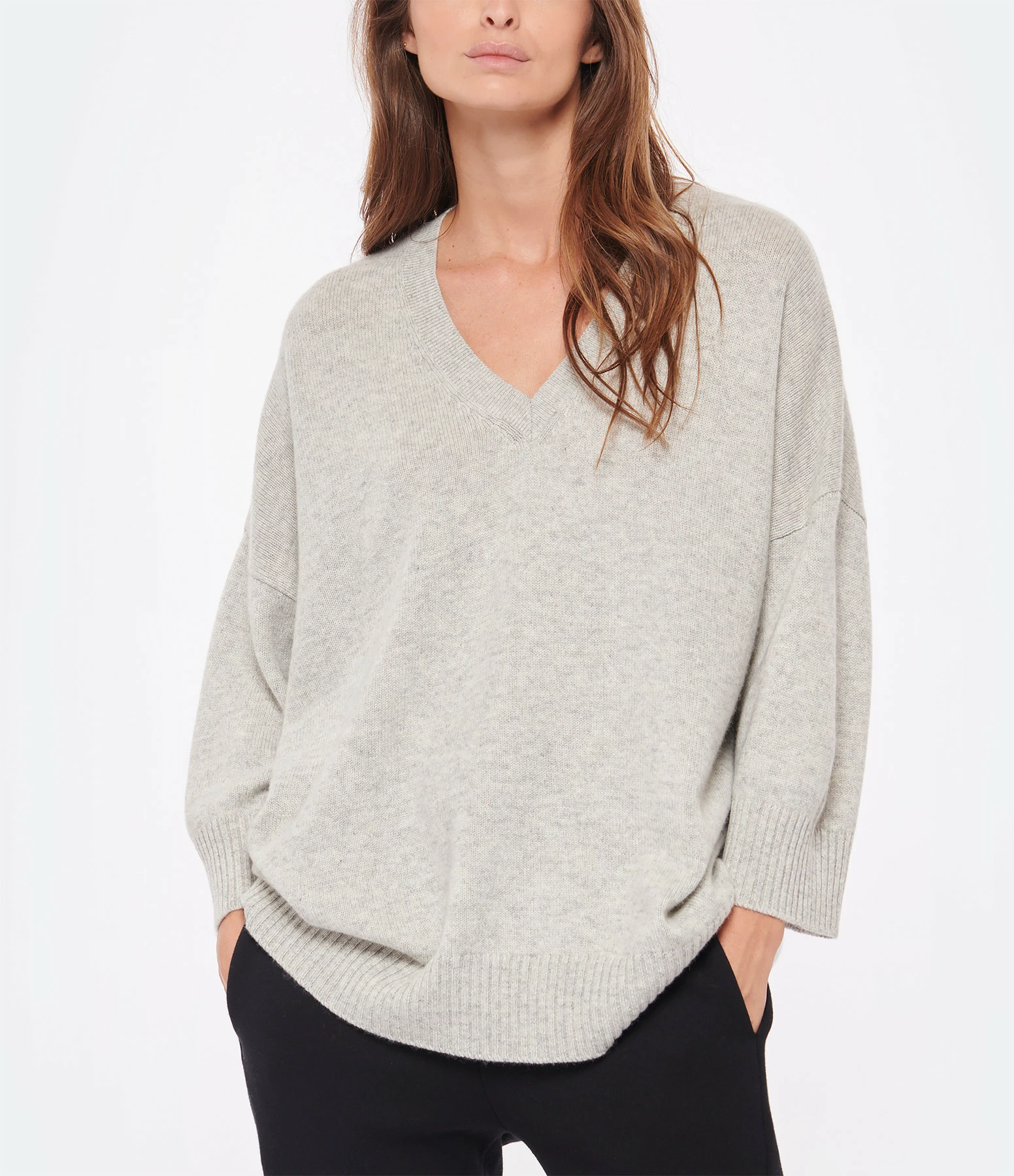 Pull en cachemire gris. Col V. Manches 3/4 avec poignets côtelés. Coupe droite. Base droite.