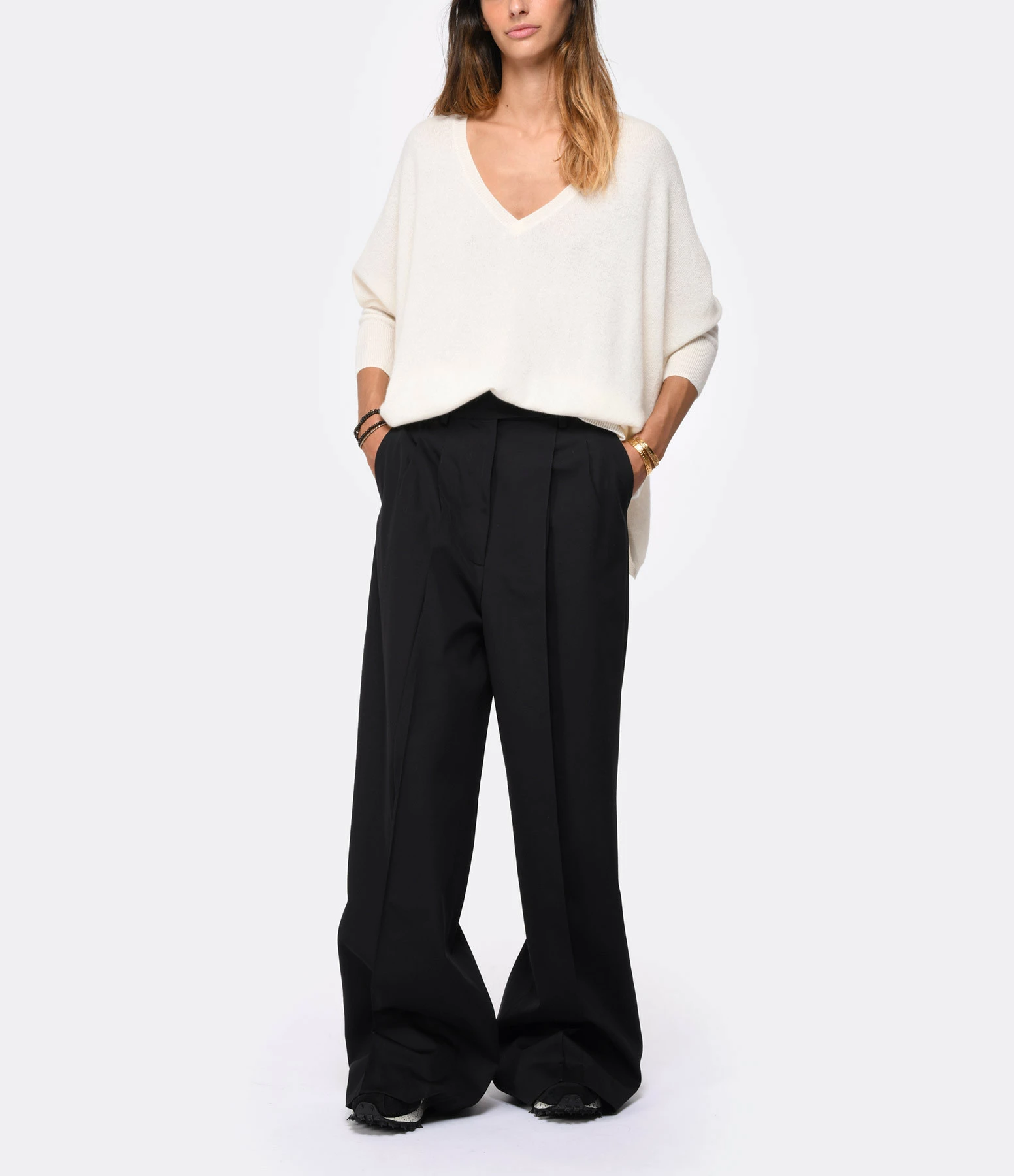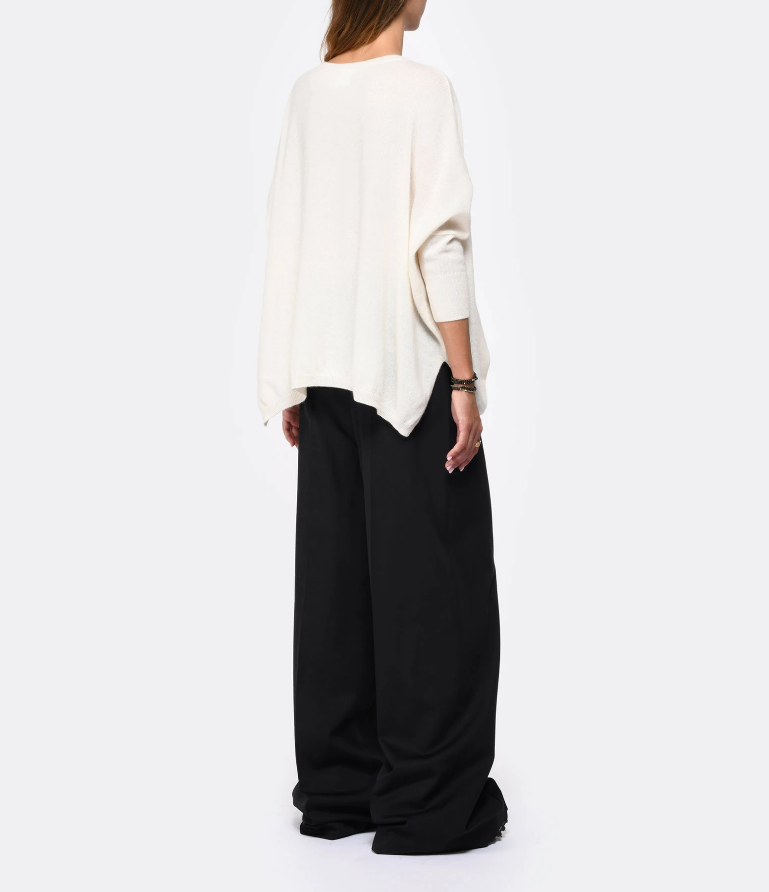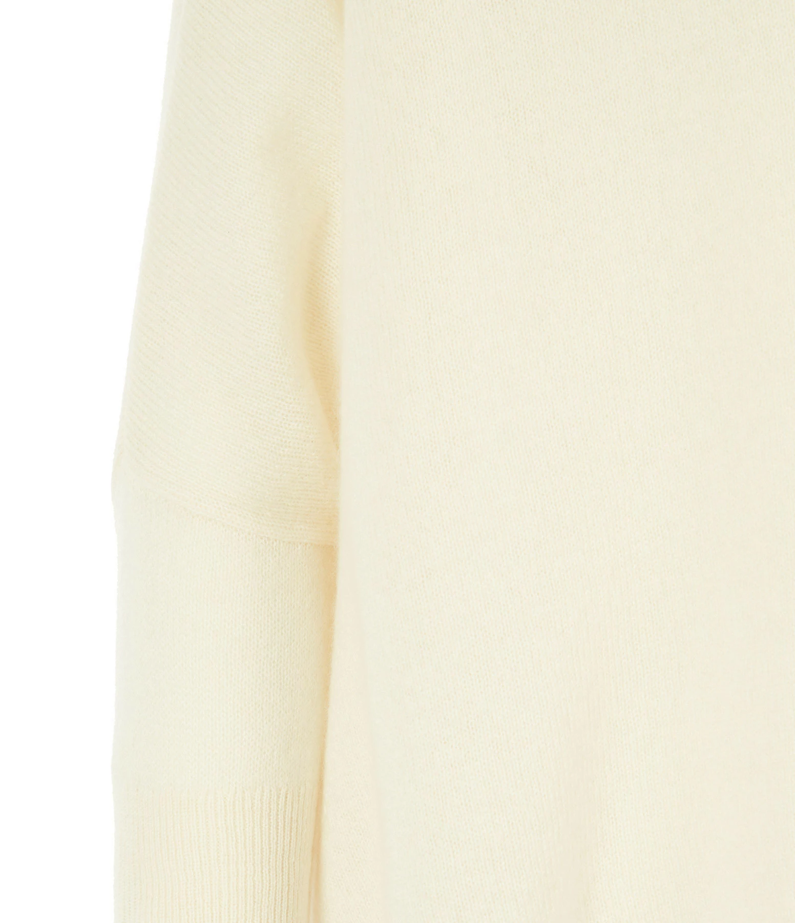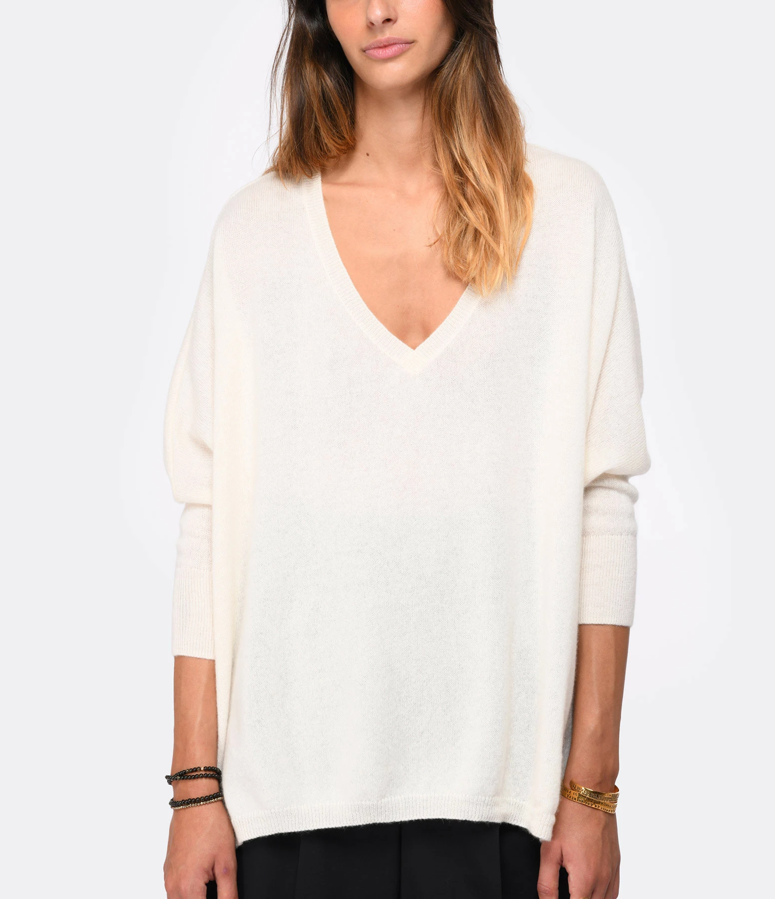Pull en tricot jersey de cachemire blanc. Col en V côtelé. Manches longues avec poignets côtelés. Fentes latérales. Coupe oversize. Base droite côtelée.