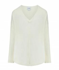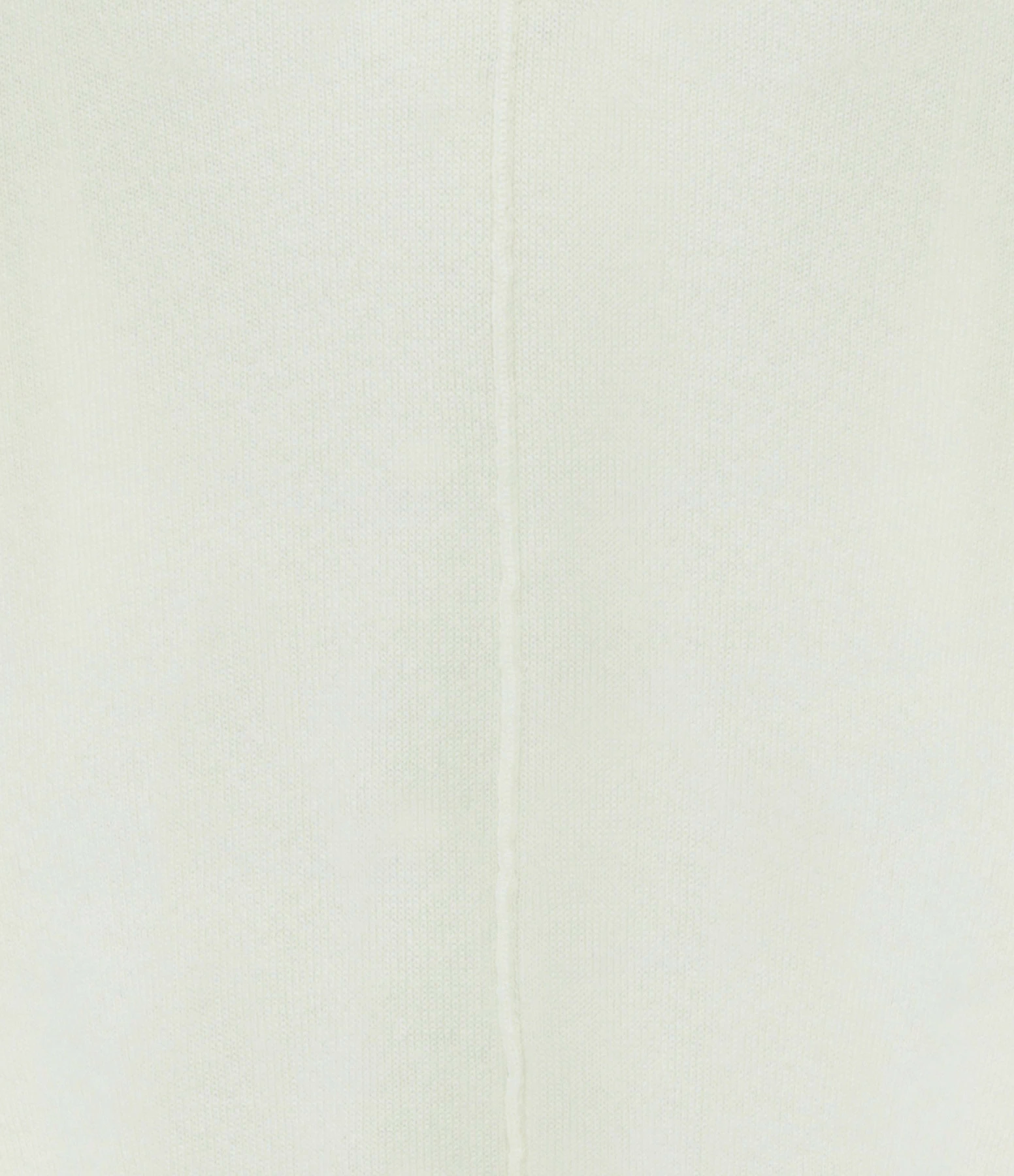 Pull en cachemire écru. Col en V. Manches longues. Coupe oversize et base arrondie.