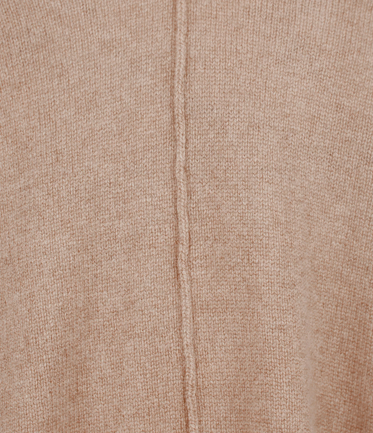 Pull en cachemire camel. Col V. Manches longues. Coupe large. Base arrondie.