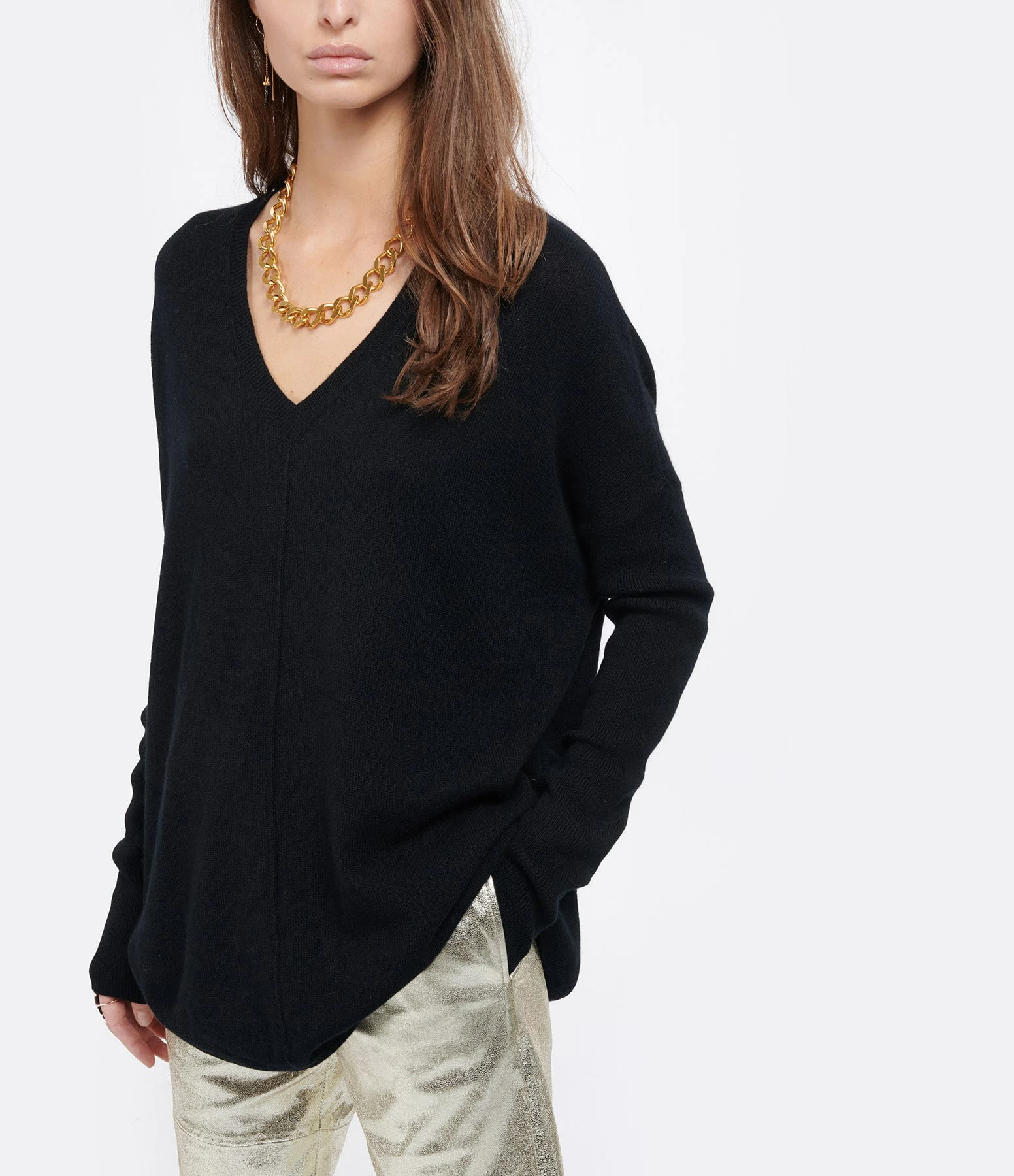 Pull en cachemire noir. Col en V. Manches longues. Coupe oversize et base arrondie.