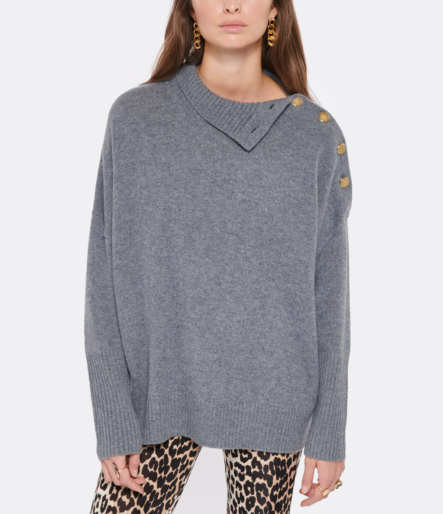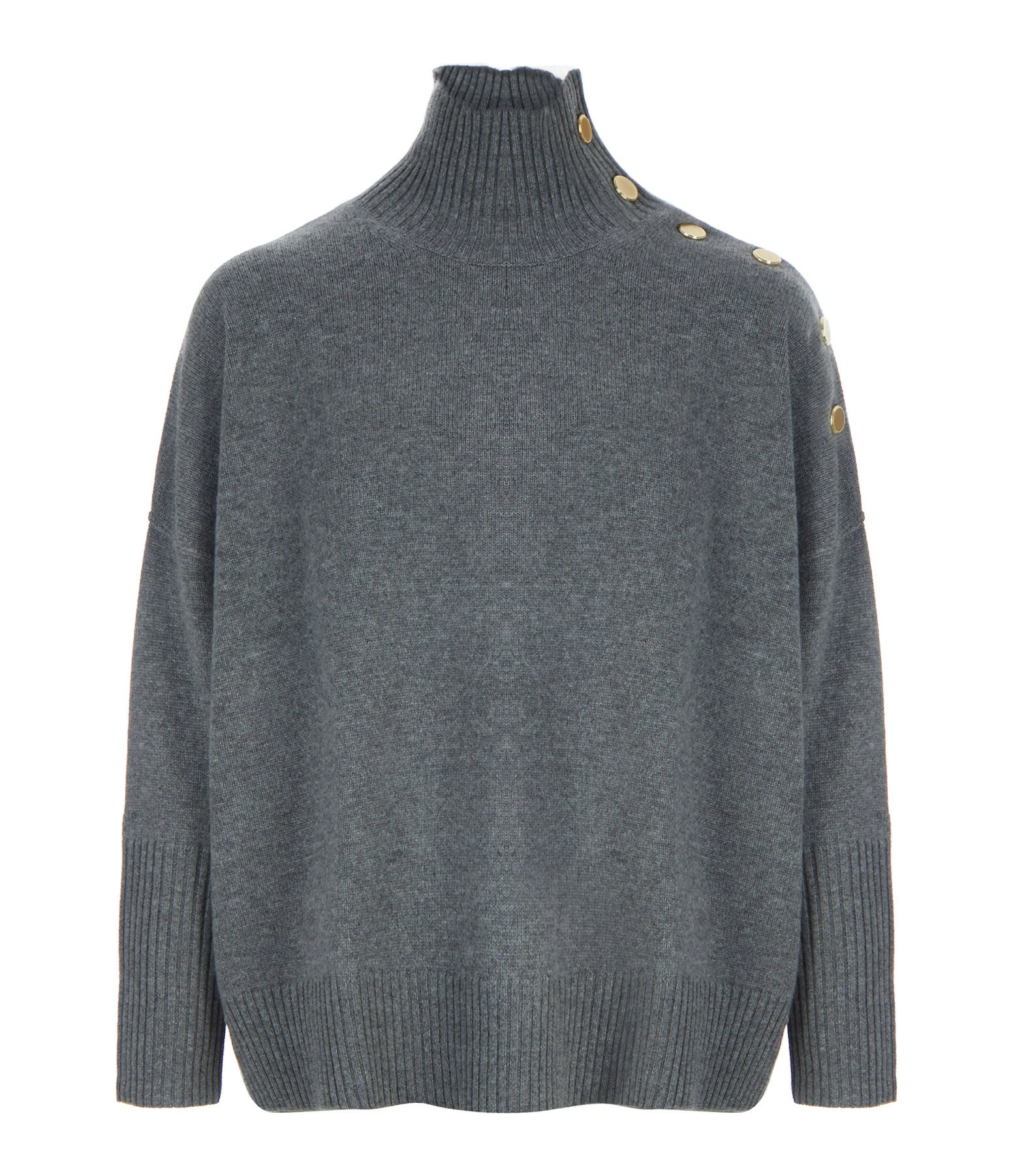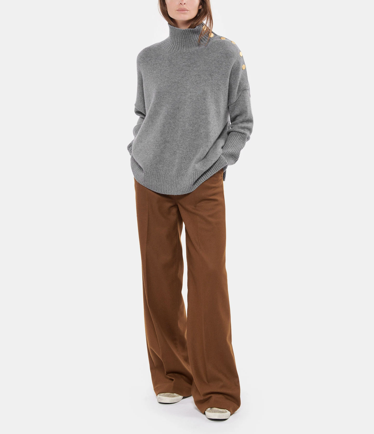 Pull en cachemire gris. Col montant côtelé avec boutons dorés. Manches longues resserrées aux poignets. Coupe ample. Base droite côtelée.