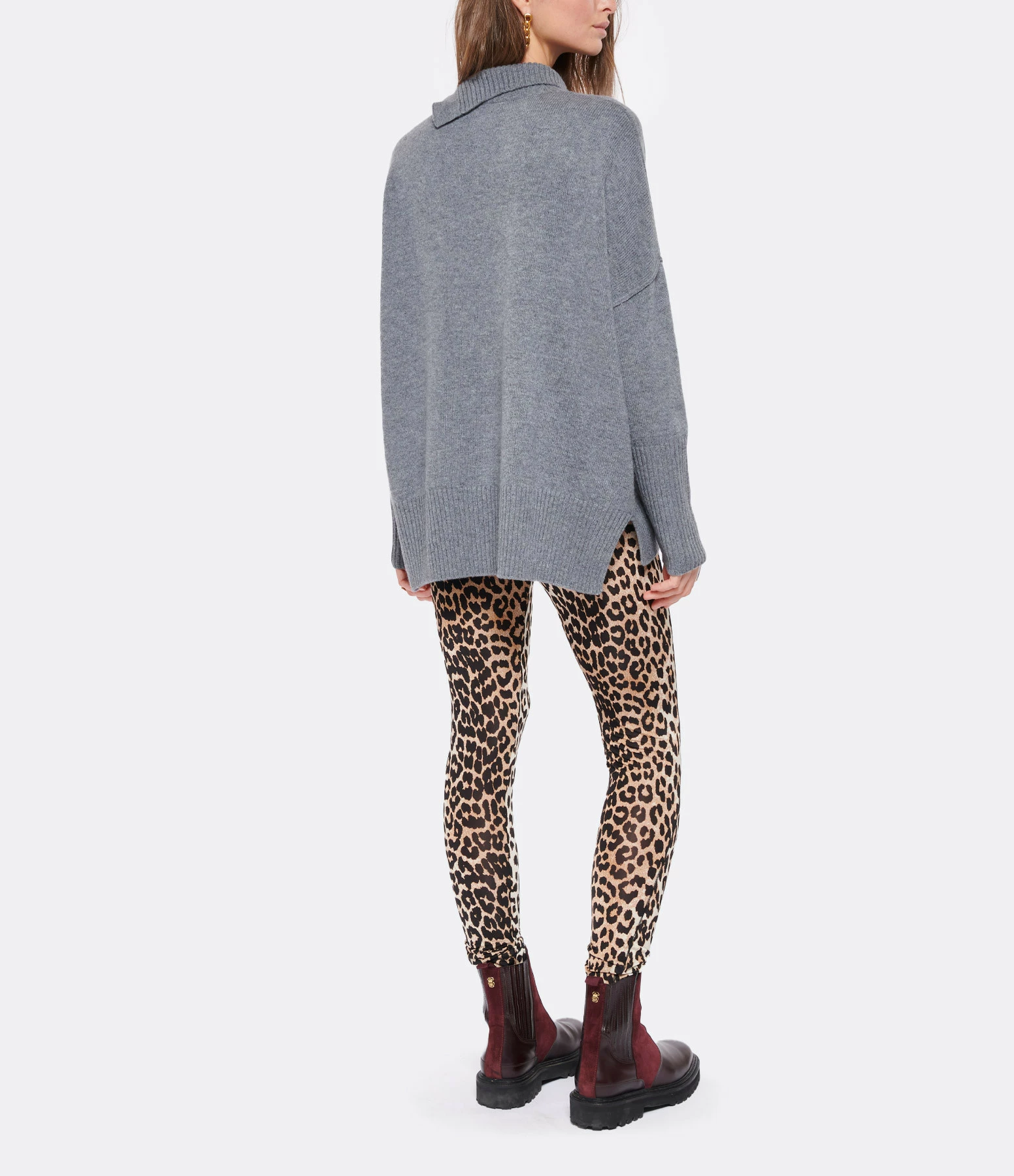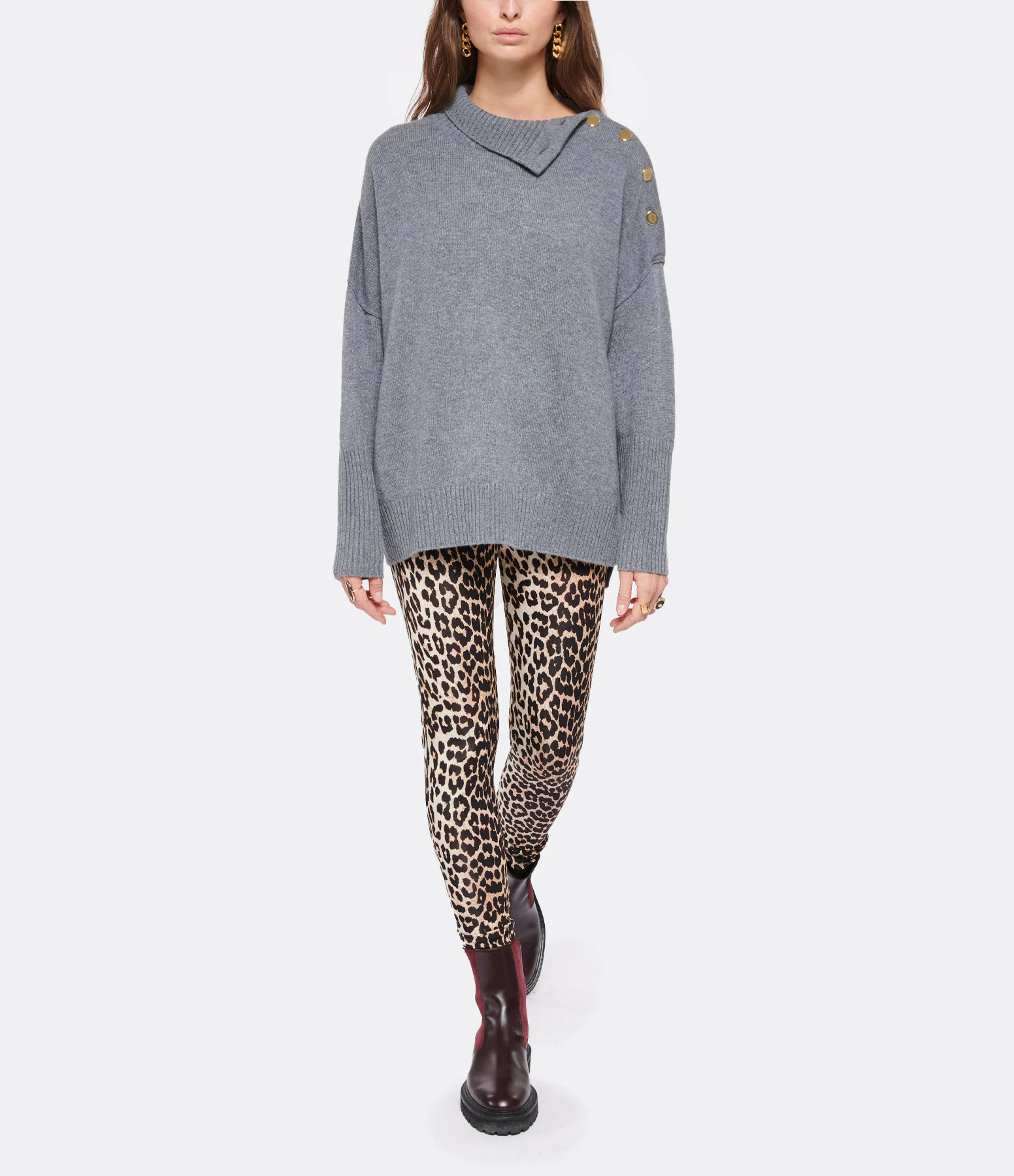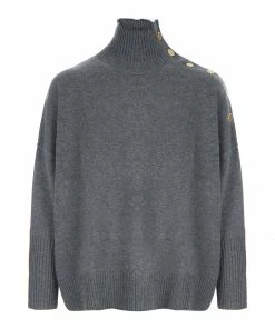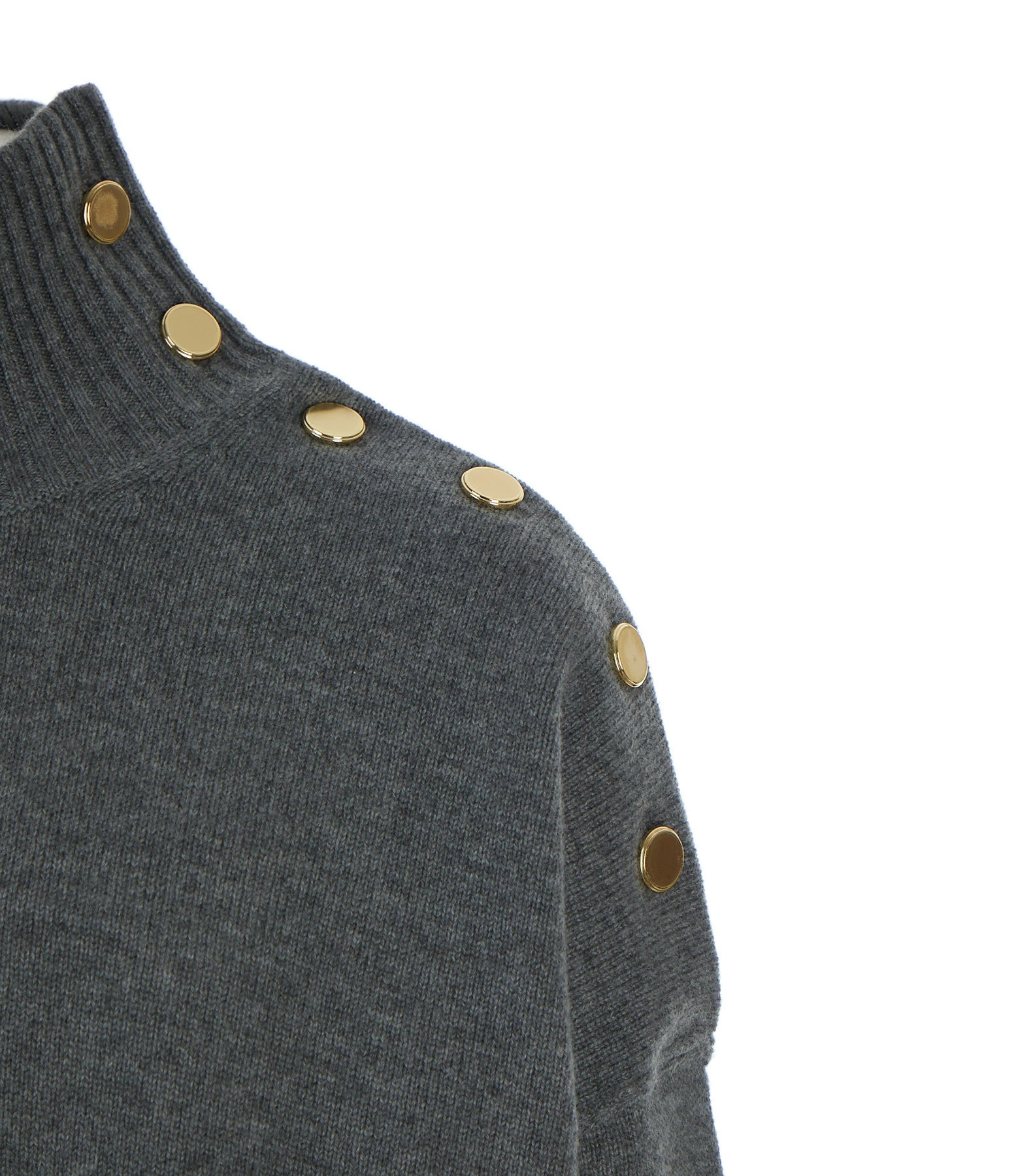 Pull en cachemire gris. Col montant côtelé avec boutons dorés. Manches longues resserrées aux poignets. Coupe ample. Base droite côtelée.