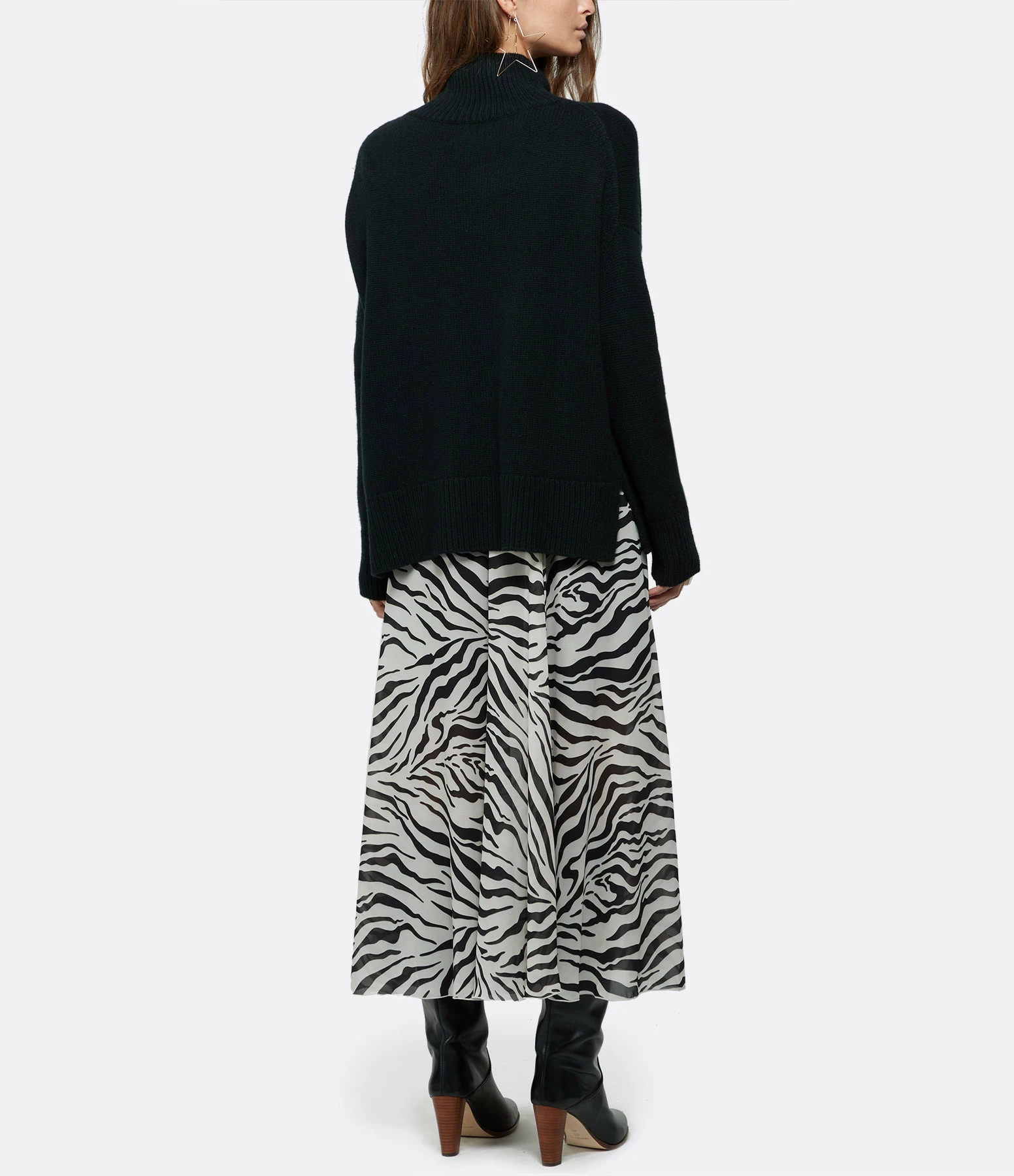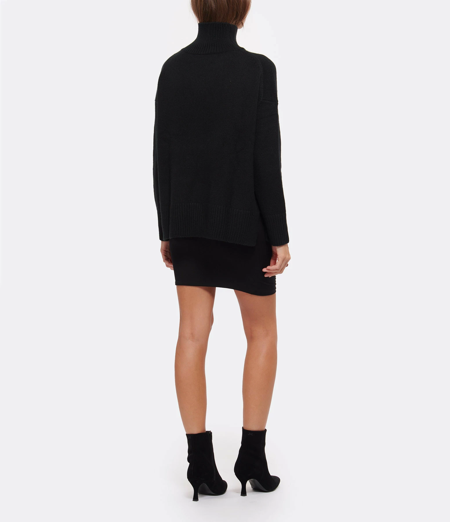 Pull en cachemire noir. Col cheminé côtelé. Manches longues avec poignets côtelés. Coupe oversize. Base droite côtelée et légèrement fendue sur les côtés. Non doublé.