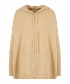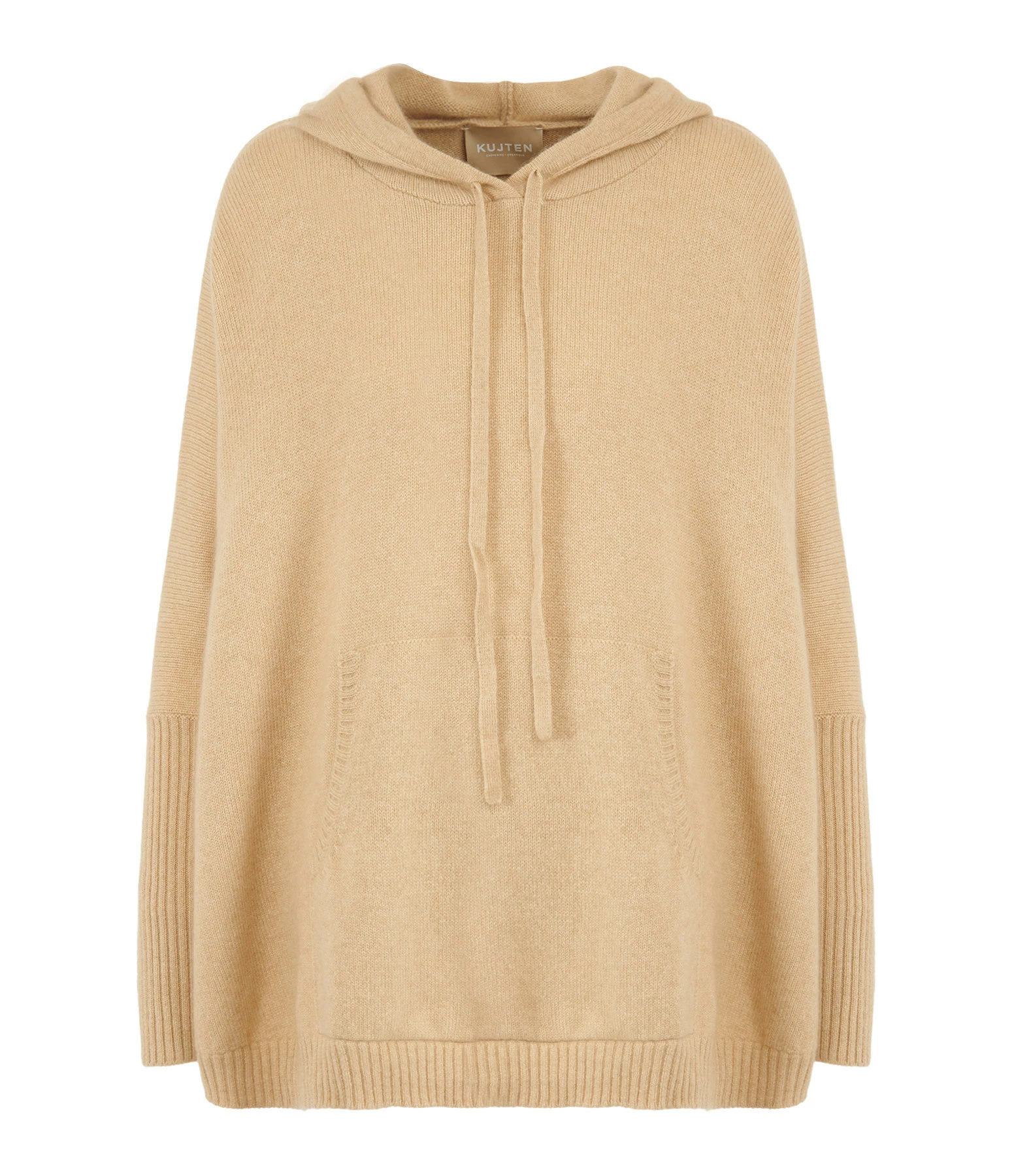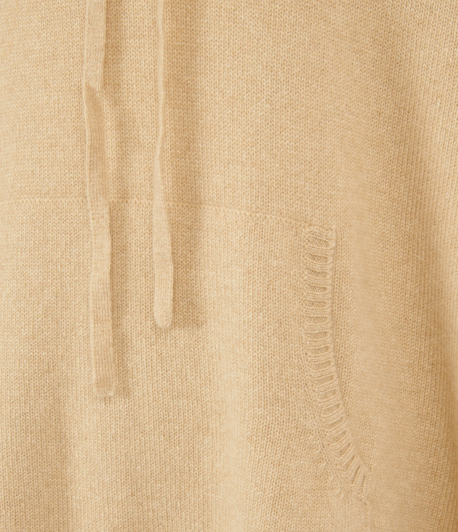 Hoodie en cachemire beige. Capuche avec liens de serrage. Col rond. Manches longues. Poche kangourou. Coupe oversize. Base droite. Non doublé.