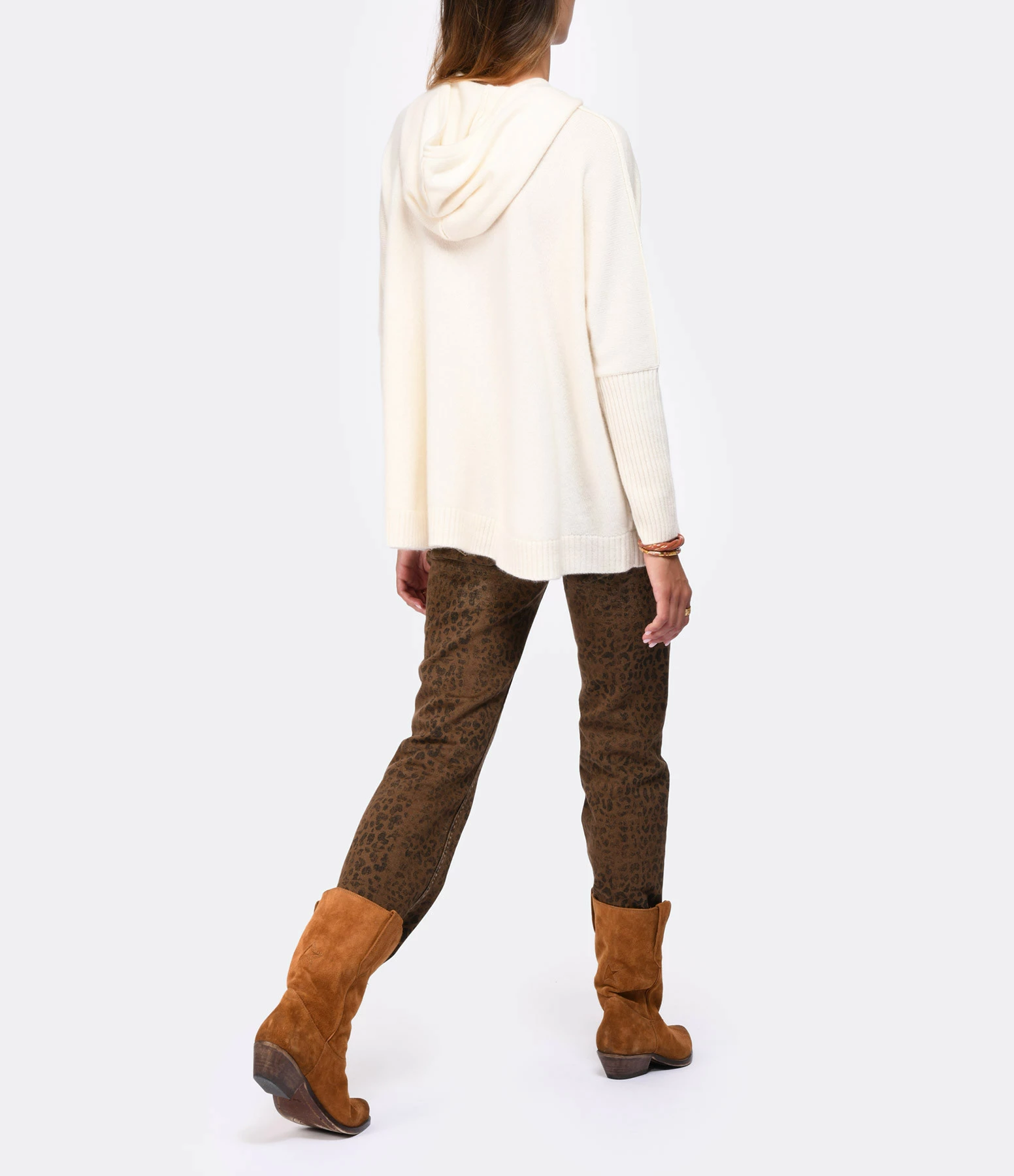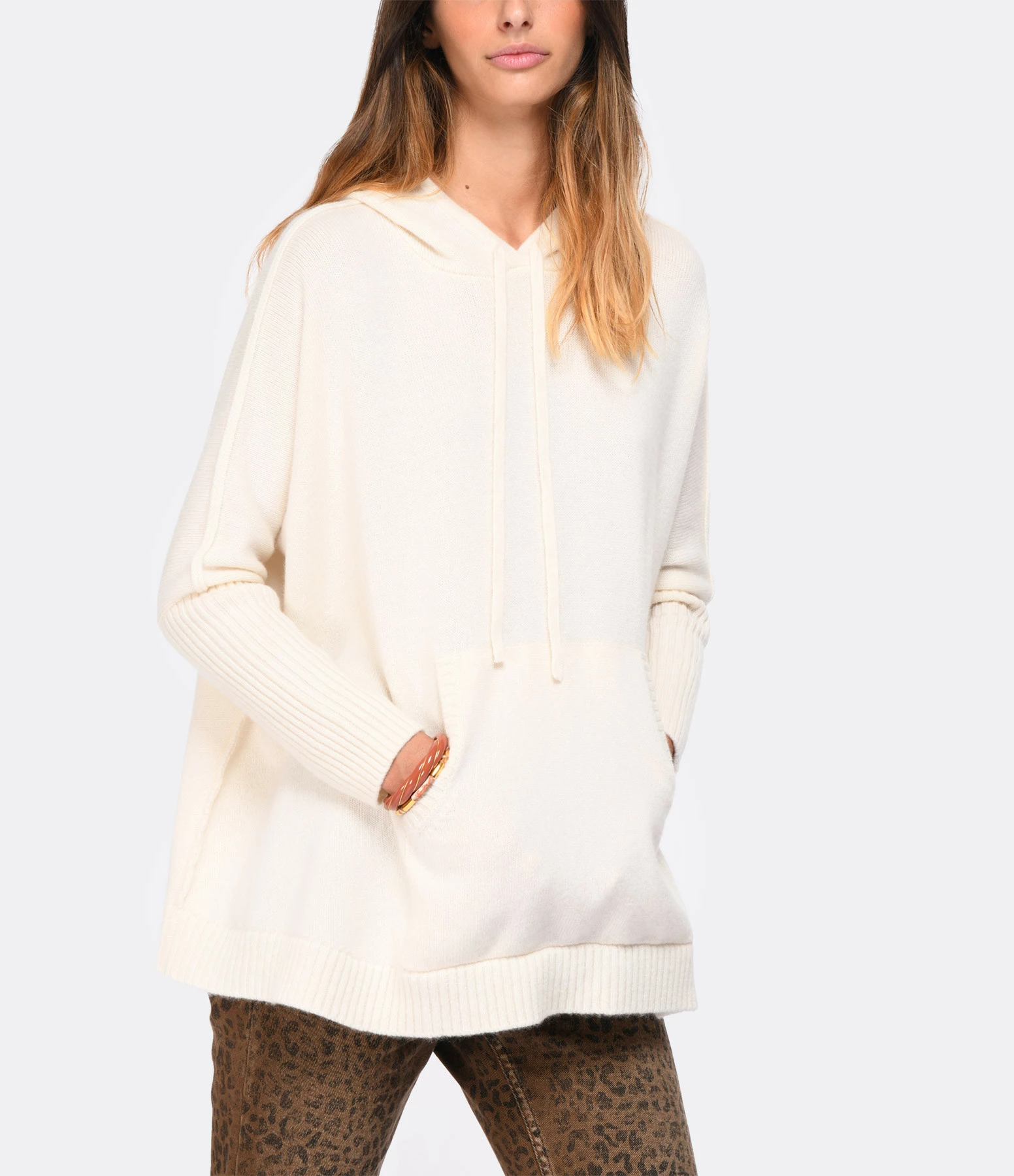 Hoodie en cachemire blanc. Capuche avec liens de serrage. Col rond. Manches longues. Poche kangourou. Coupe oversize. Base droite. Non doublé.