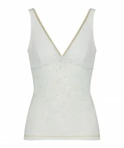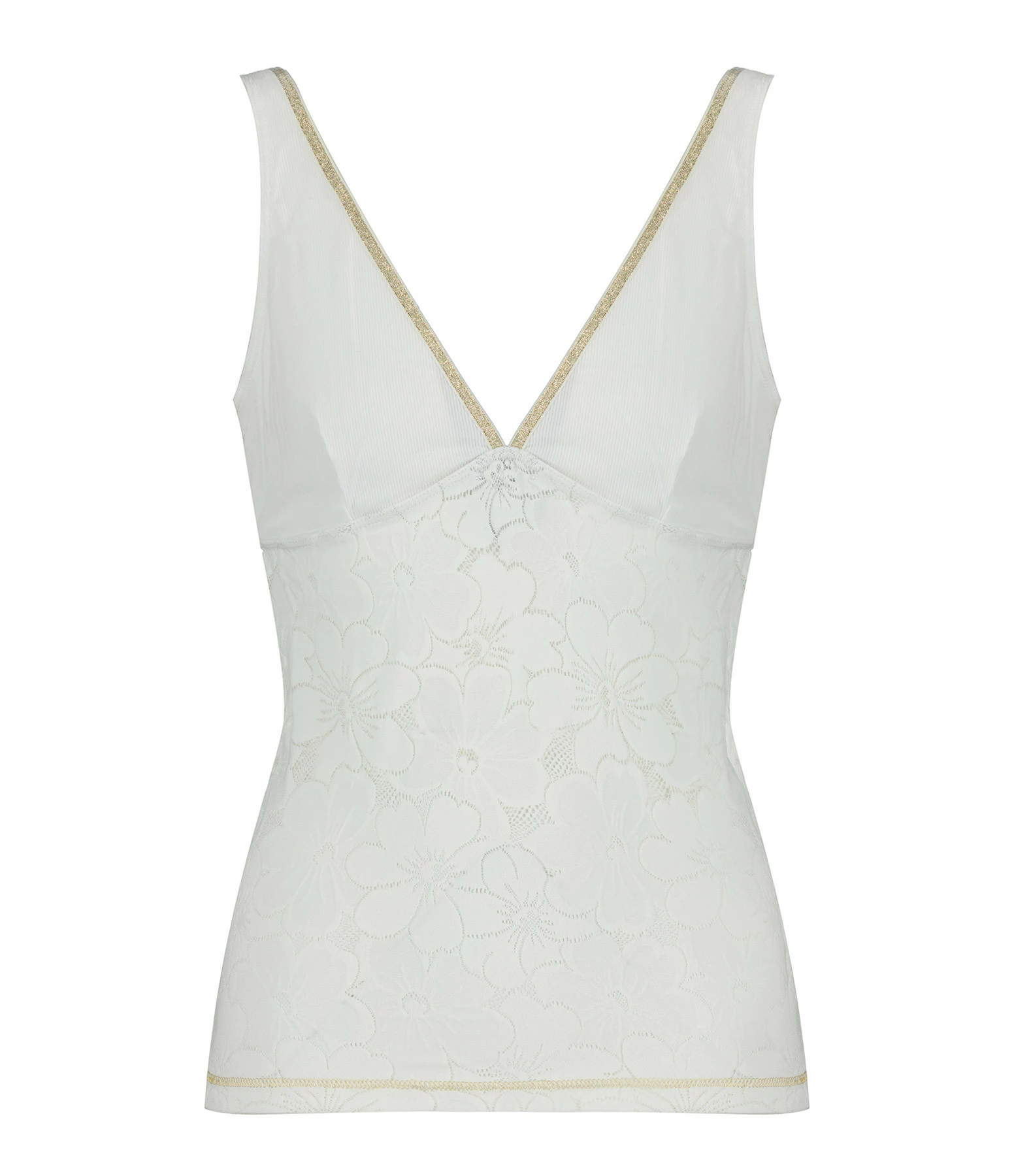 Top en tricot côtelé et dentelles à motif floral blanc. Décolleté en V plongeant orné d’un liseré doré pailleté. Échancré dans le dos. Sans manches. Bretelles. Élastique de maintien sous la poitrine pour plus de confort. Coupe près du corps. Base droite.