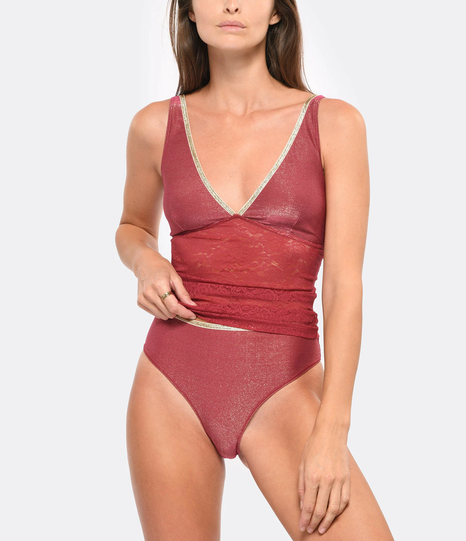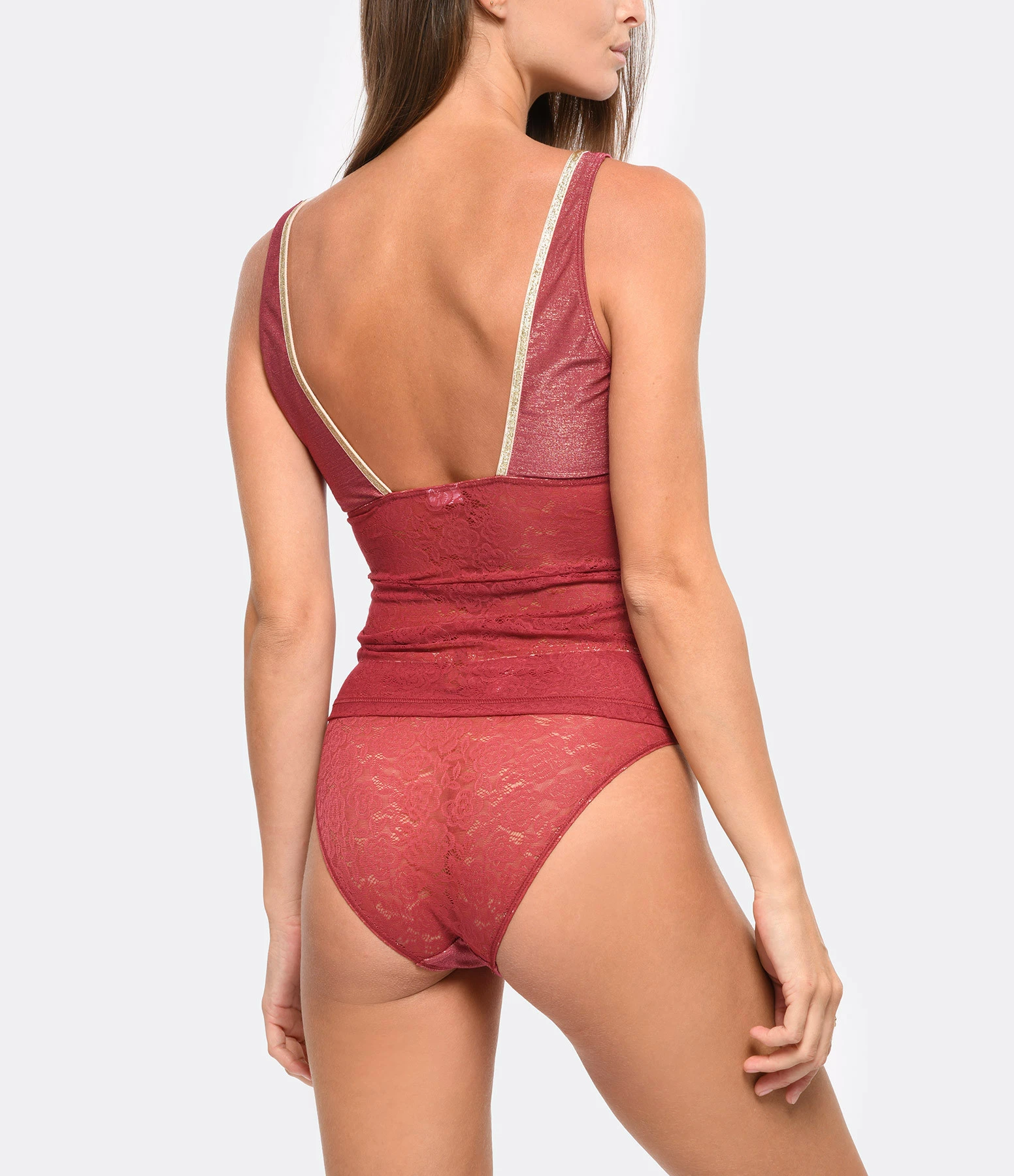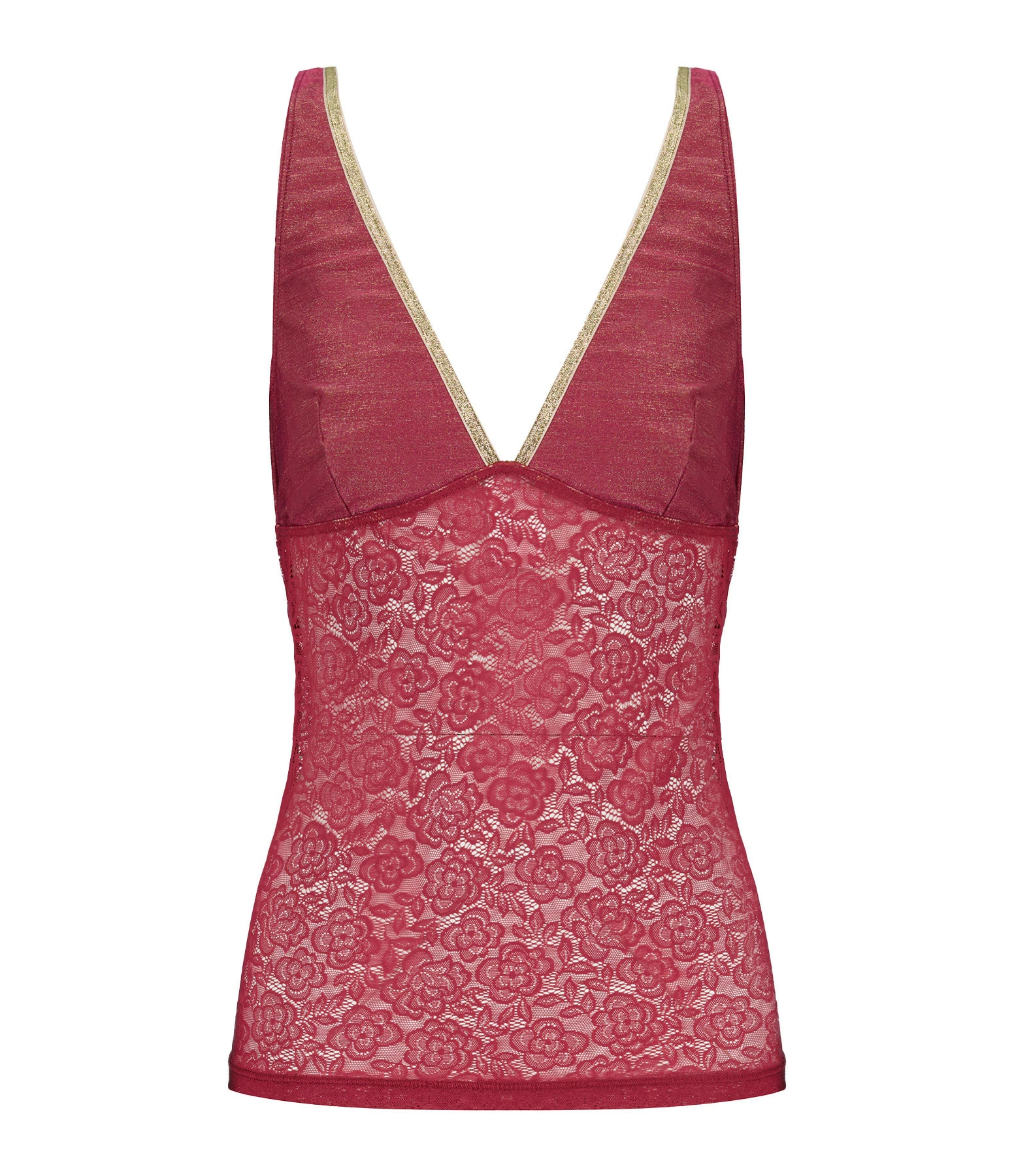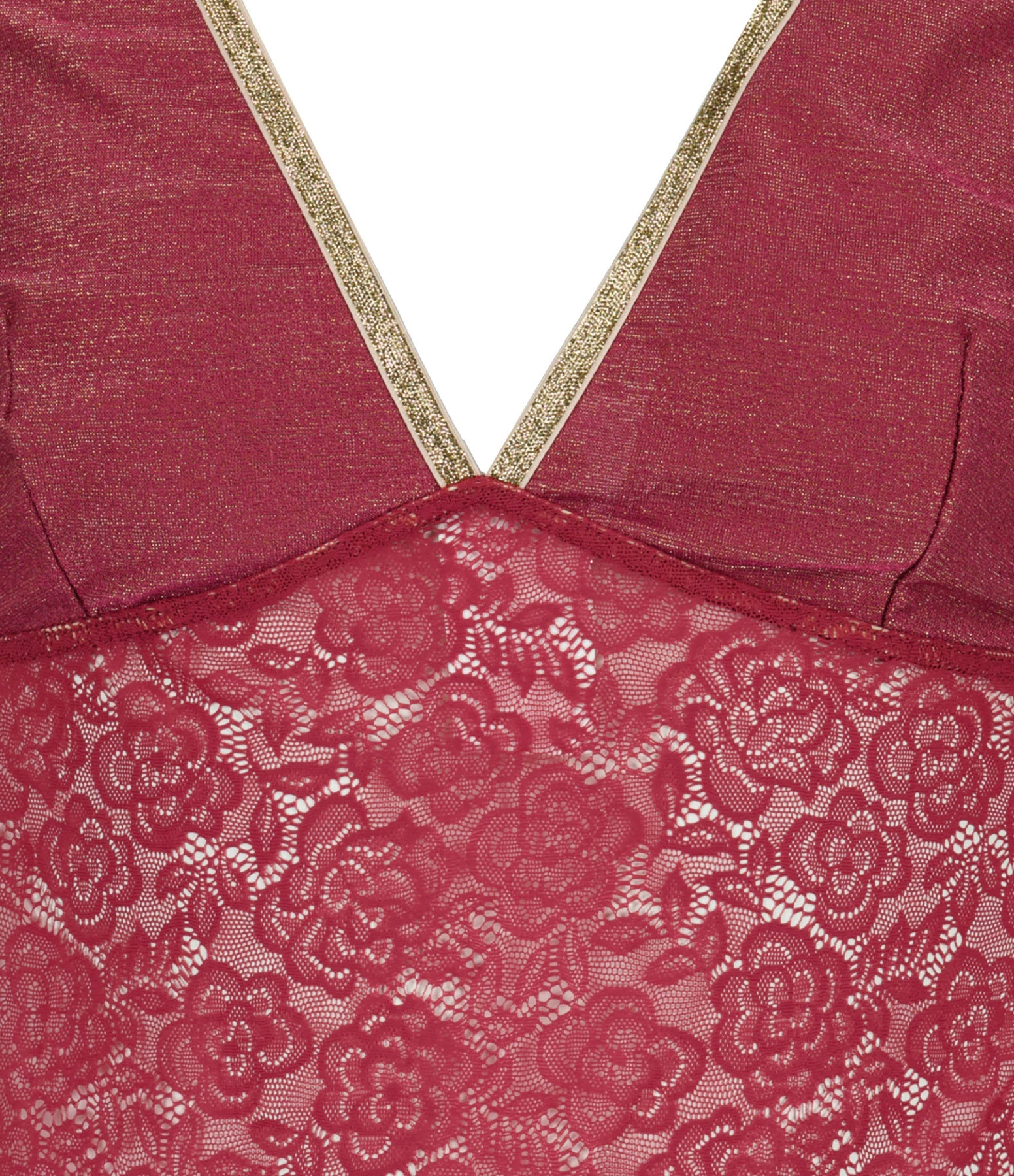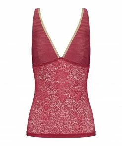 Top en tricot côtelé et dentelles à motif floral rouge. Décolleté en V plongeant orné d’un liseré doré pailleté. Échancré dans le dos. Sans manches. Bretelles. Élastique de maintien sous la poitrine pour plus de confort. Coupe près du corps. Base droite.
