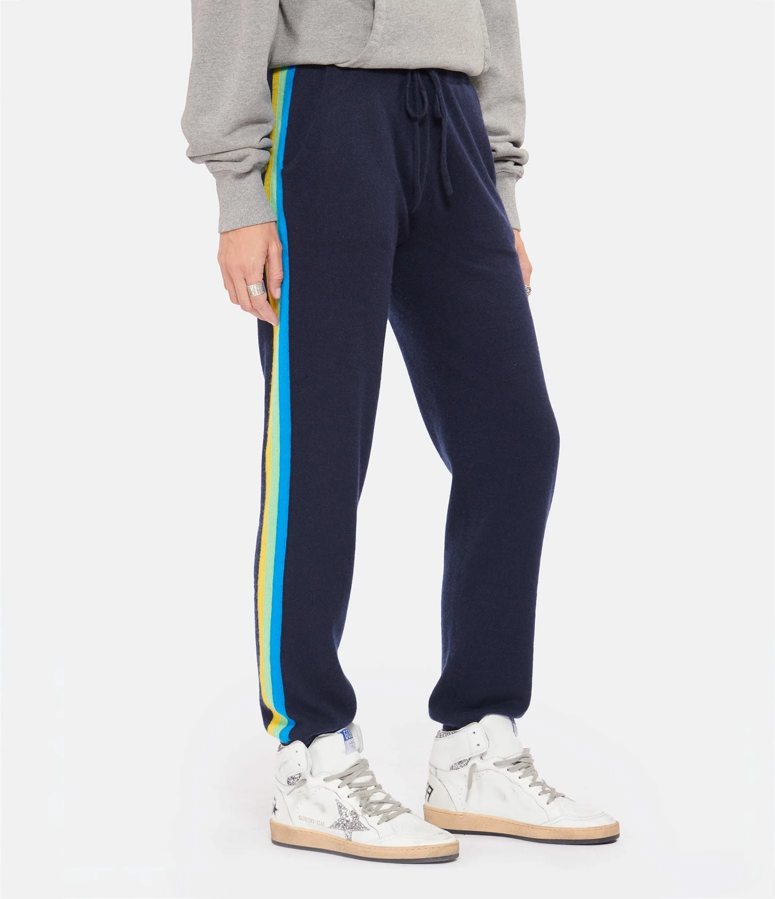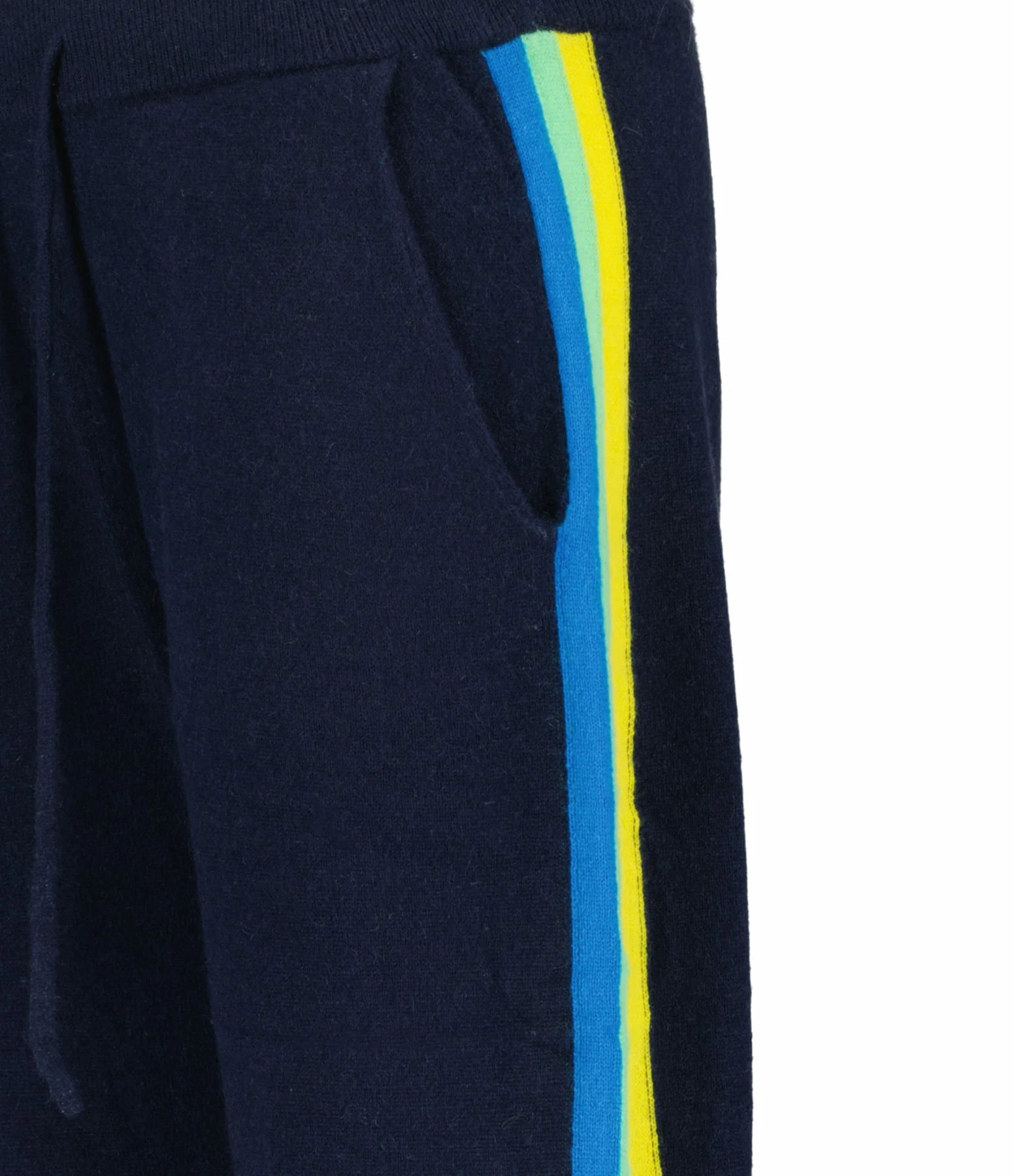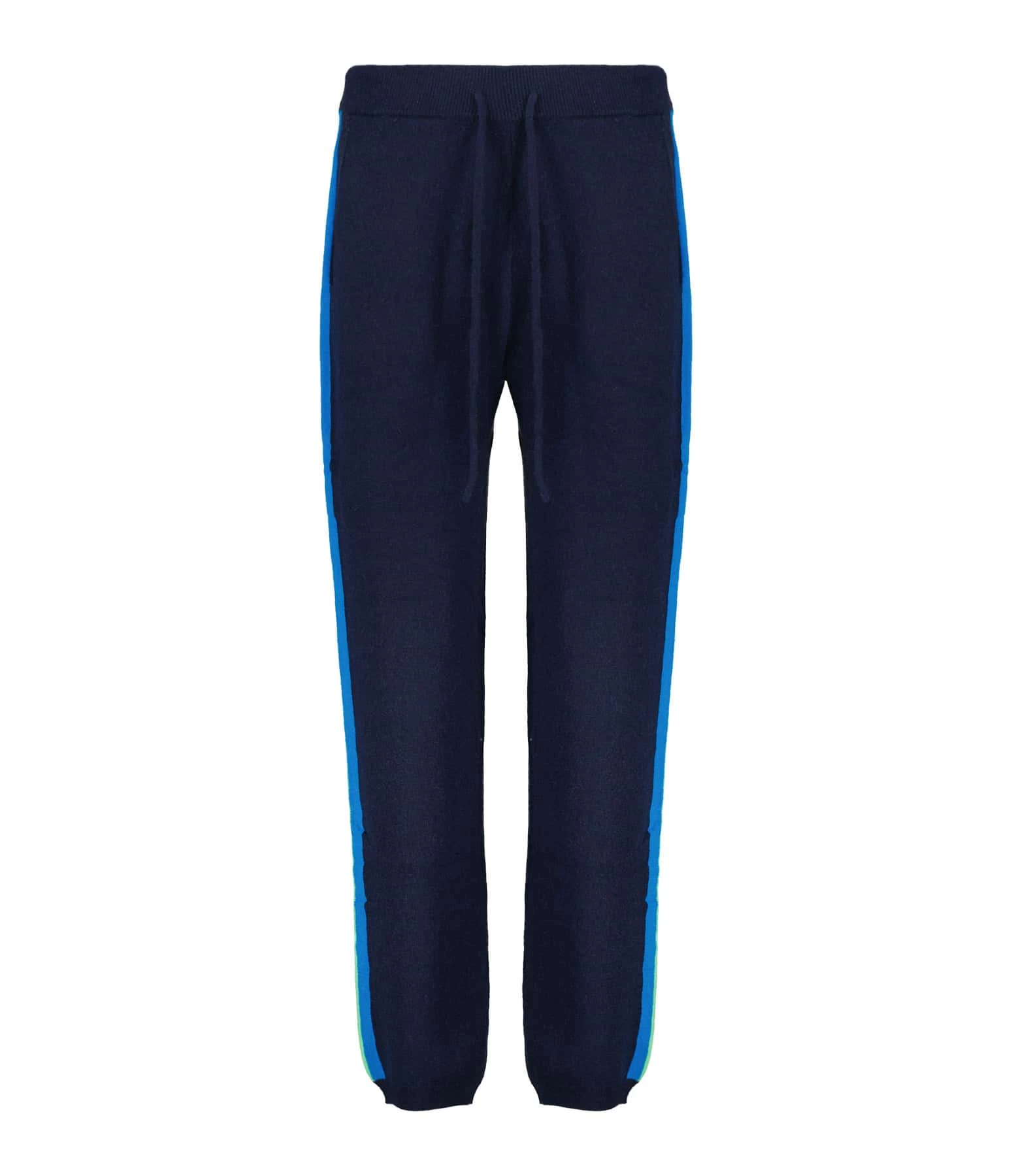 Jogging en cachemire bleu marine orné d’une bande de rayures tricolores fluos (bleu, vert et jaune) imprimée de chaque côté. Taille élastiquée avec cordon de serrage. Deux poches italiennes latérales. Coupe droite loose.