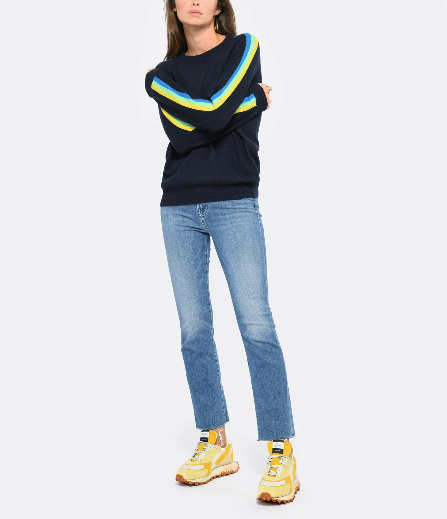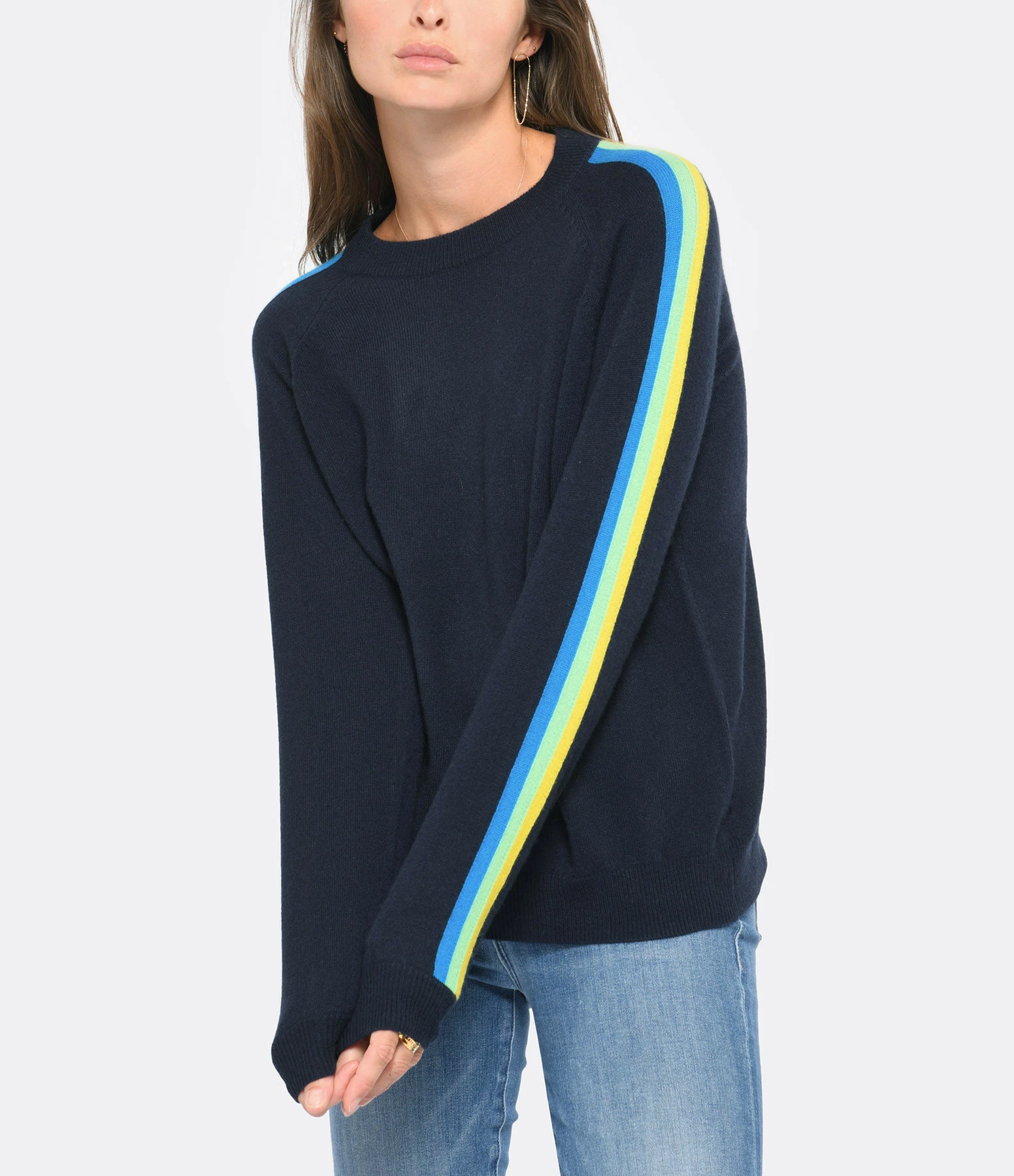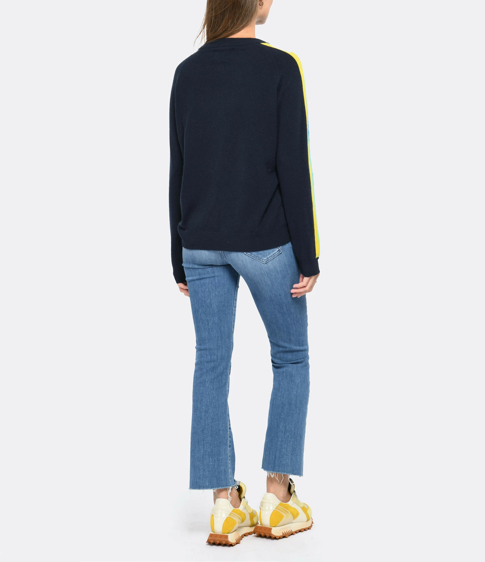 Pull en cachemire bleu marine avec trois bandes tricolores (jaune, vert et bleu) le long des manches. Col rond côtelé. Manches longues avec poignets côtelés. Coupe droite. Base droite côtelée.