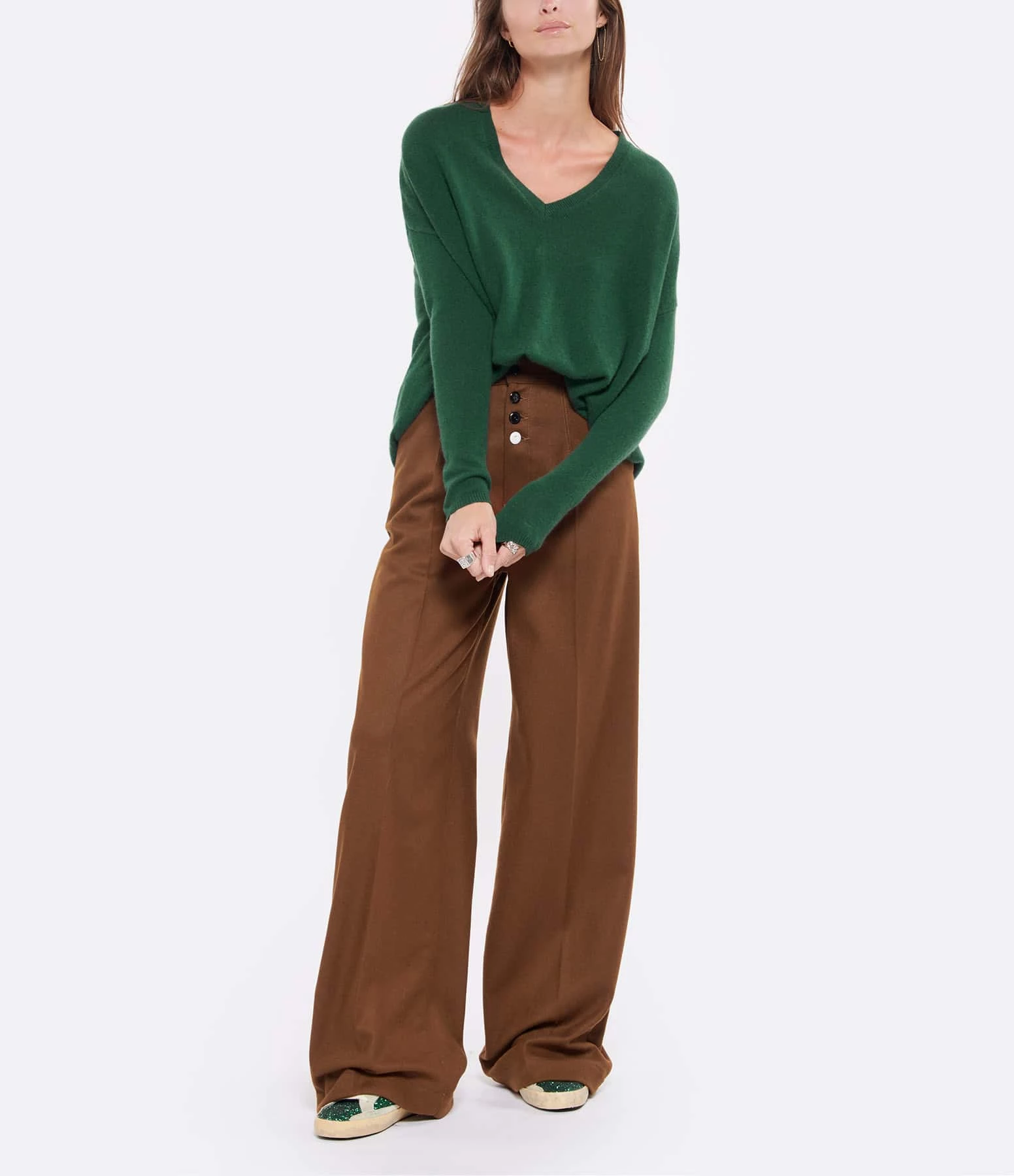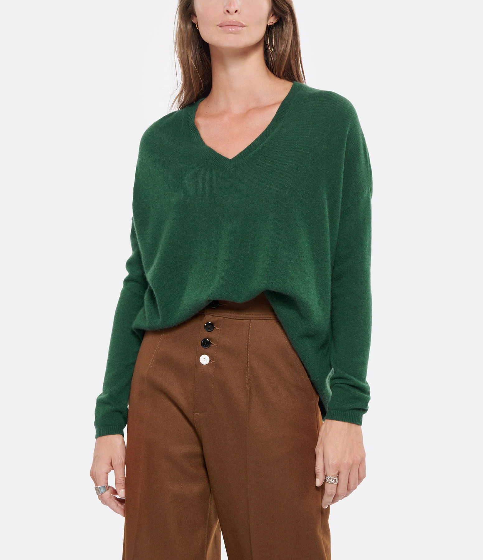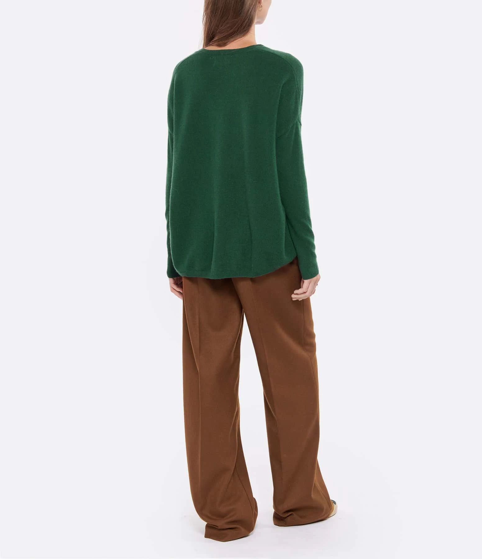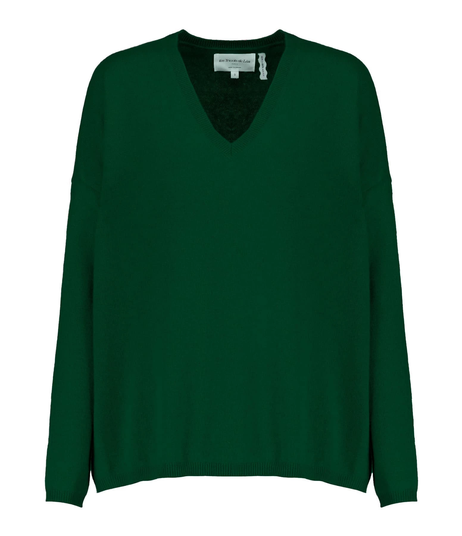 Pull en cachemire vert. Col V. Manches longues. Coupe ample. Base droite.