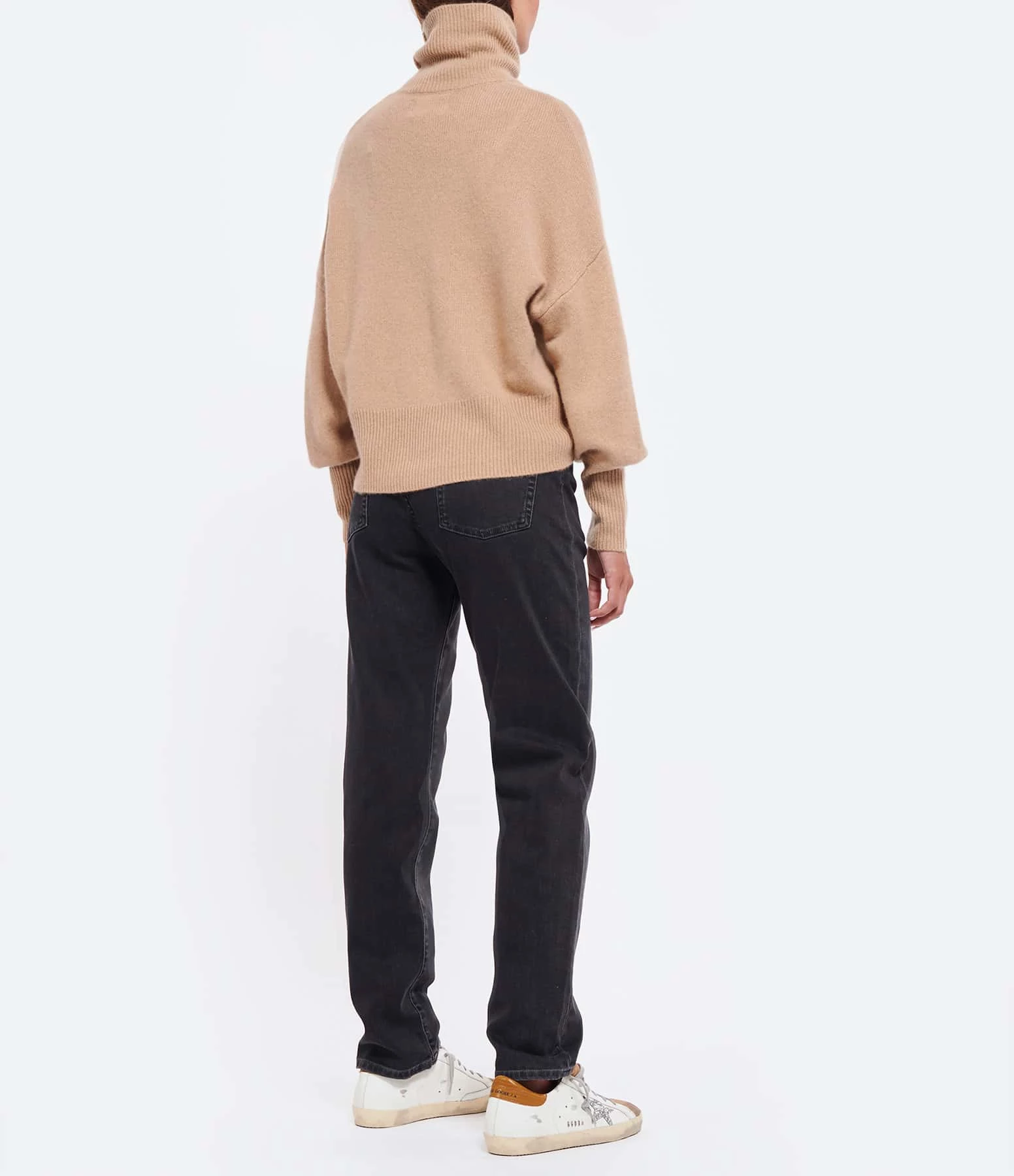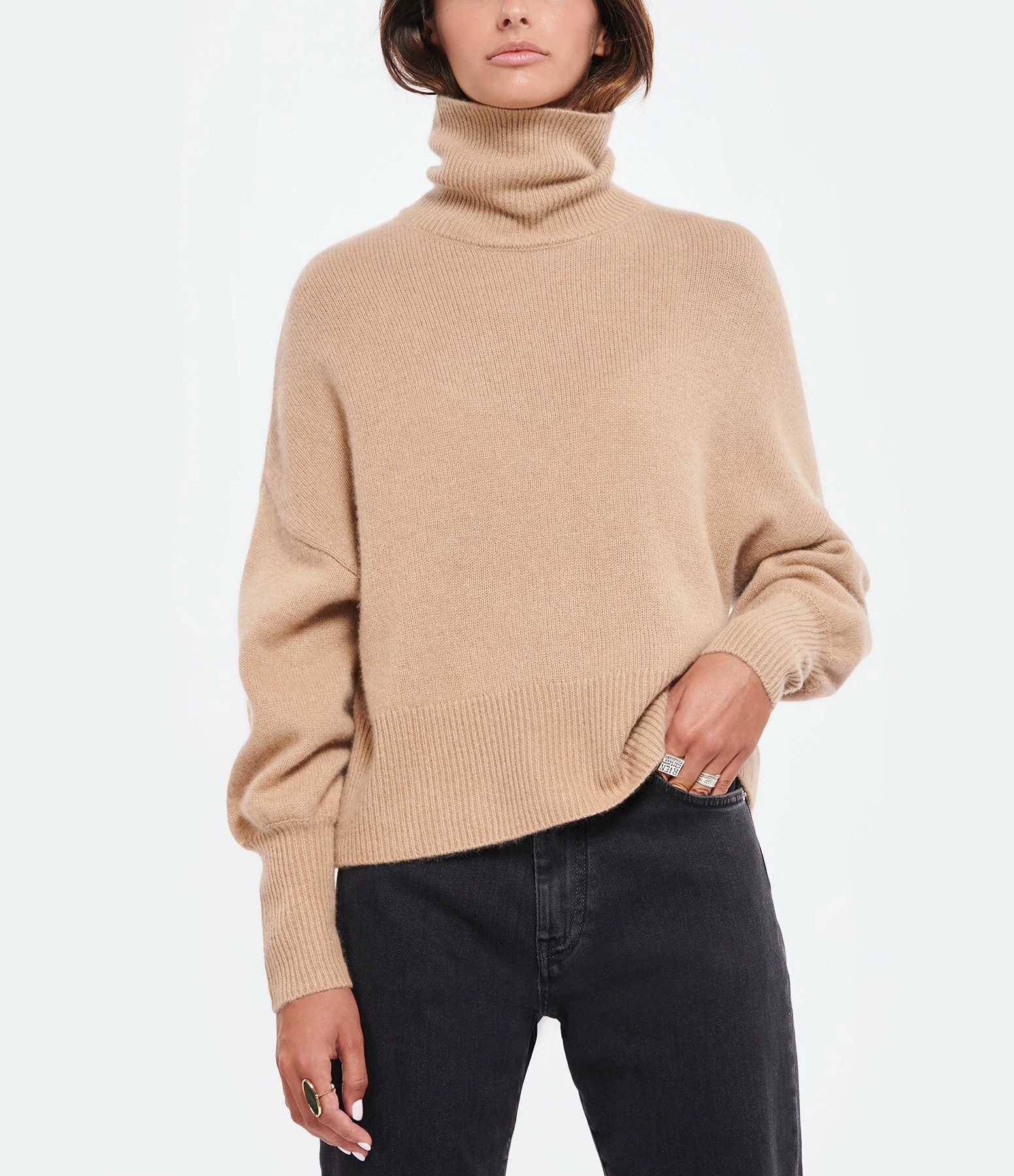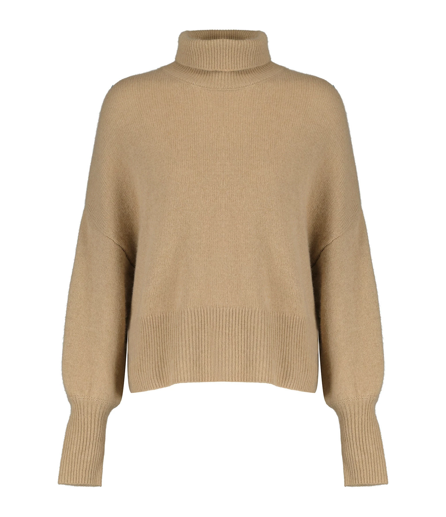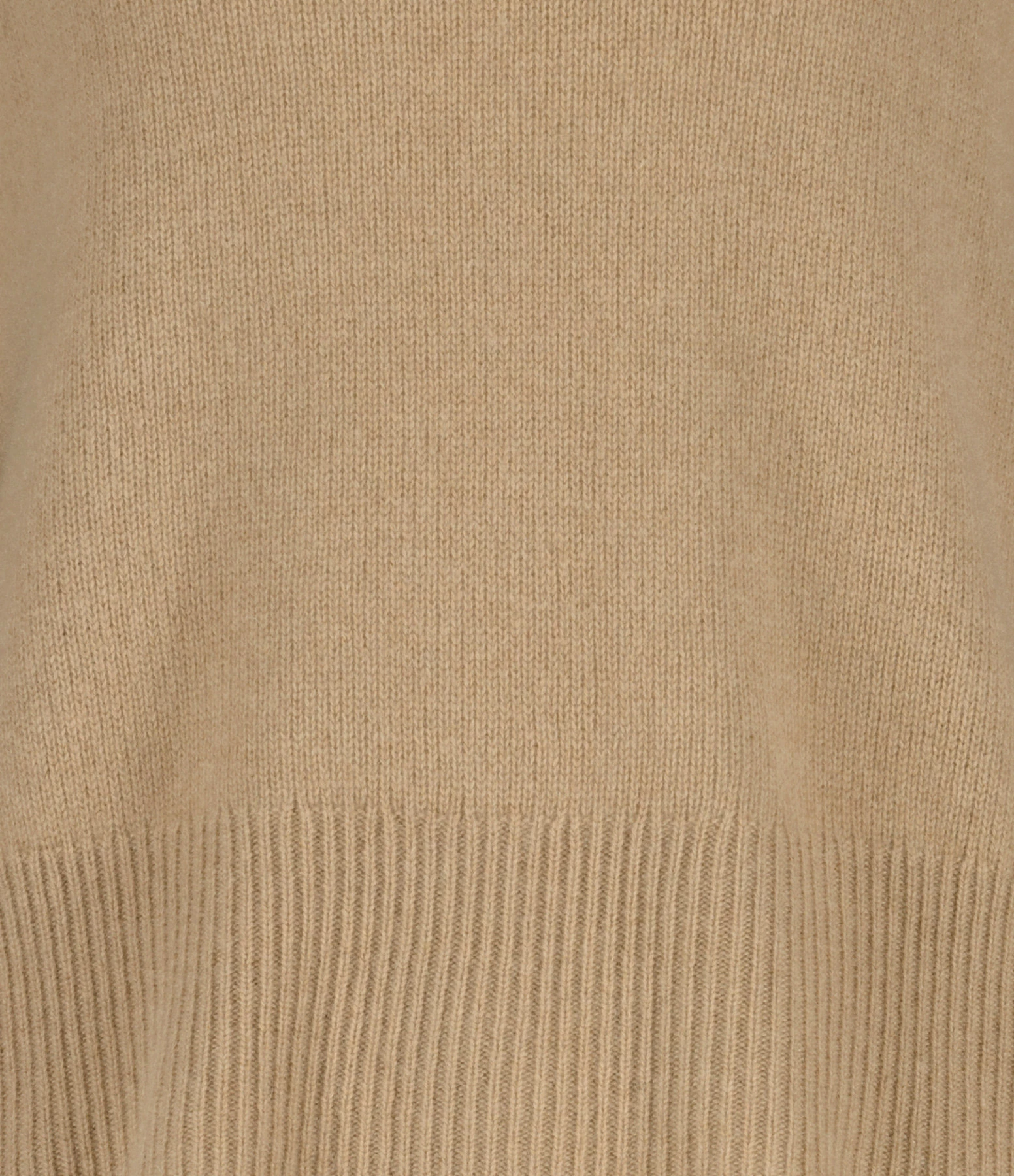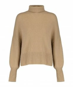 Pull en cachemire camel. Col montant côtelé. Manches longues avec longs poignets côtelés. Coupe droite large. Base droite côtelée.
