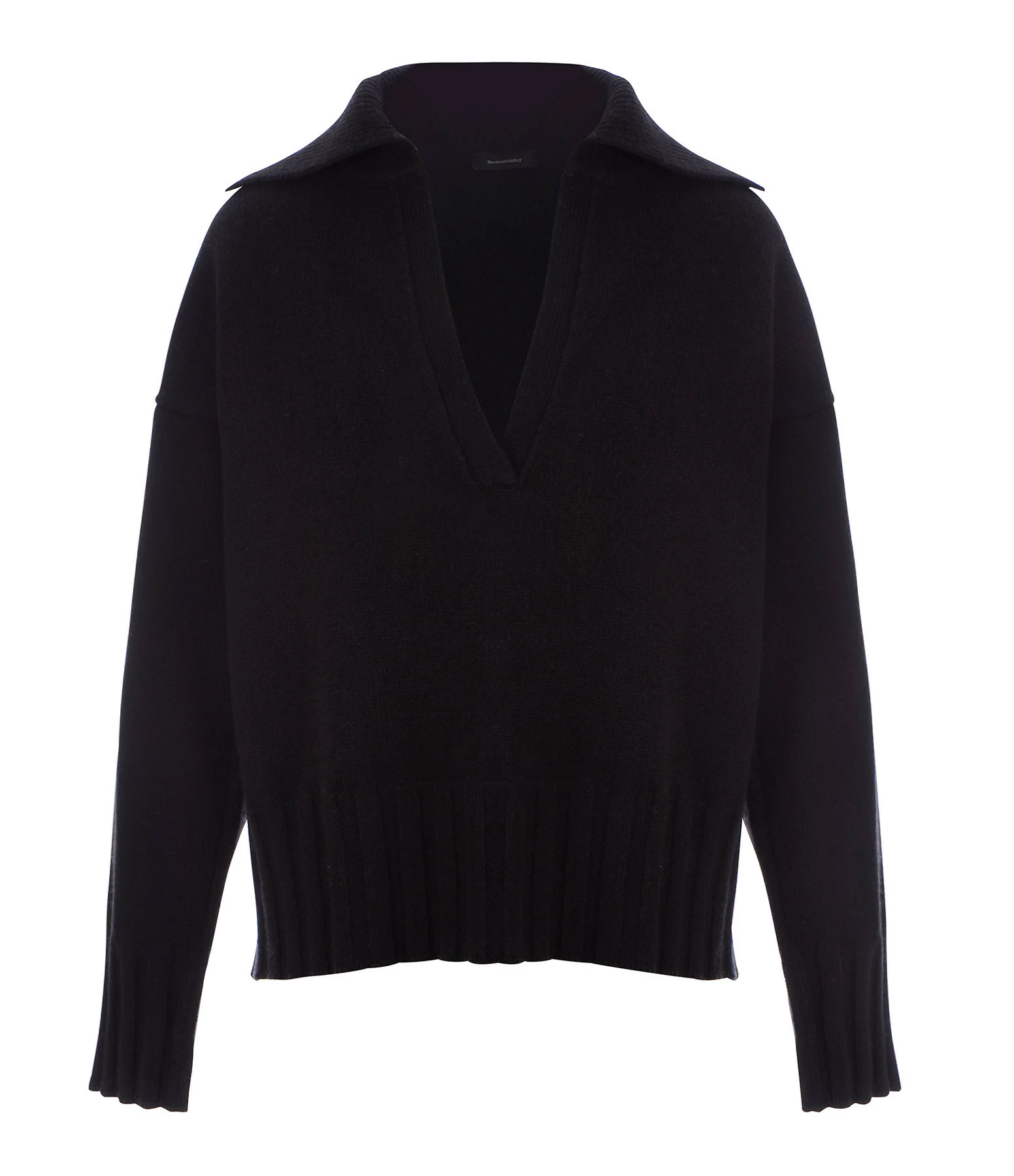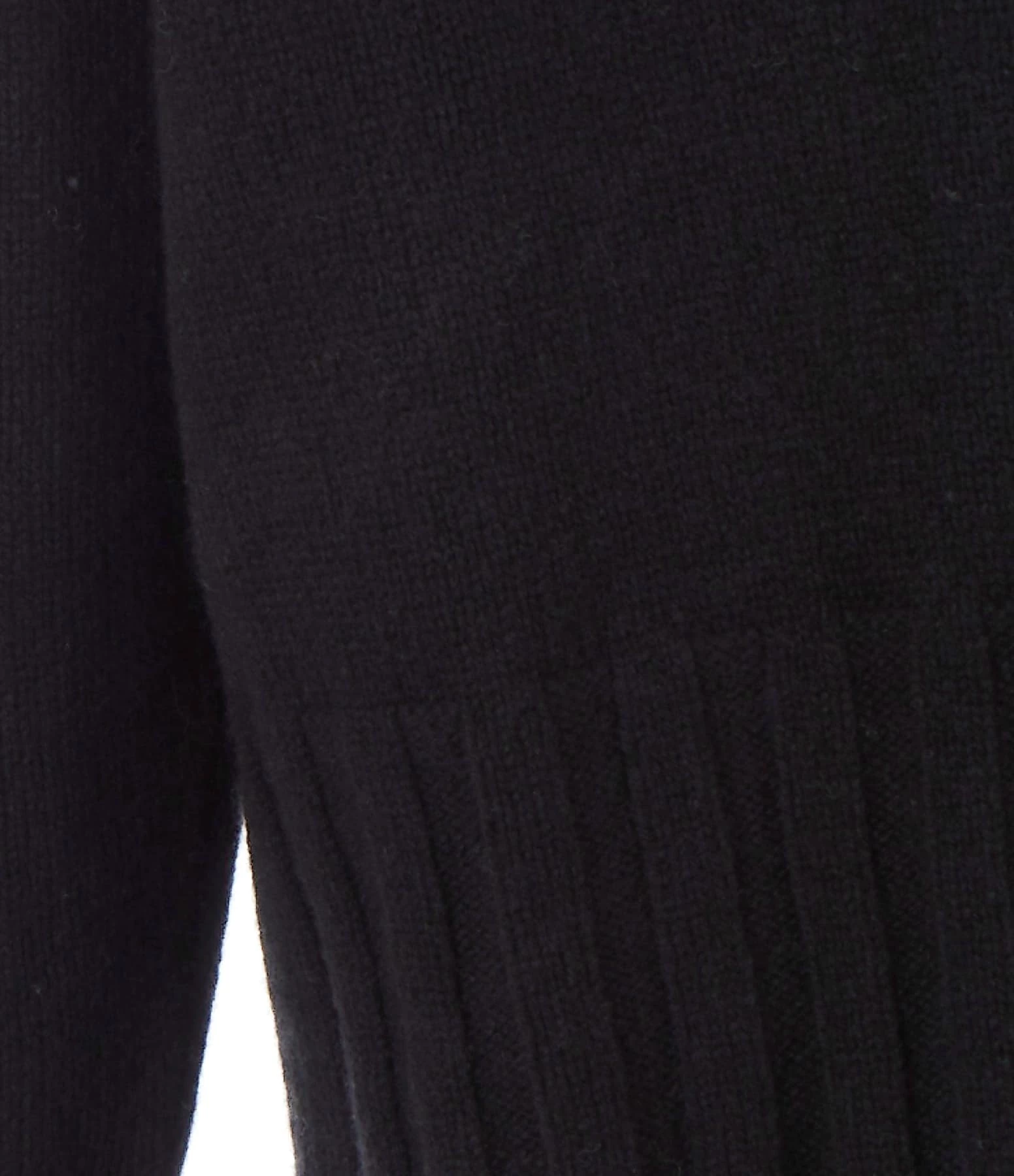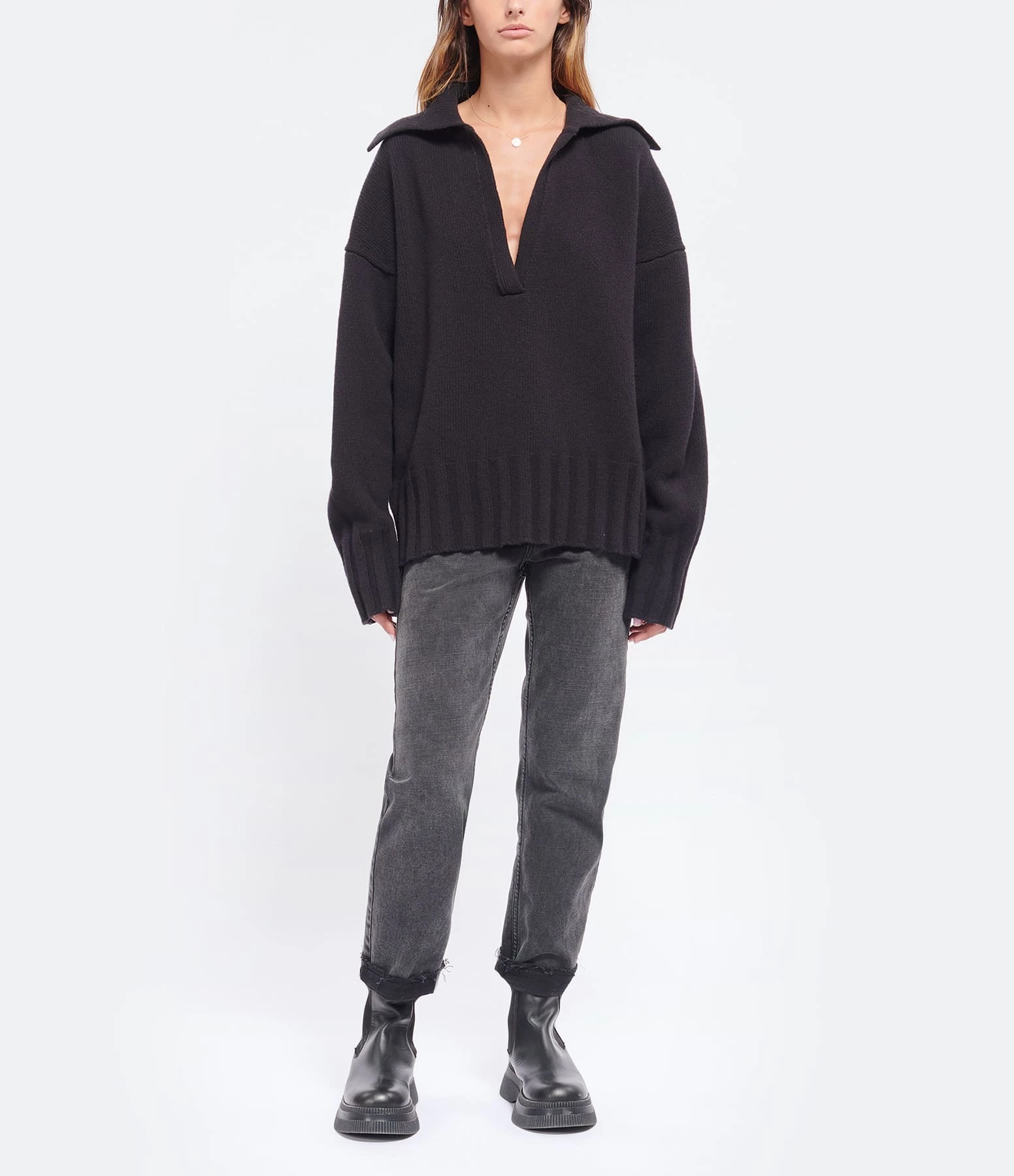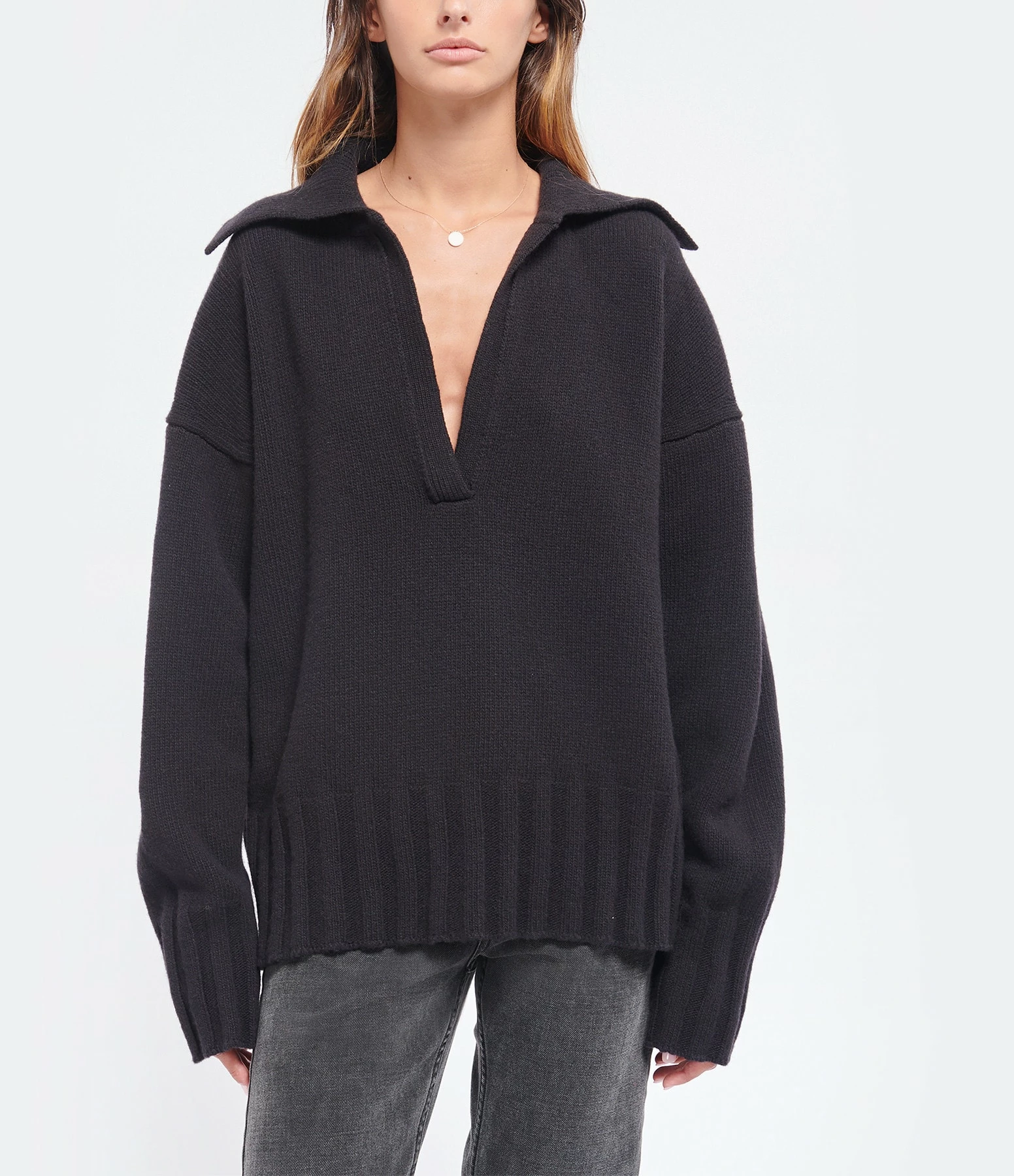 Pull noir en laine. Col en V à revers. Manches longues avec poignets côtelés. Coupe droite. Base droite côtelée.