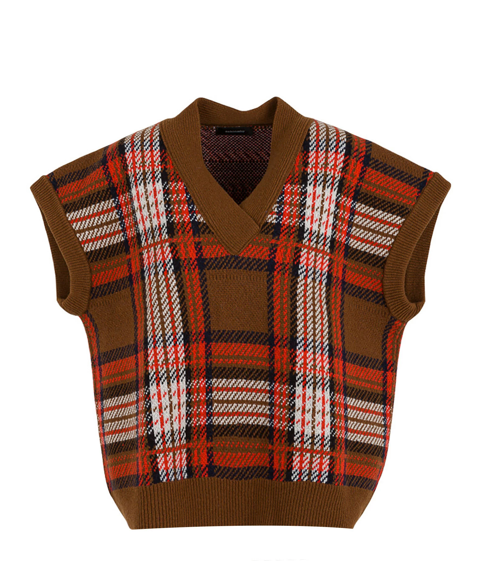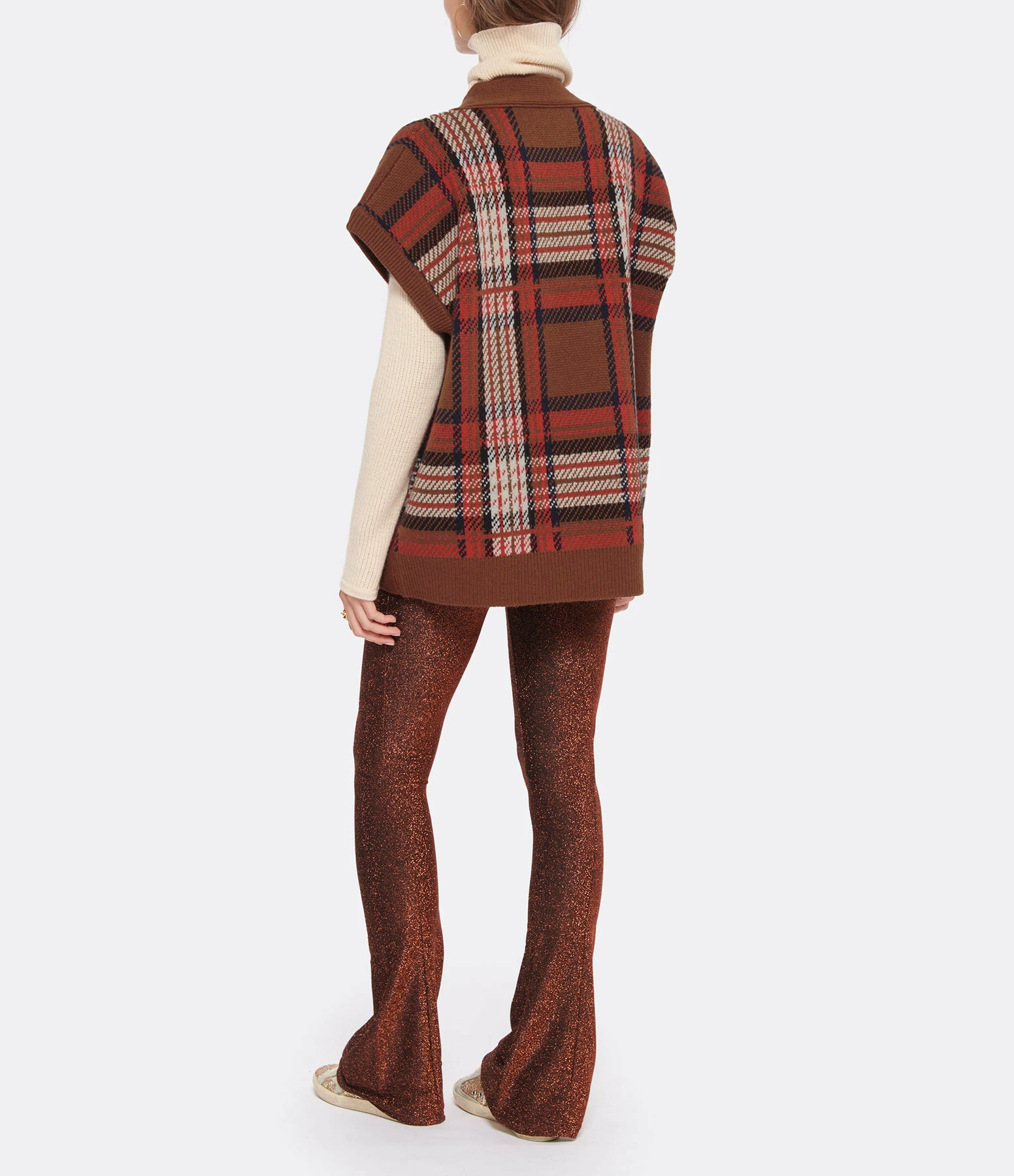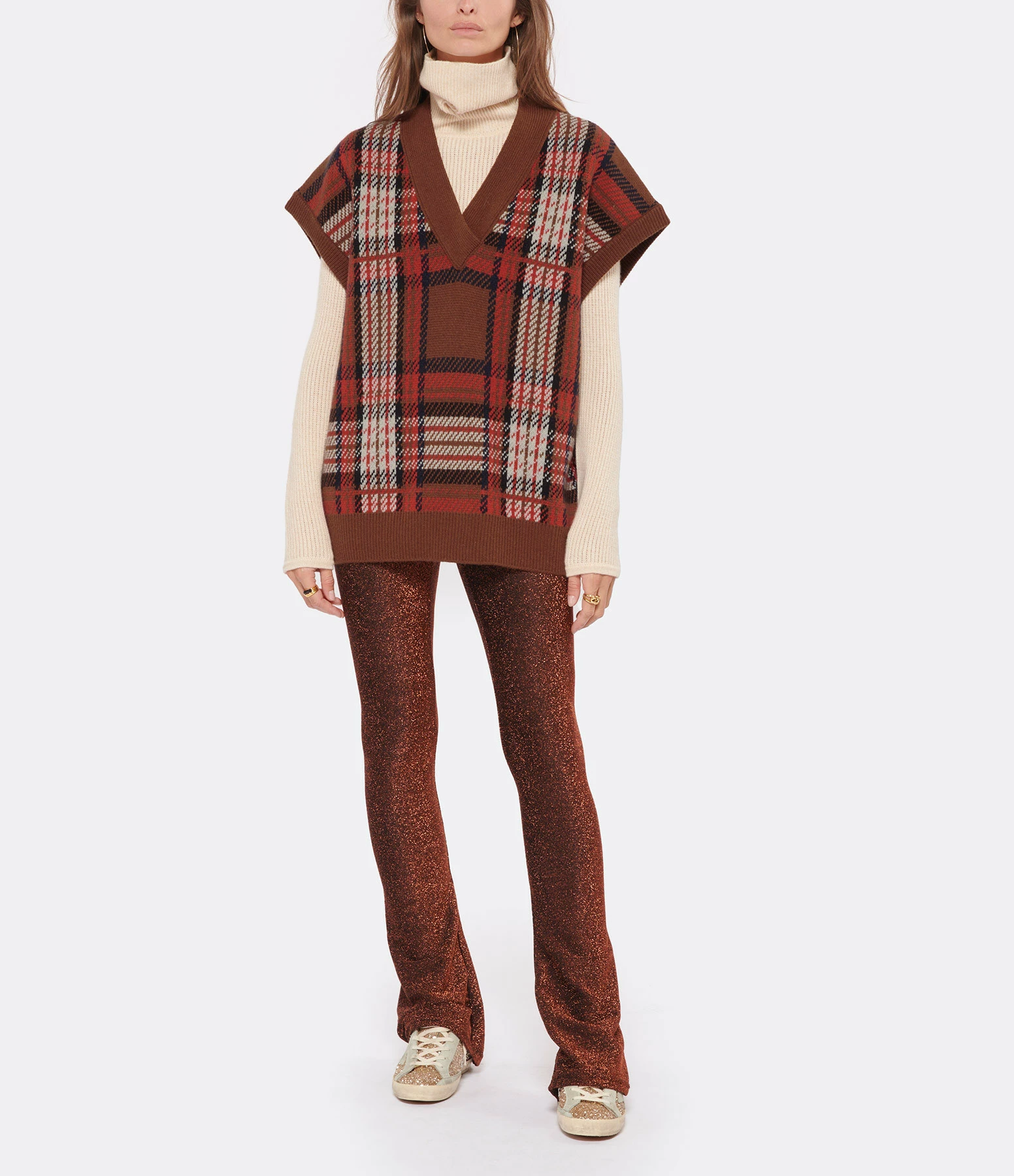Pull en laine vierge rayé à carreaux multicolore. Col V côtelée. Sans manches. Coupe droite. Base droite côtelée.