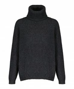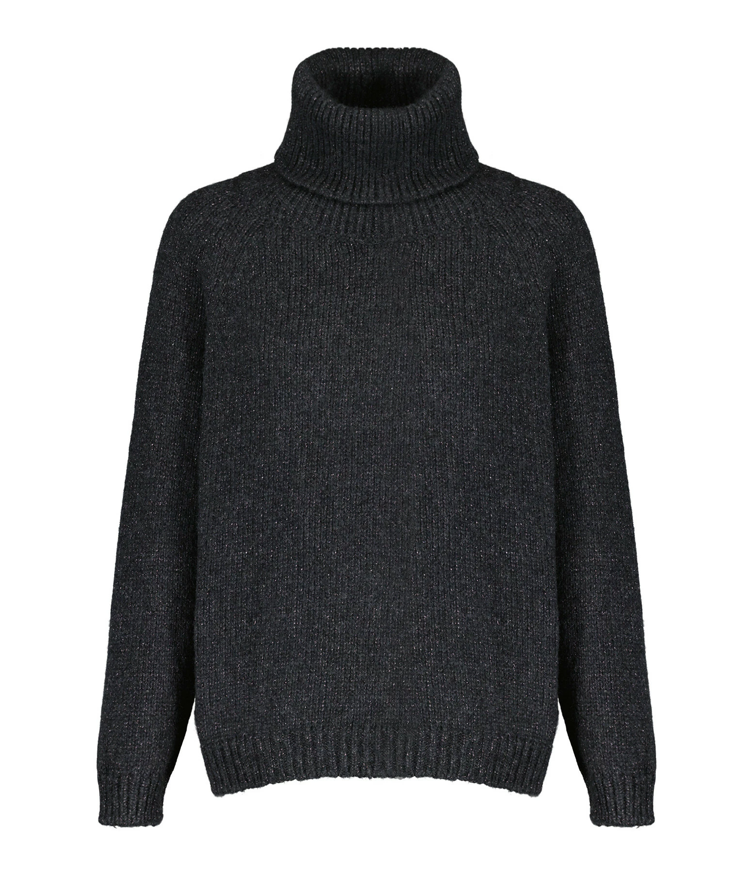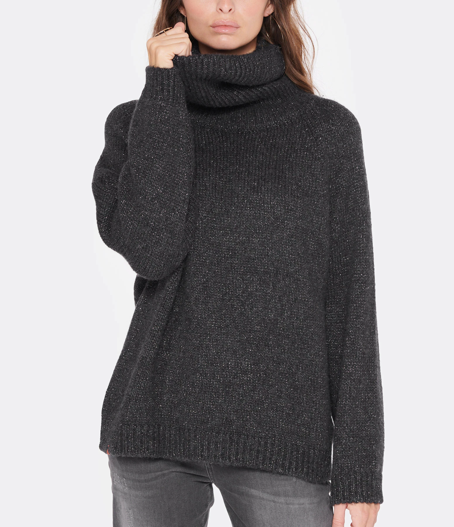 Pull en maille de laine mélangée noir réhaussée de fils métallisés argentés. Col roulé ,côtelé. Manches longues raglan avec poignes côtelés. Coupe ample. Base droite côtelée.