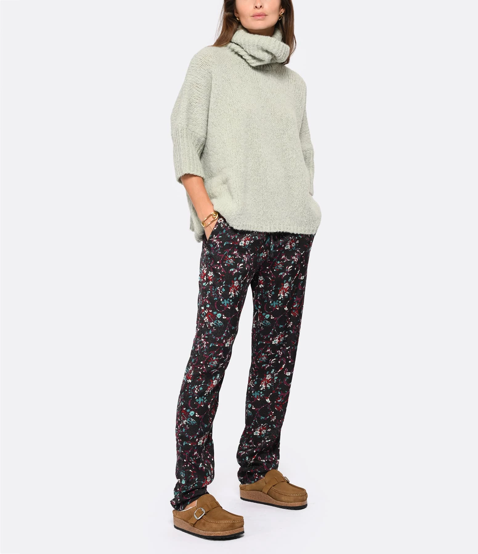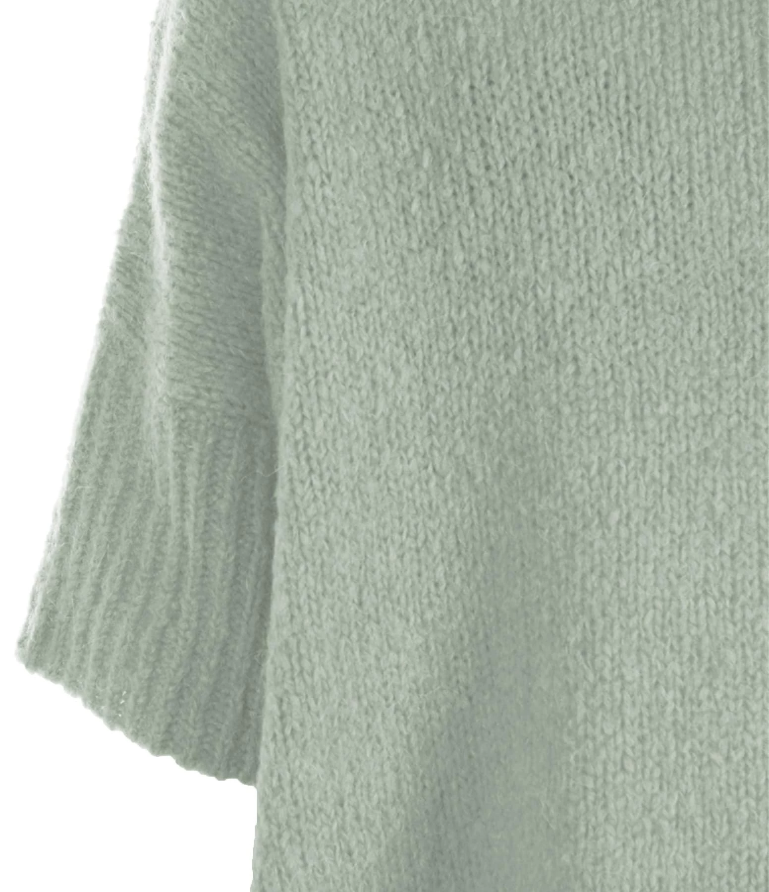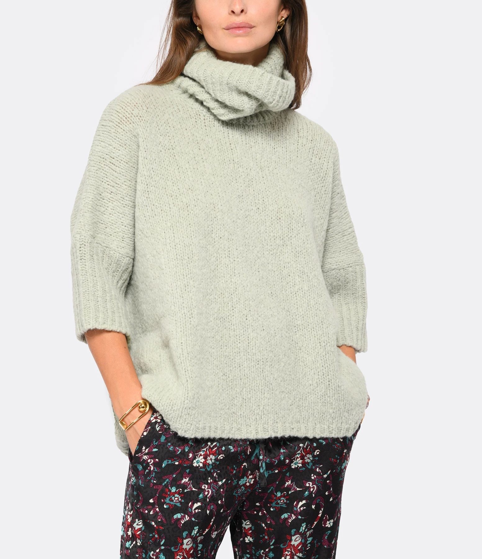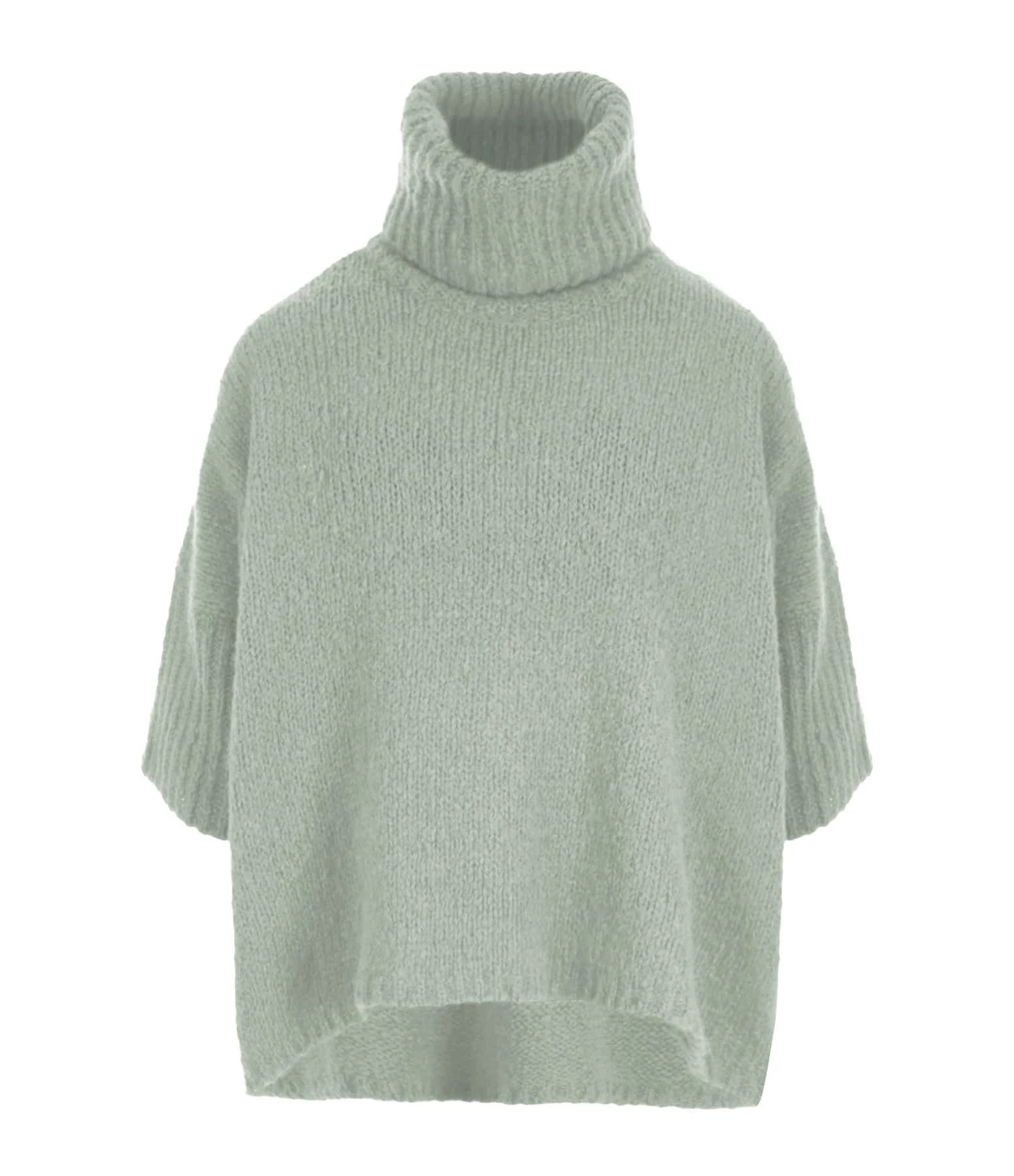 Pull col roulé en alpaga et laine vert d’eau. Manches 3/4. Coupe droite ample. Base arrondie.