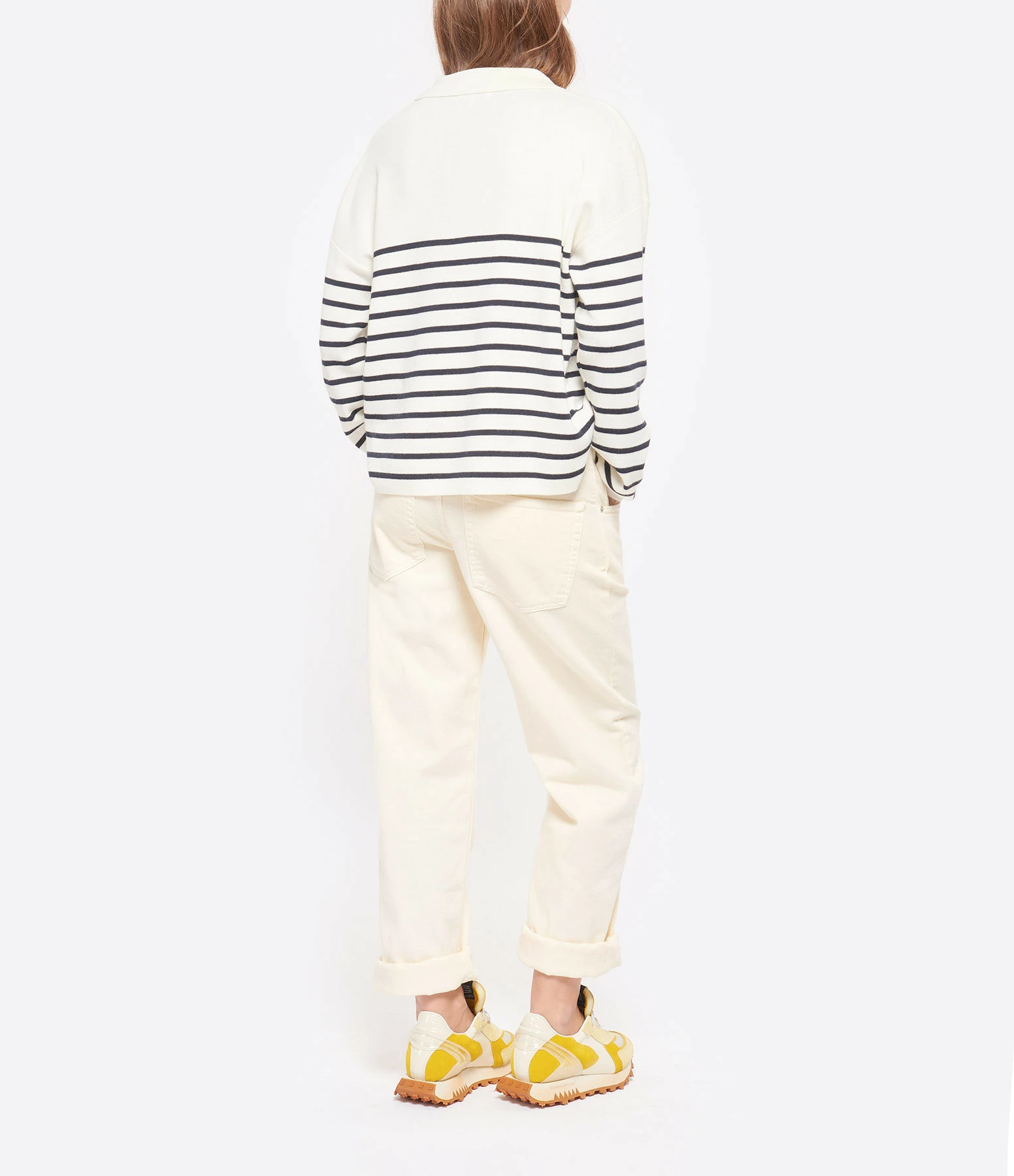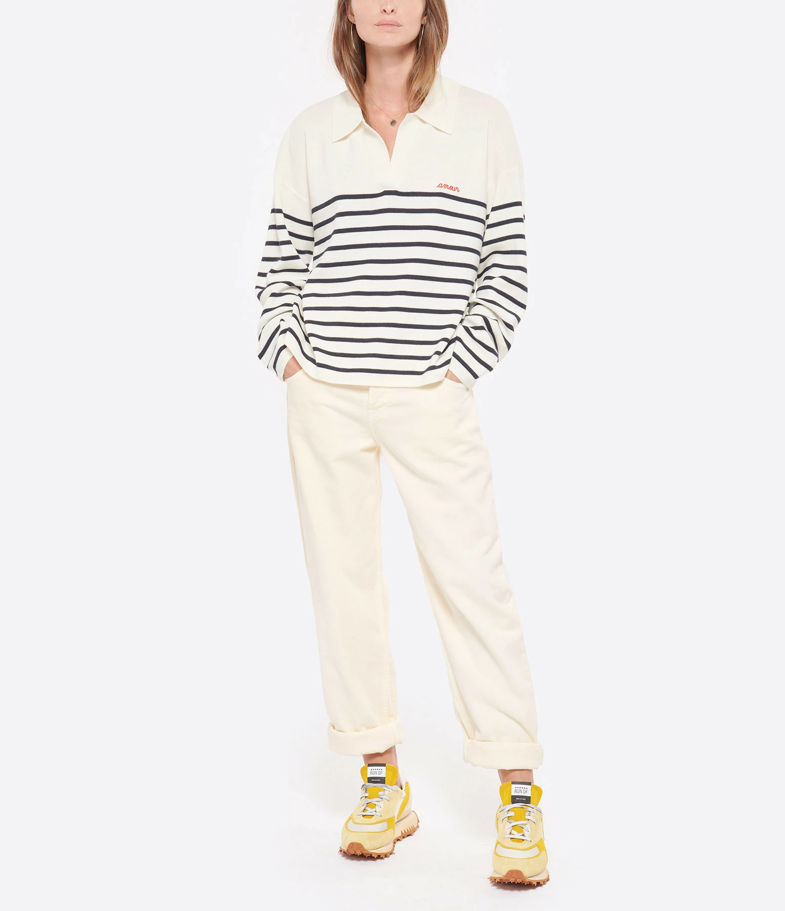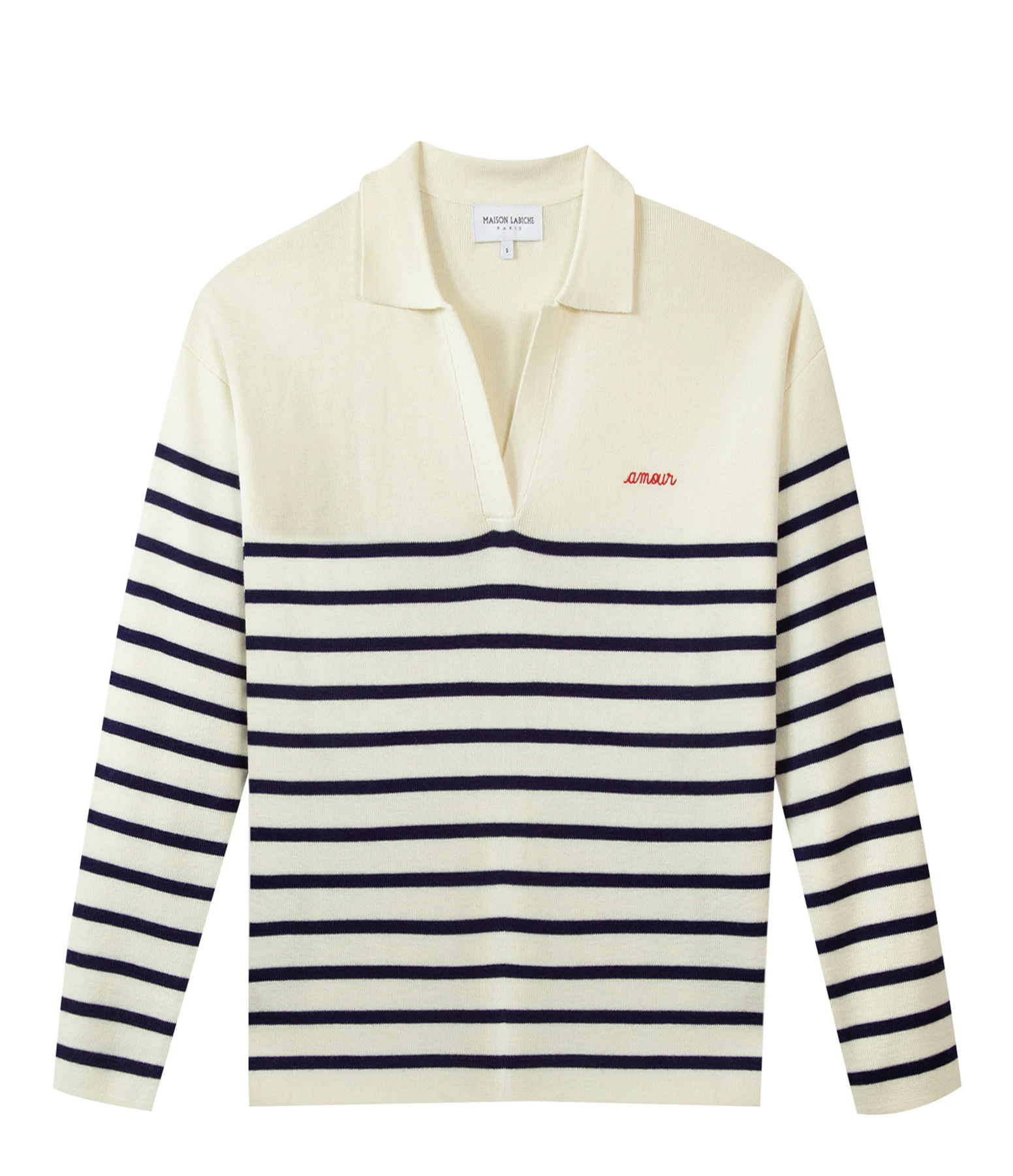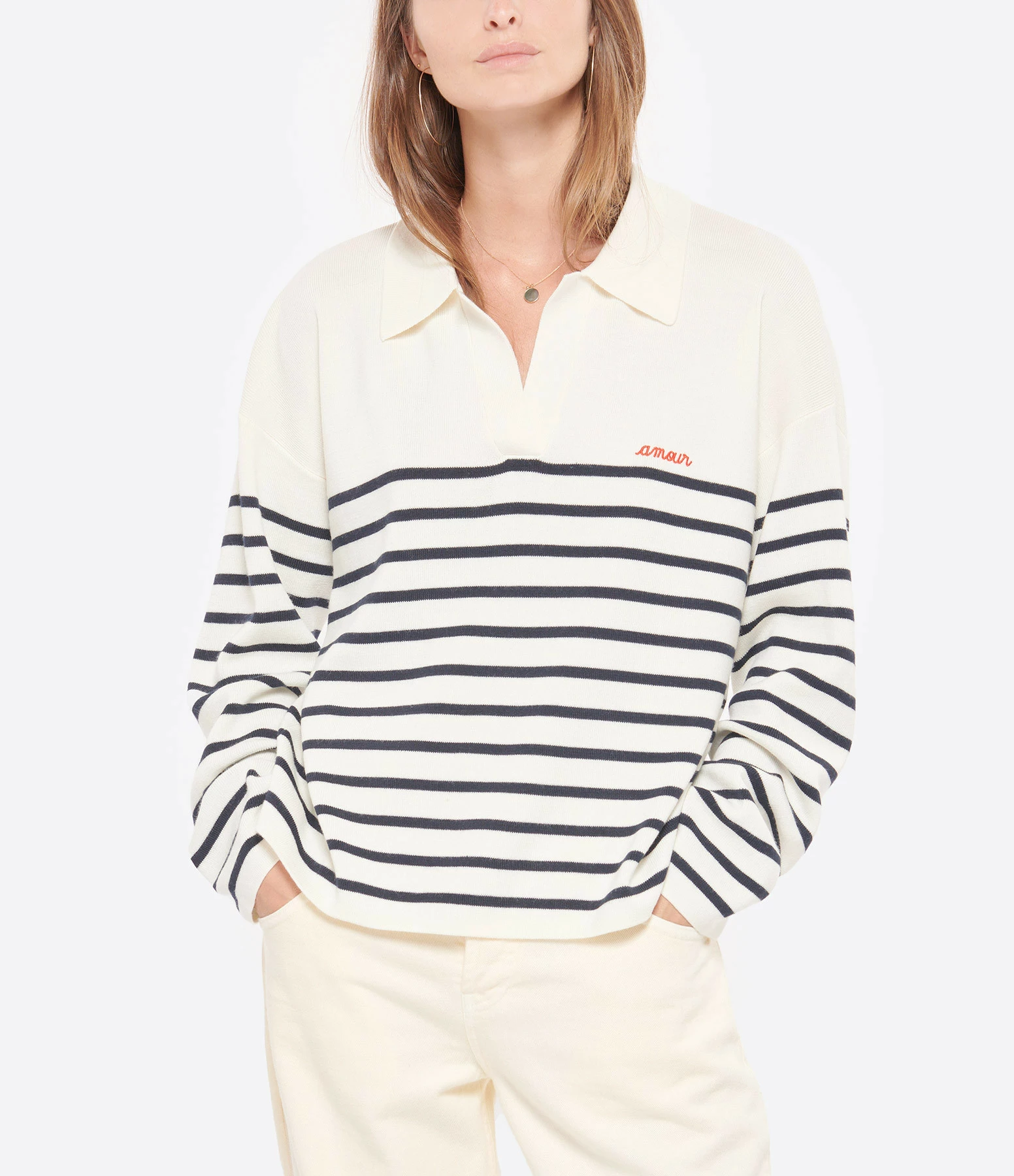 Pull en laine mélangée écru à rayures bleues foncées. Détail inscription “amour” brodée en rouge. Encolure polo. Manches longues. Fentes latérales. Coupe droite. Base droite. Non doublée.