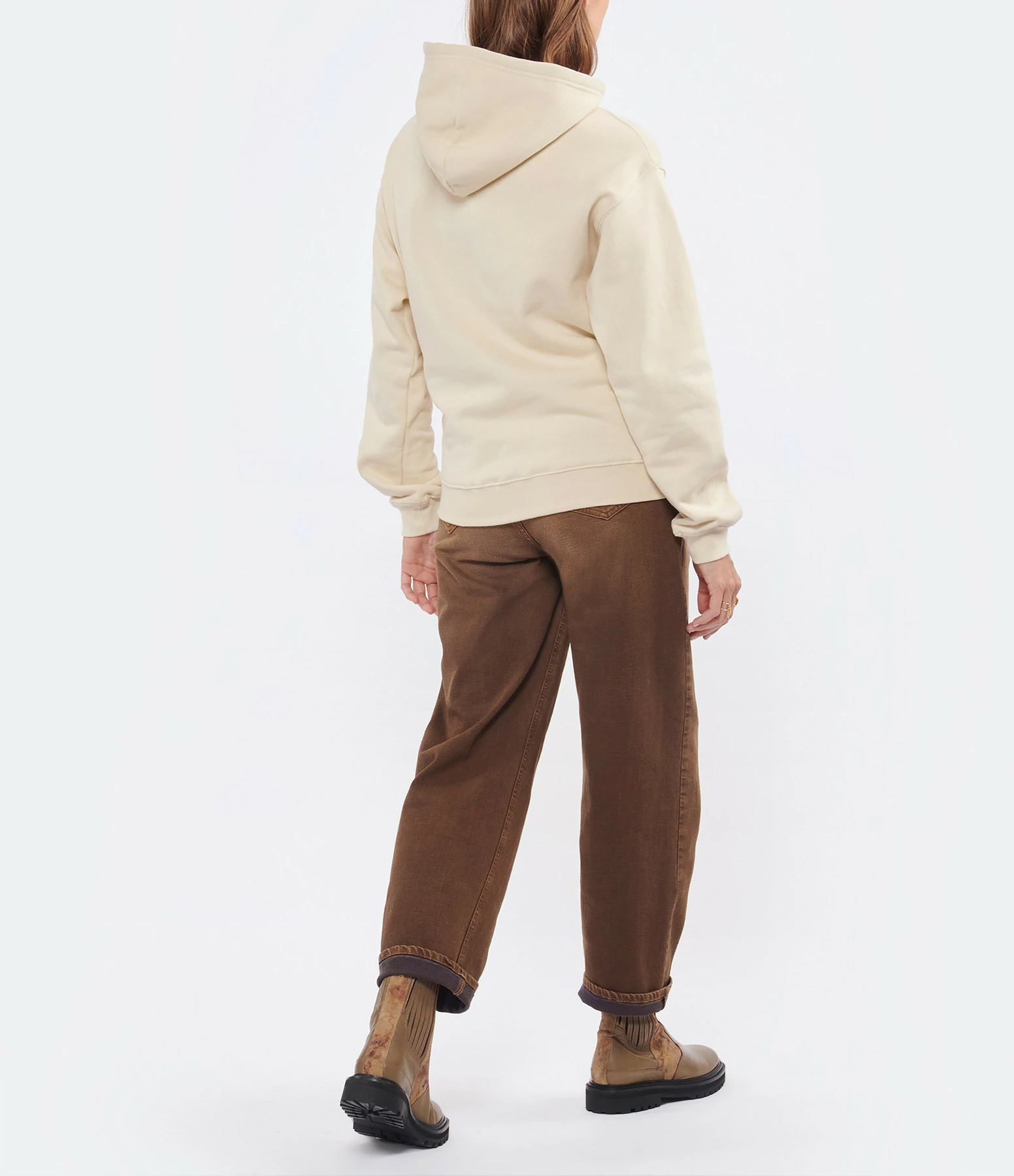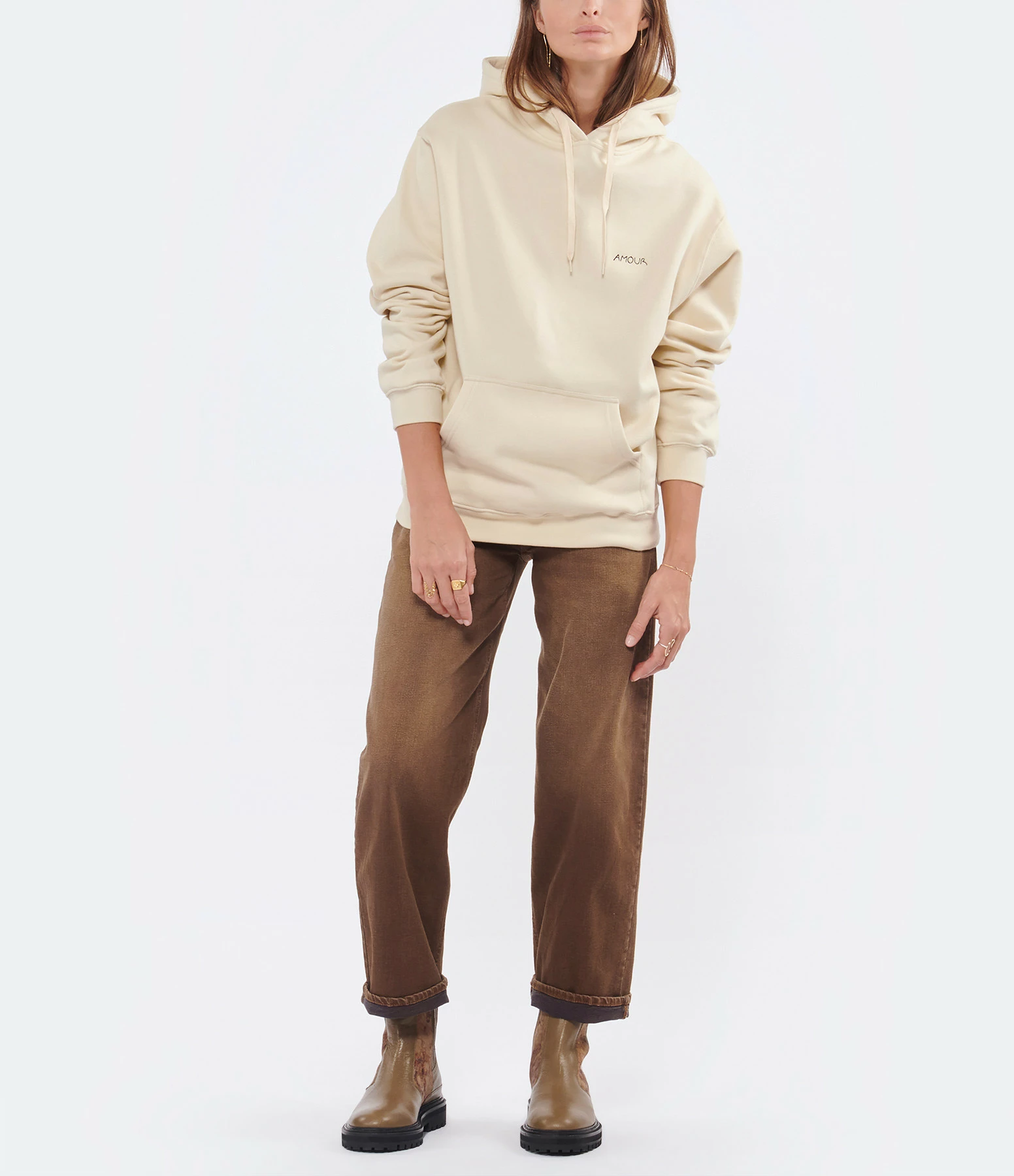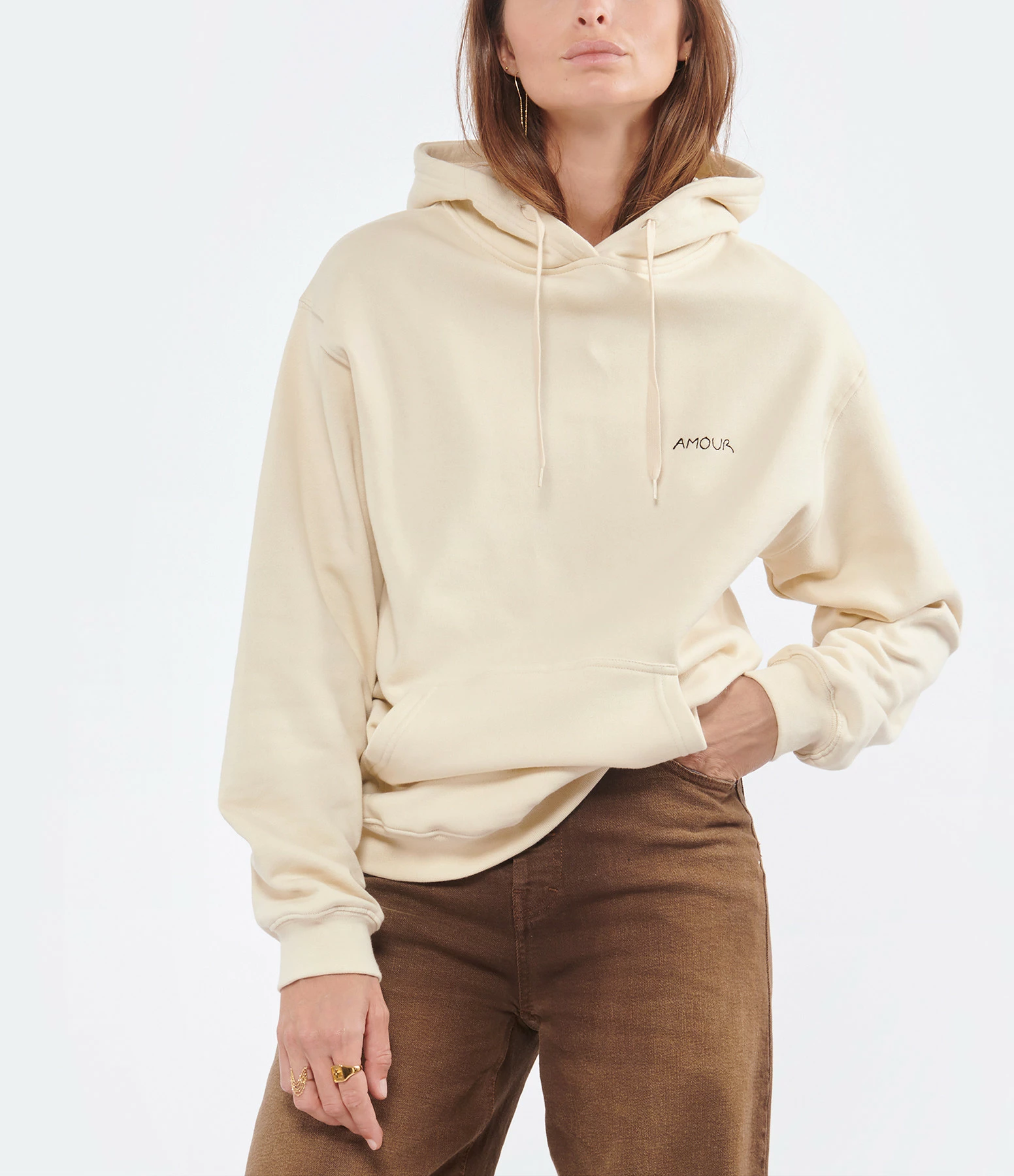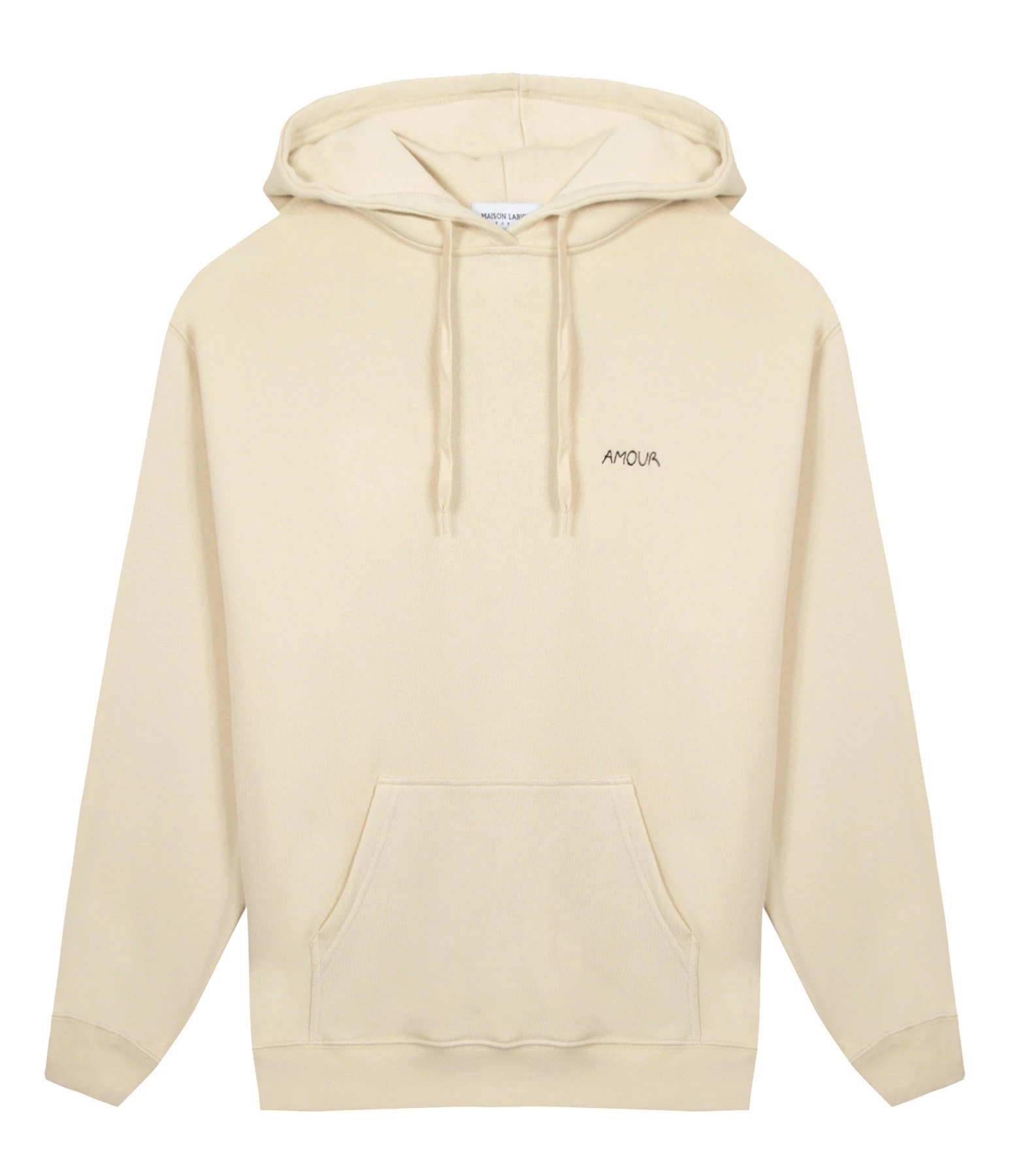 Sweatshirt en coton molletonné beige. Inscription poitrine “AMOUR” brodée en noir. Col à capuche avec cordons de serrage. Manches longues avec poignets côtelés. Poche kangourou sur le devant. Coupe droite ample. Base droite côtelée.