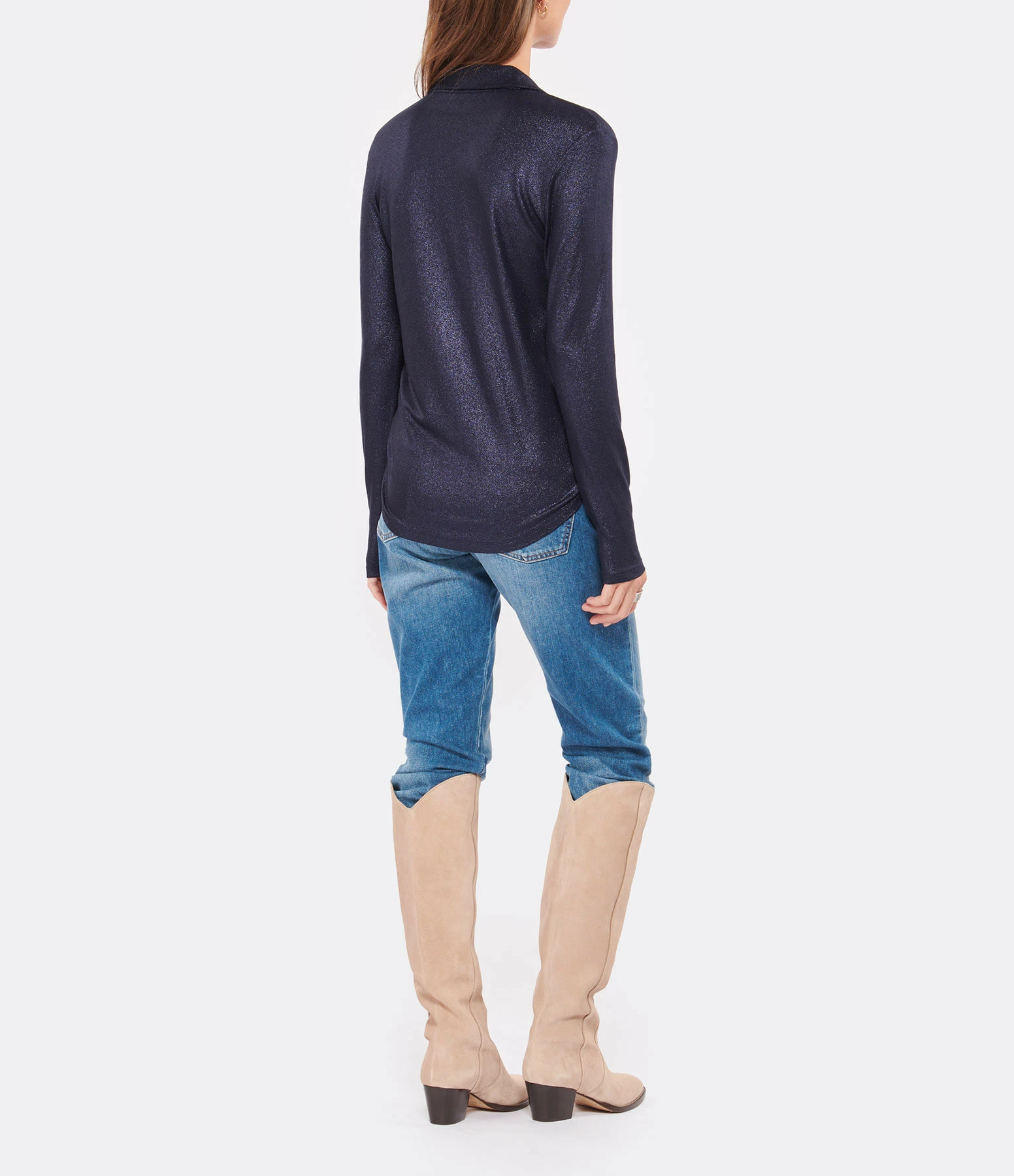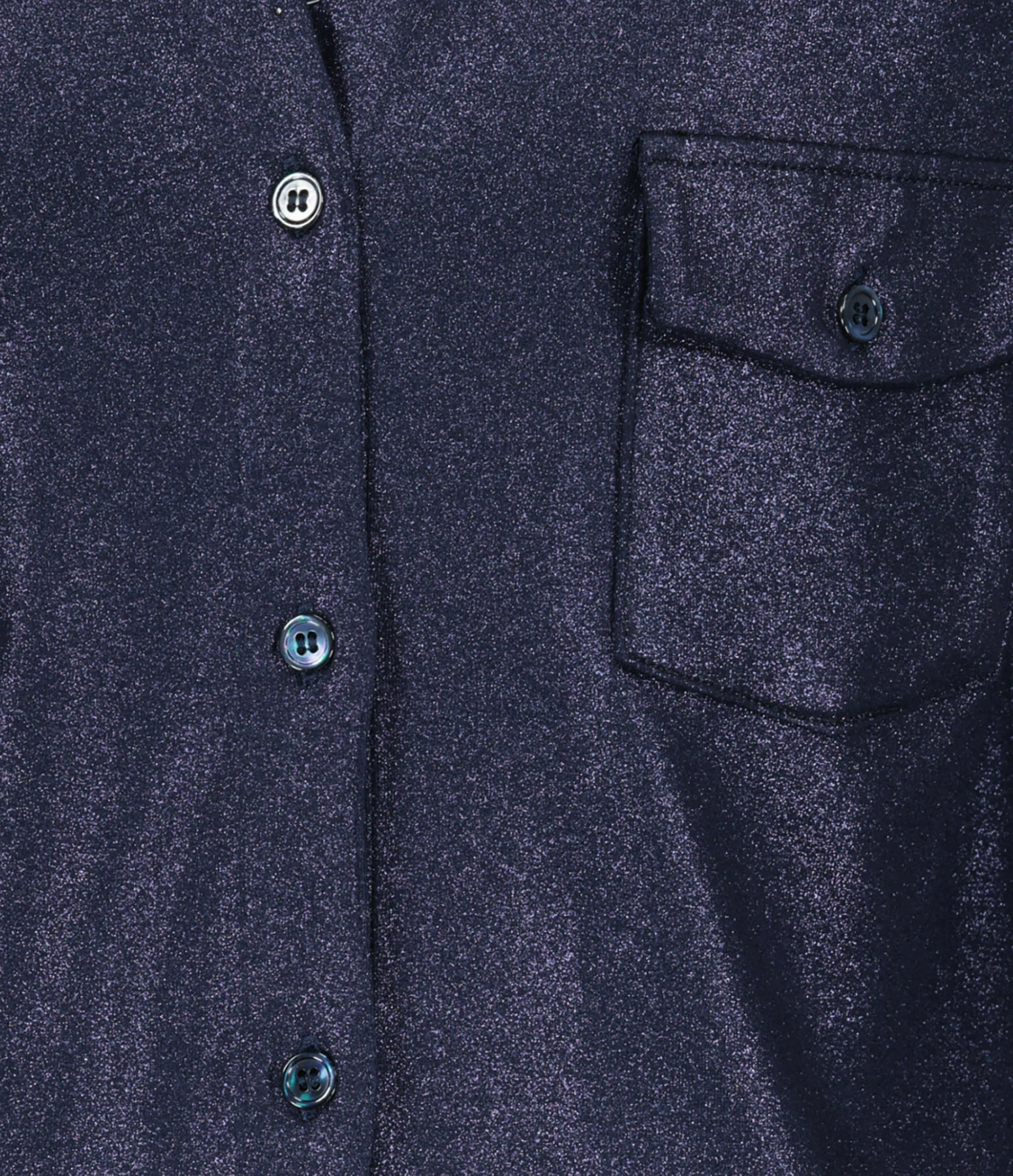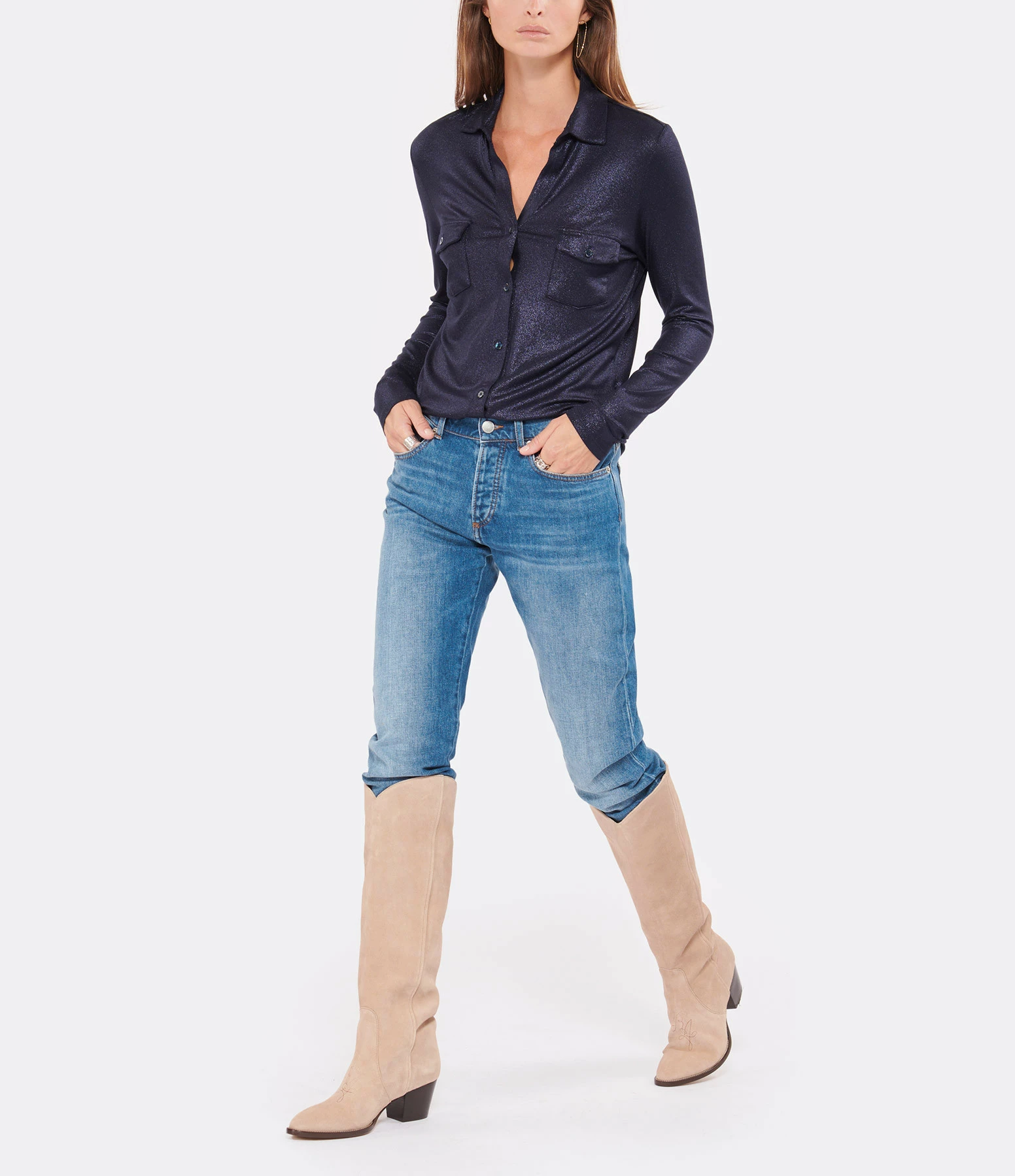 Chemise fluide bleue métallisée. Col chemisier. Manches longues. Fermeture par boutons. Deux poches à rabats fermées par boutons au niveau de la poitrine. Coupe droite et base arrondie. Non doublée.